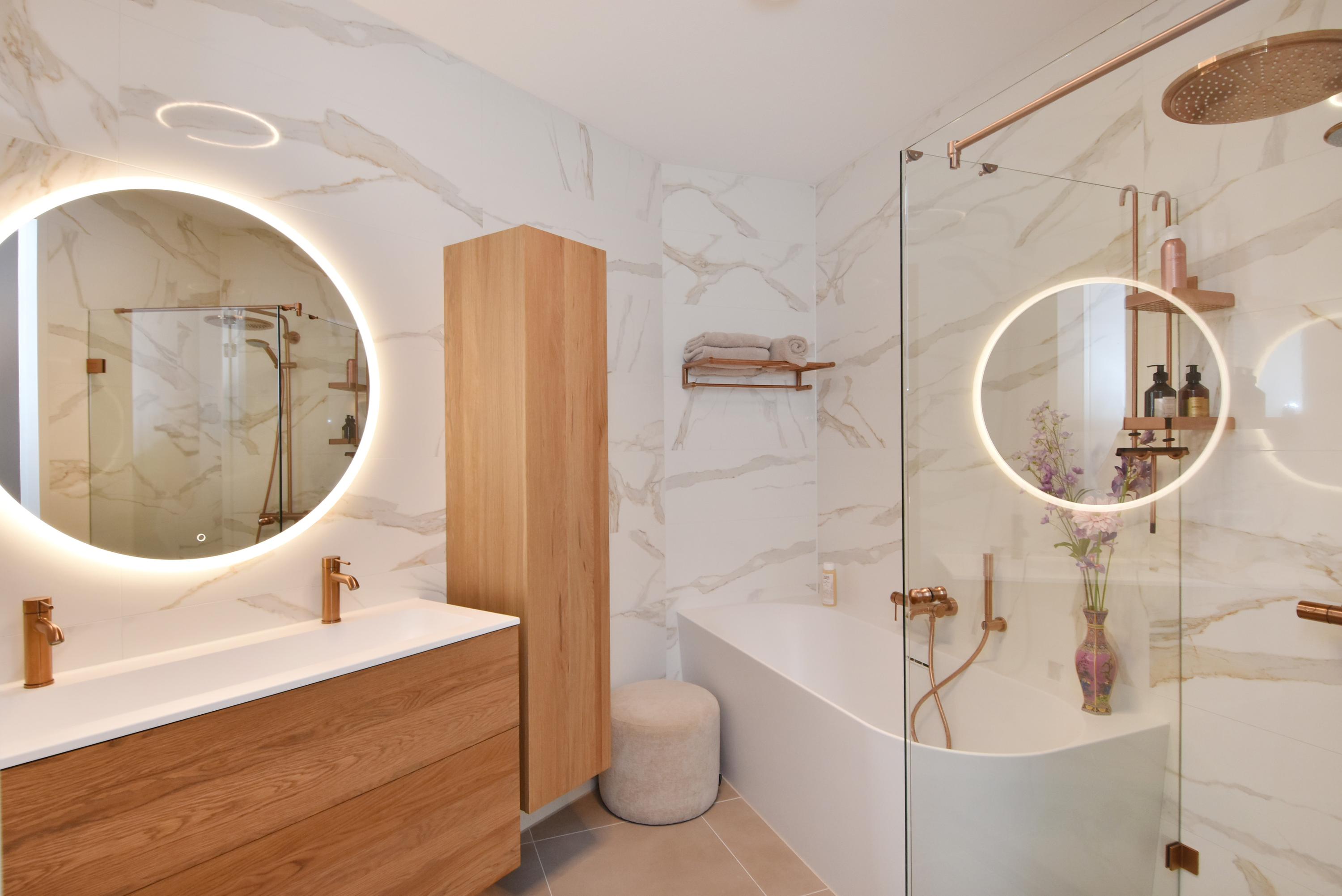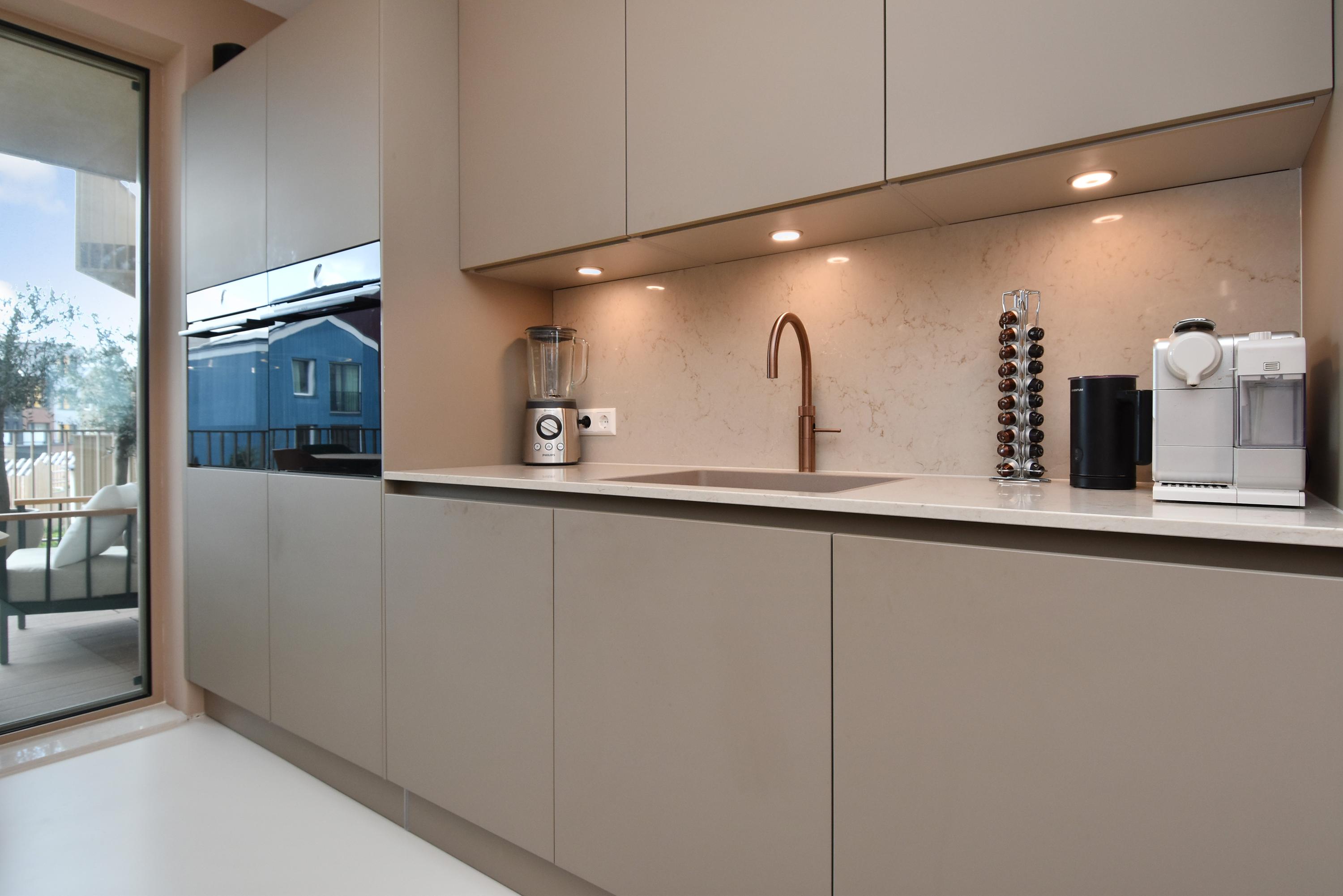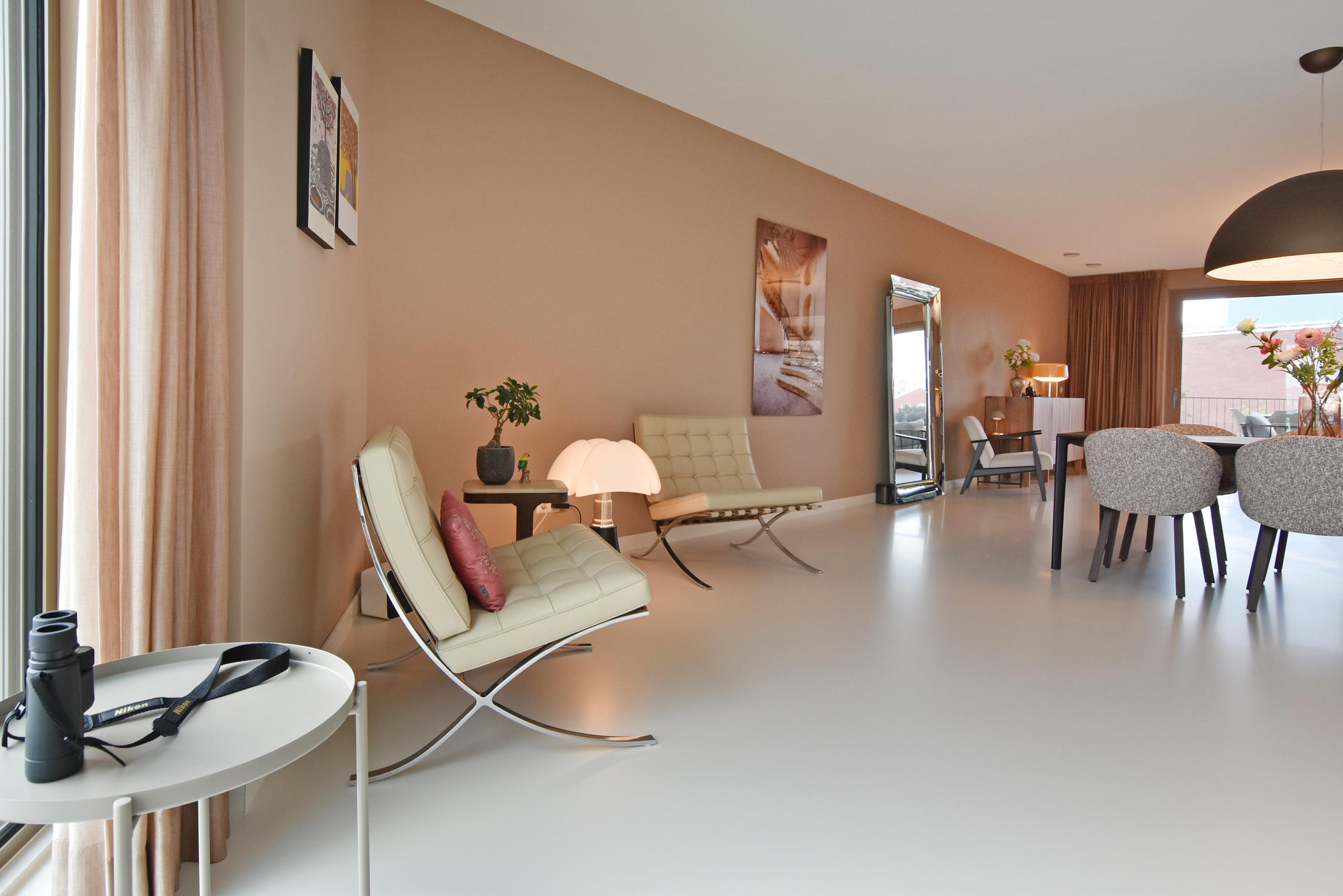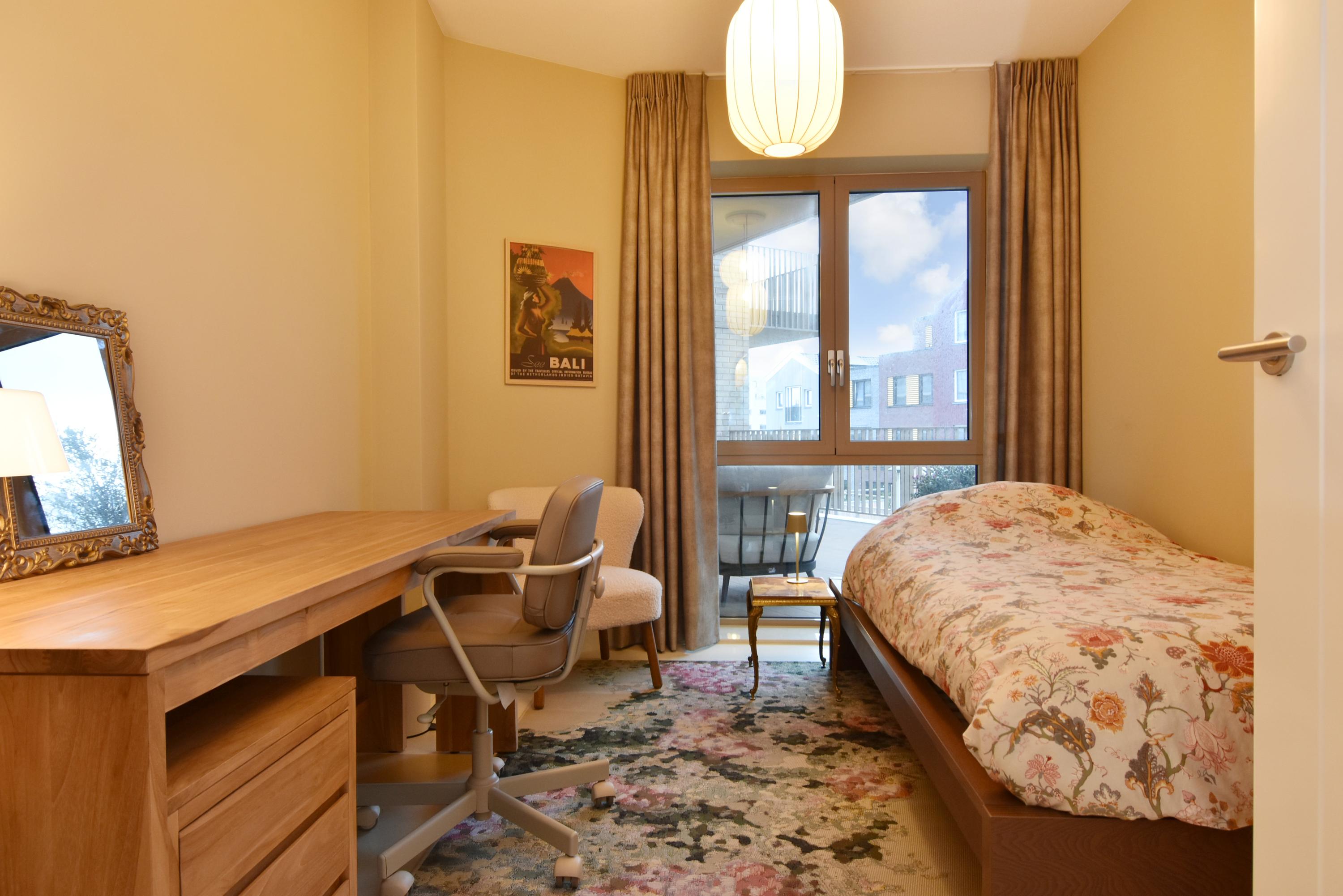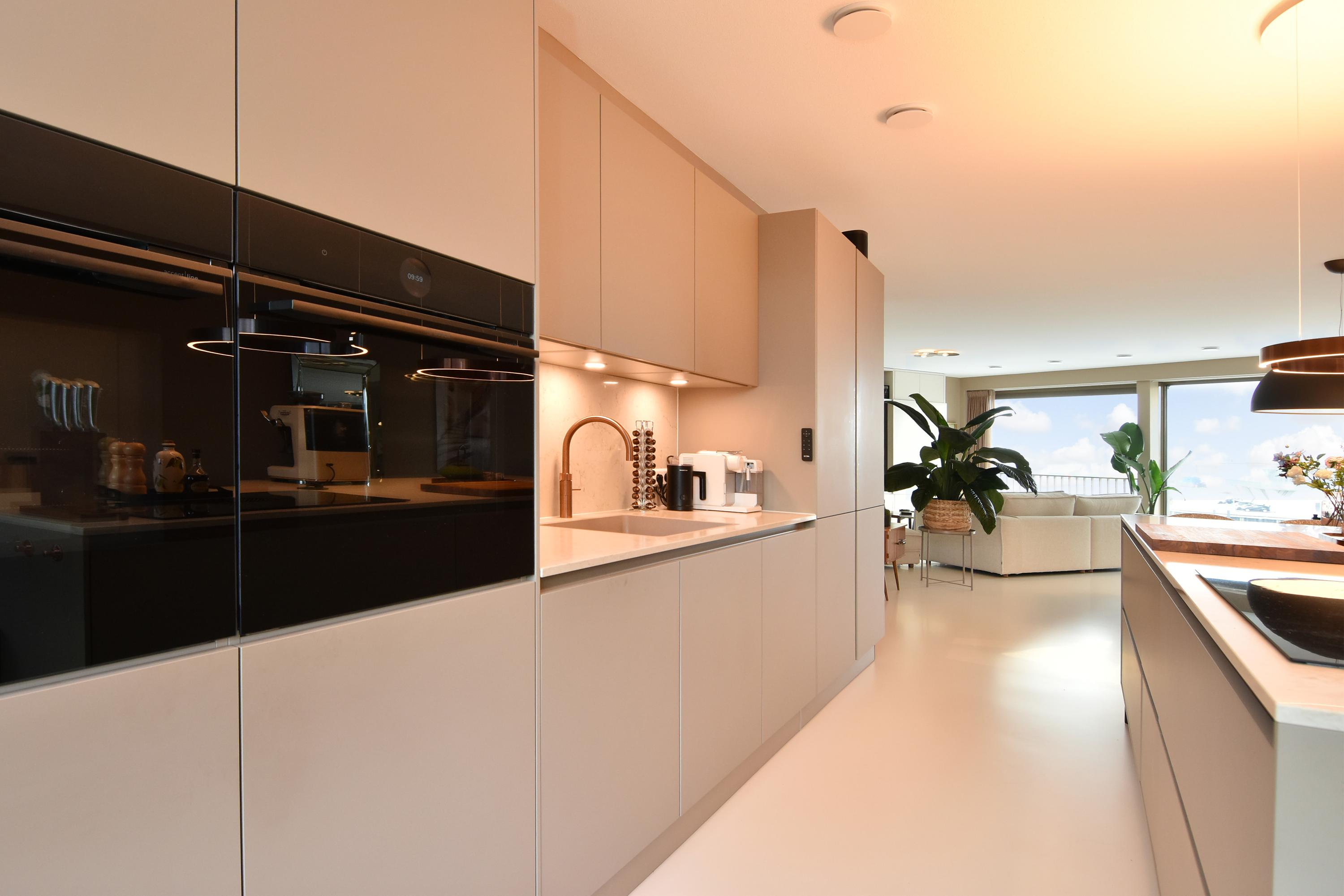 At the front is the seating area with a stylish custom-made wall unit featuring a closable workspace. At the rear you’ll find the designer kitchen with cooking island and every imaginable luxury built-in appliance, including an induction hob with integrated extractor, Quooker, dishwasher, combi-oven, spacious refrigerator, and separate freezer. From the kitchen, the large sliding doors open onto the generous balcony, where you can peacefully enjoy the afternoon and evening sun.