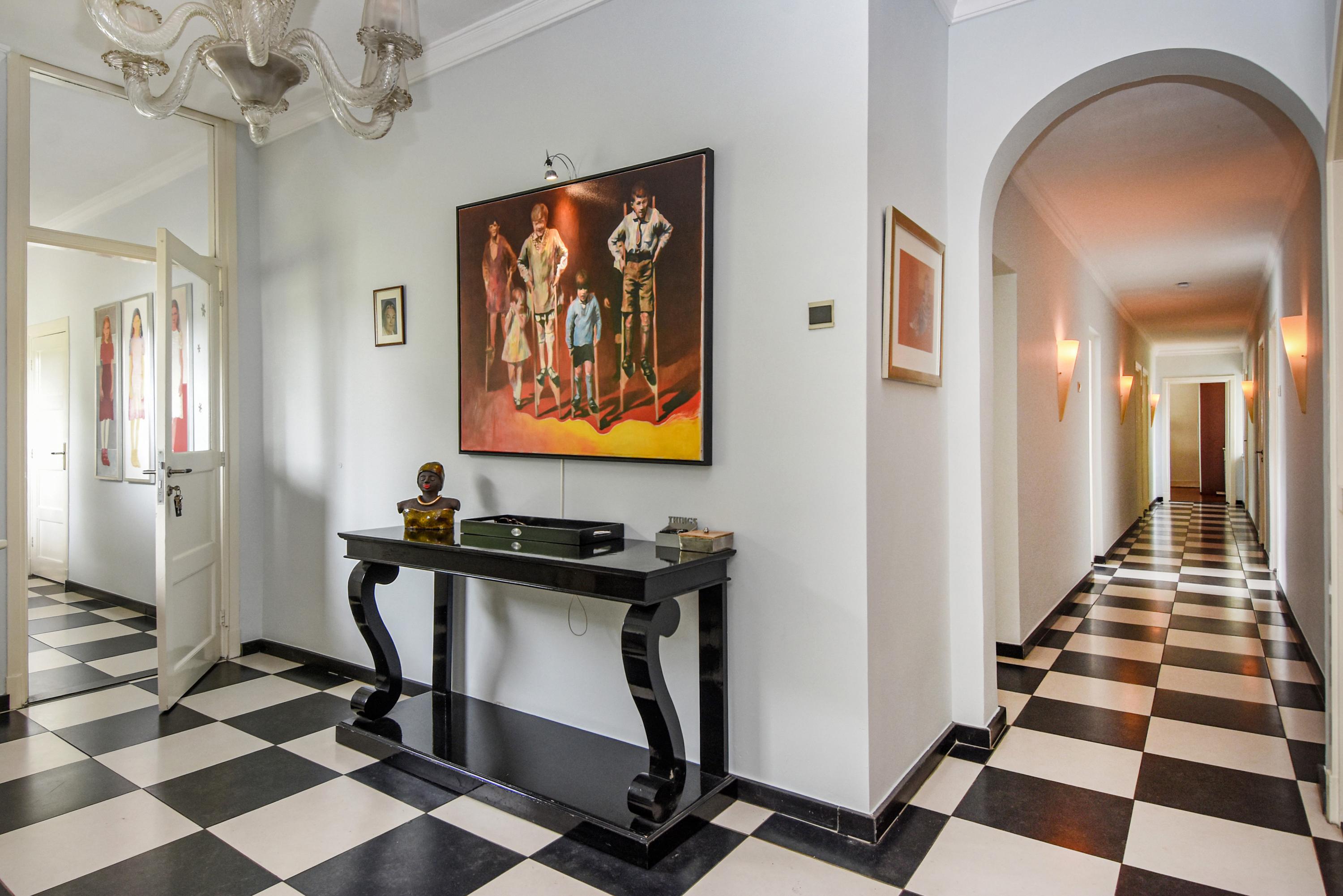 The gracious layout flows from a charming vestibule with black-and-white tiles into a bright hall finished in marble, leading towards the heart of the residence. Light-filled living and dining rooms feature classic herringbone parquet, while French doors open to terraces and landscaped gardens that offer diverse settings for relaxation throughout the day. The kitchen, generous in size and punctuated by a skylight, is equipped with integrated appliances and ample storage.