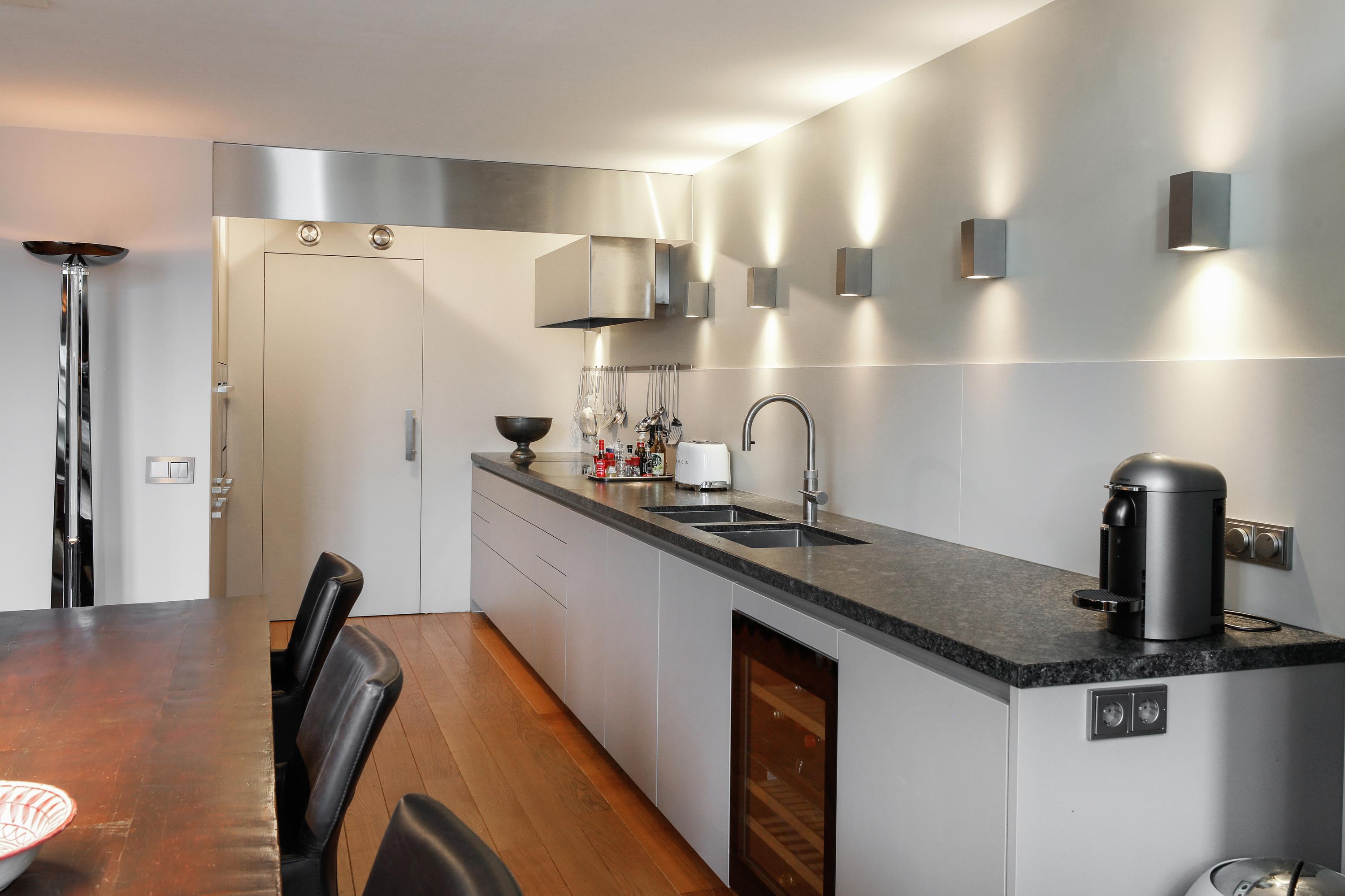 Don't be misled by the understated style of this kitchen. Poggenpohl created thoughtful, high-quality custom work tailored to the owner's wishes. This exceptionally practical and functional kitchen has everything you need to make a culinary splash. Behind the sleek design, you'll find a dishwasher, refrigerator, freezer, induction cooktop, extractor hood, combination grill oven, oven, microwave, plate warmer, and wine cooler. There's an anti-reflective natural stone countertop, good lighting, and ample storage space. Even more space can be found in the utility room, which houses the washing machine connections, central heating boiler, and water softener.