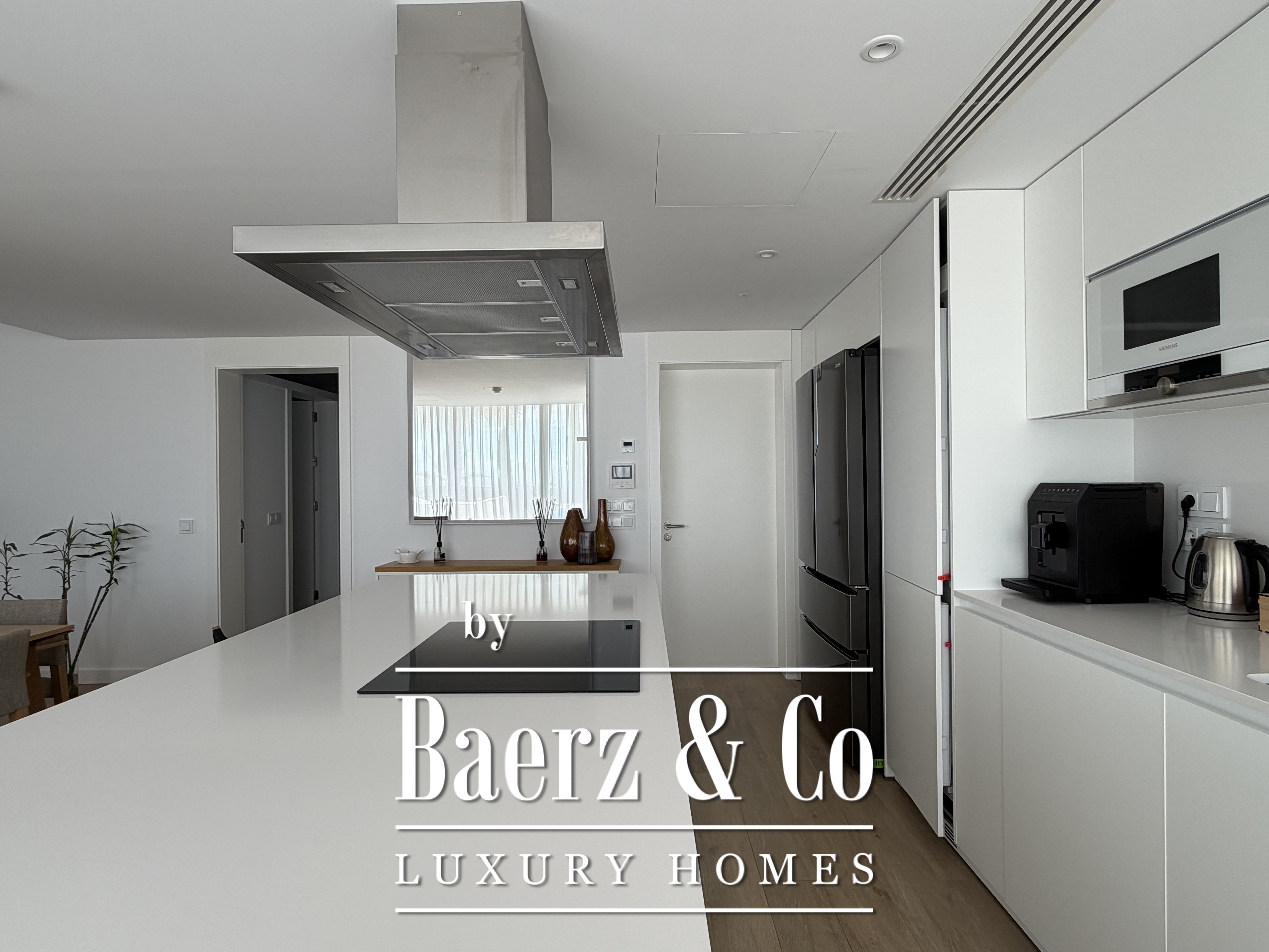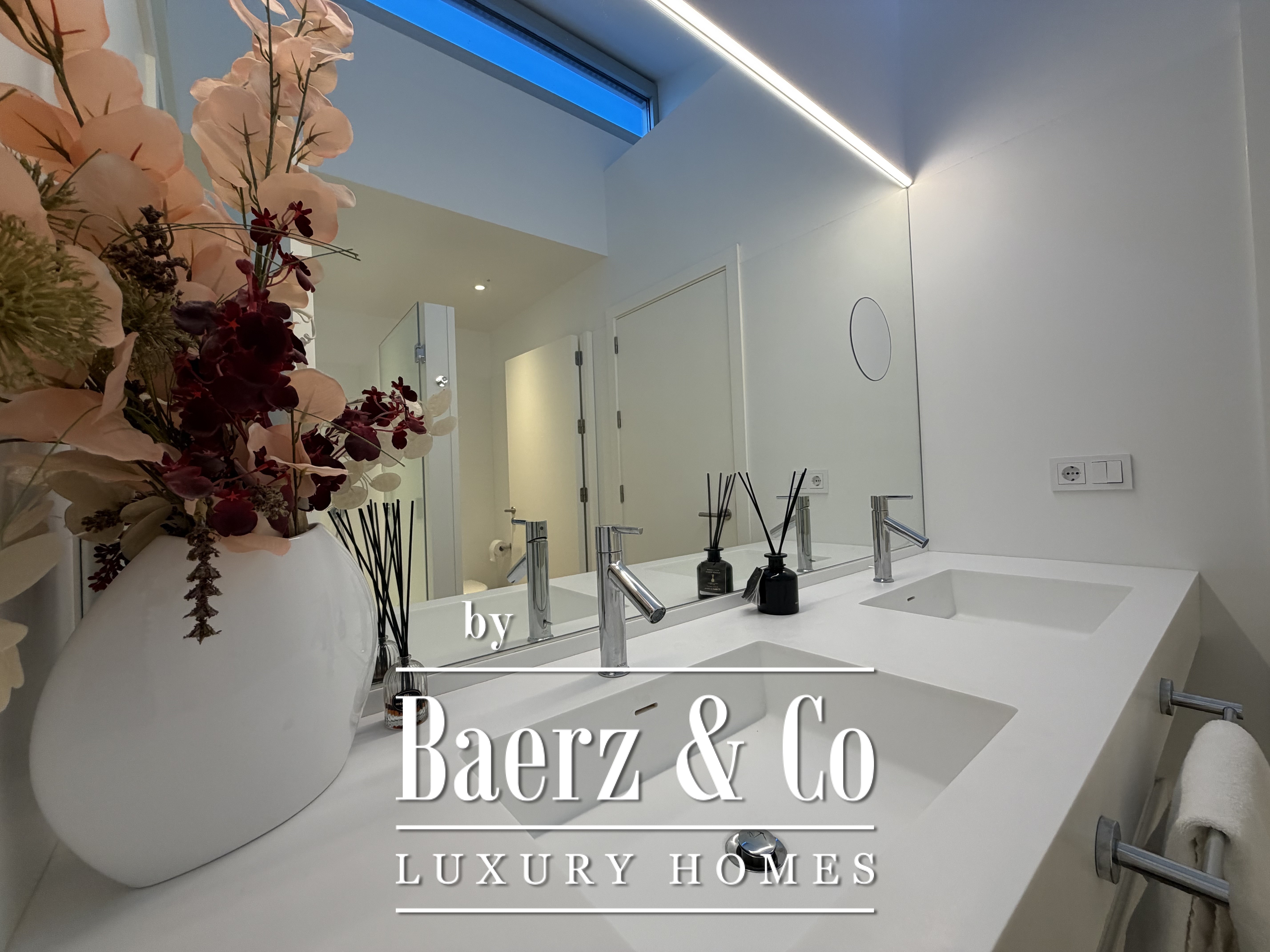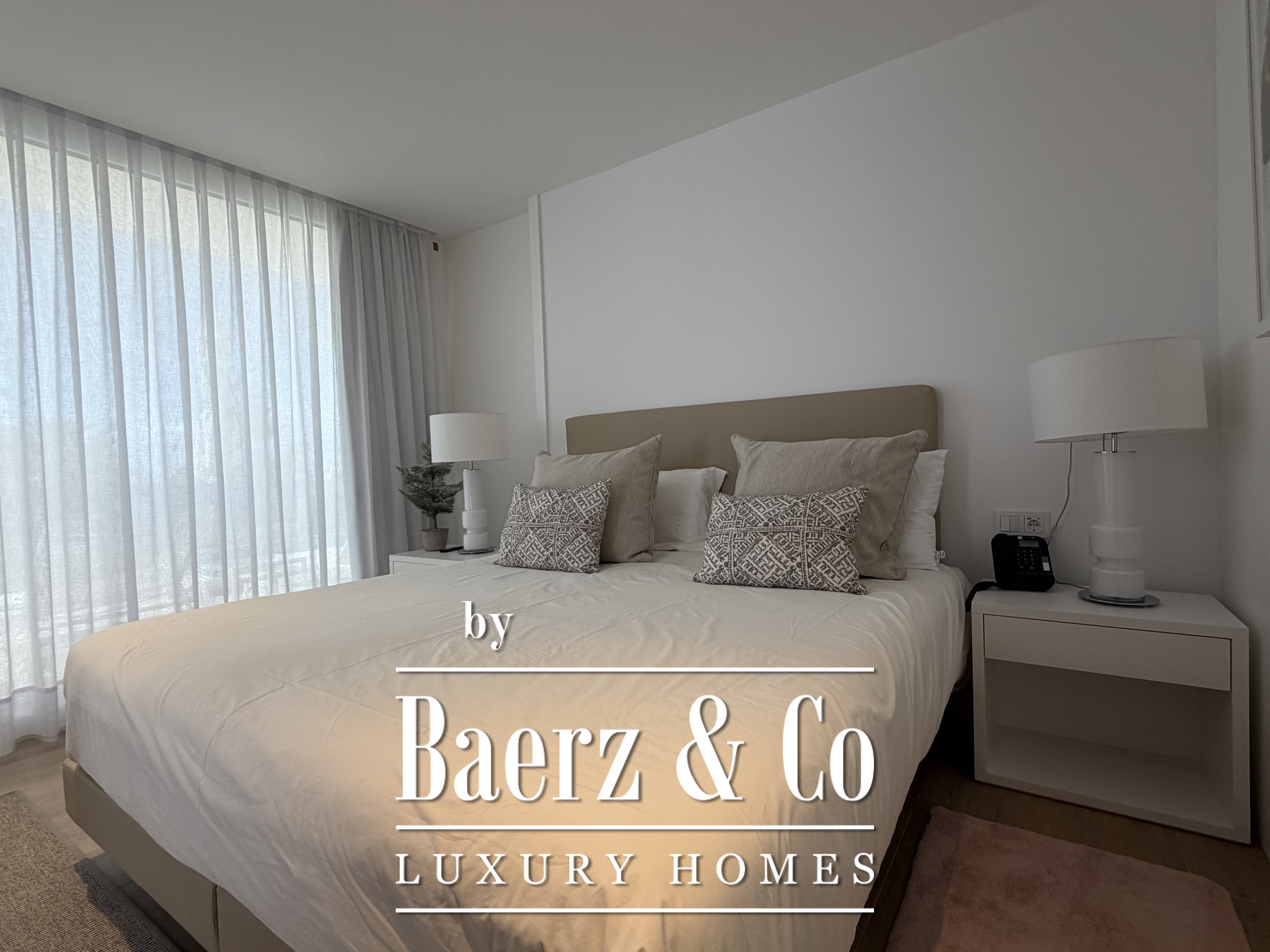 Natural light fills the interiors through expansive windows, framing the horizon and creating seamless access to the terrace and landscaped garden. Three bedrooms offer dressing rooms, while two bathrooms feature modern showers, underscoring the emphasis on refined functionality. The bright living room invites relaxation, whether enjoying a quiet moment or sharing the space with guests.