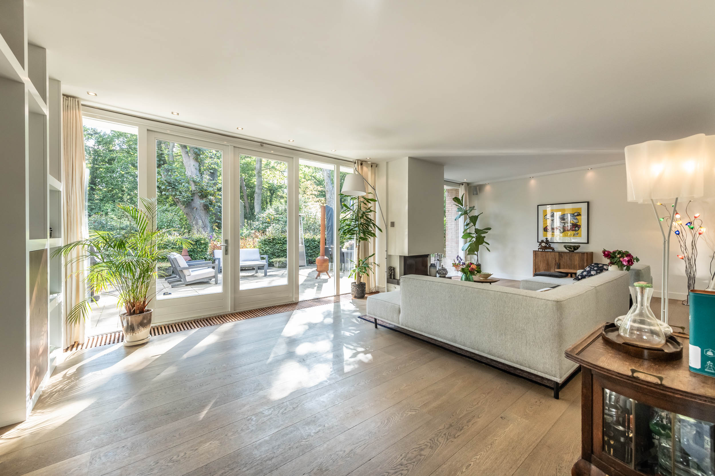 Entrance hall, spacious hallway with toilet and urinal, bright and spacious living room with fireplace, oak flooring and doors to the front terrace. A double door connects to the second living room/TV room with large windows and a view of the back garden. Luxurious, tailor-made kitchen-diner (’t Spant in Heemstede, 2022) featuring underfloor heating, a sink/kitchen island and various built-in appliances: wine climate cabinet, ovens, Quooker with sparkling water feature, coffee machine, Bora electric hob with flex zones and dishwasher. Door to the side garden.