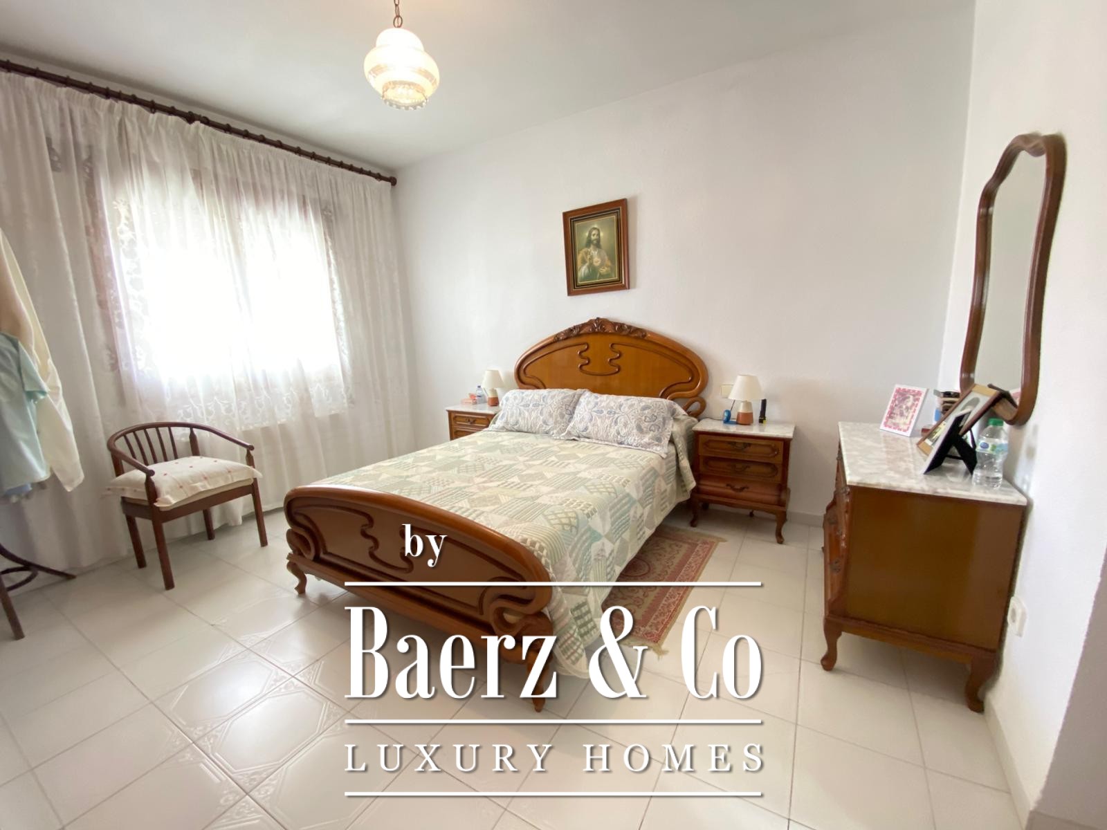 The elegant living and dining room, complete with a fireplace, connects to an independent kitchen. Three bedrooms are thoughtfully designed for comfort, the principal suite with its own en-suite bathroom, complemented by two additional bathrooms. Floor-to-ceiling windows throughout draw in Mediterranean light, and central heating, air conditioning, and double-glazed windows ensure the villa is suited to year-round living.