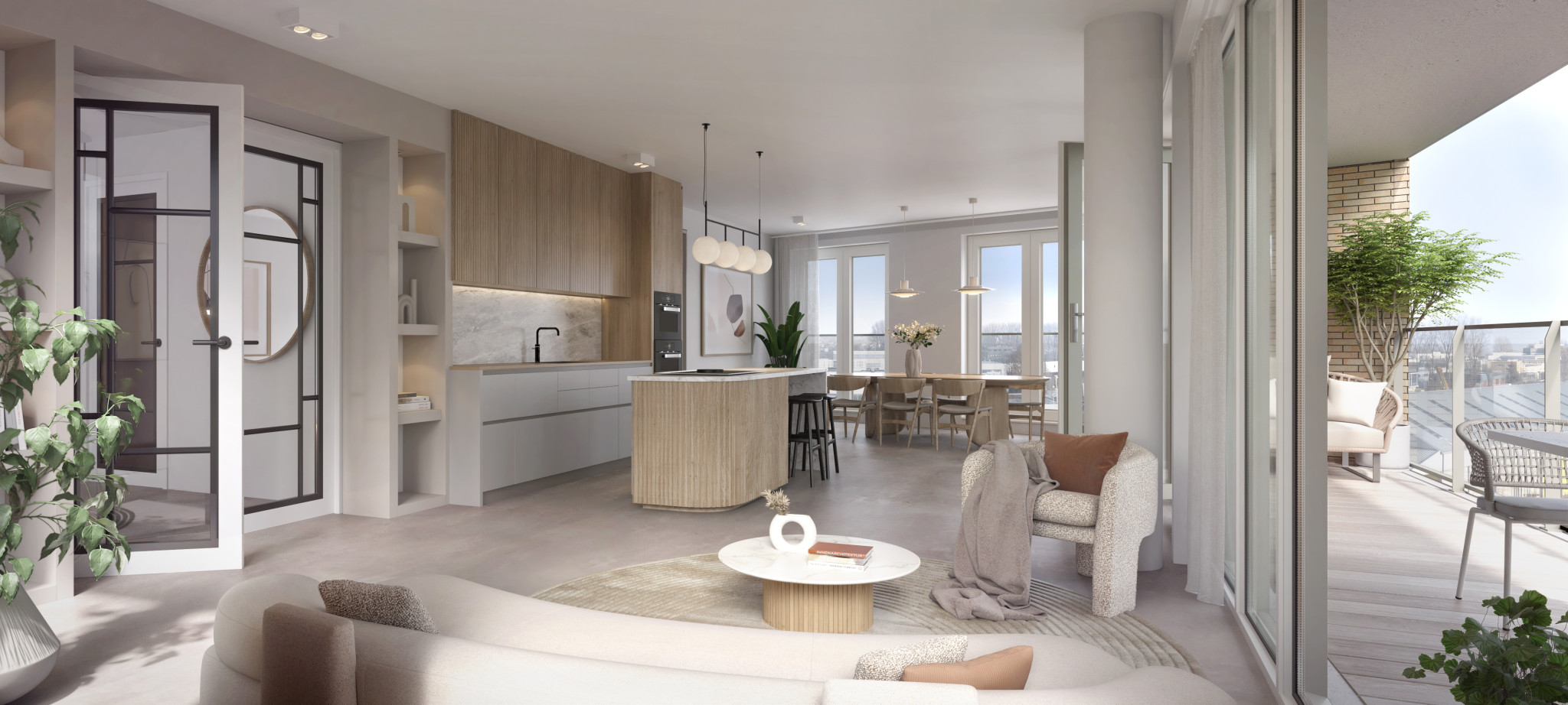 De open woonkeuken van maar liefst 46 m² vormt het hart van het appartement. Dankzij de grote raampartijen komt er volop daglicht binnen en geniet je van een schitterend uitzicht over de omgeving. Vanuit deze ruimte is er directe toegang tot het zonnige balkon, een ideale plek om te ontspannen met een kop koffie in de ochtend of een goed glas wijn in de avond, terwijl je uitkijkt over het water.