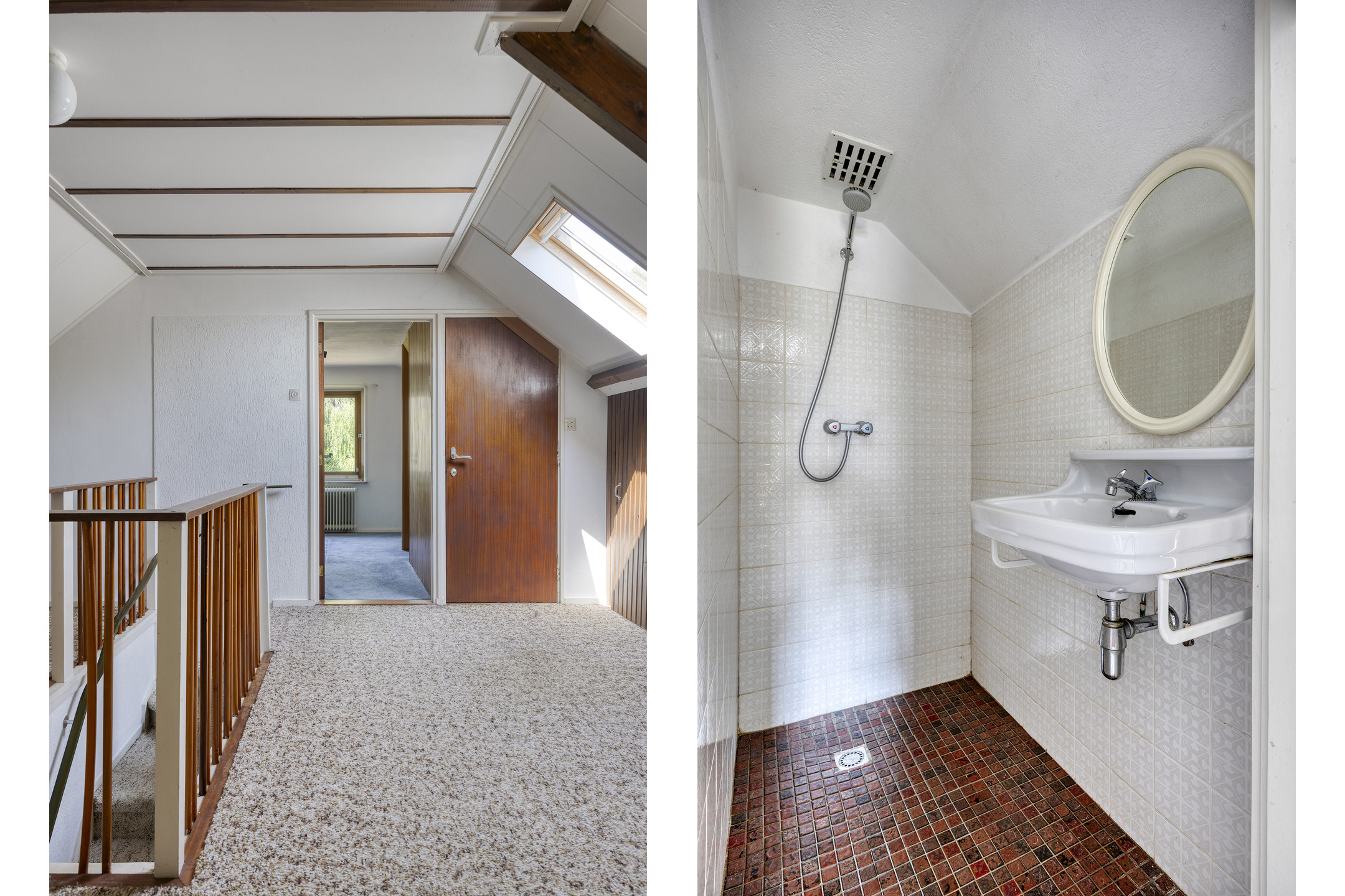 A staircase in the hallway leads to the first floor. The large landing offers plenty of storage space in the eaves, access to a separate shower room, and two more generously sized bedrooms with built-in wardrobes. The size of the landing allows for an easy reconfiguration to create additional bedrooms and/or a bathroom on this floor. This makes the house not only perfect for families but also ideal for hosting guests or creating dedicated work or hobby spaces.