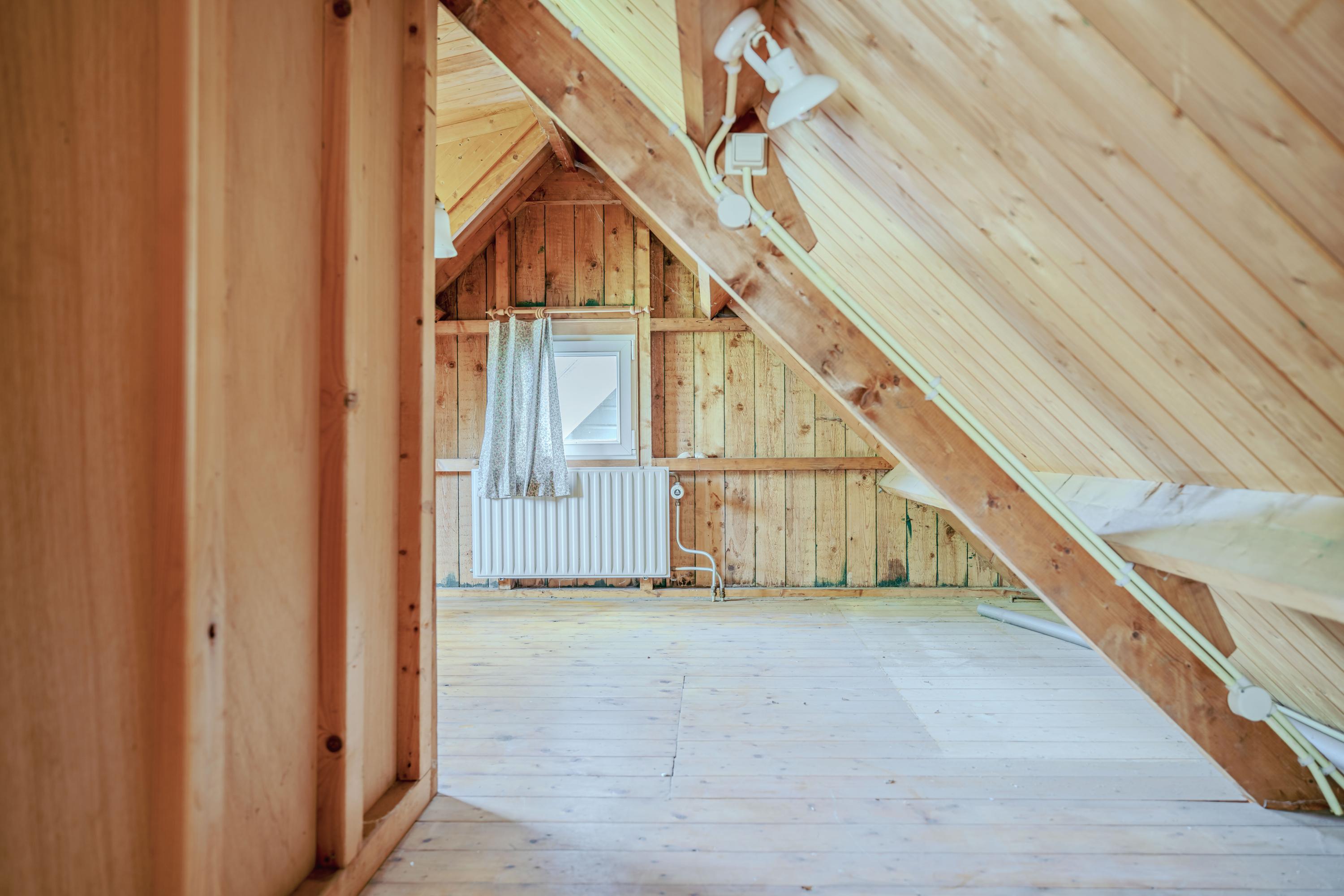 A wooden spiral staircase leads to the first floor, where a landing provides access to a spacious bedroom occupying the entire level. The room offers beautiful views over the River Amstel and the surrounding landscape. Practical storage spaces have been created beneath the sloping roofs. At the front, a window alcove provides a seating area with a view of the river.