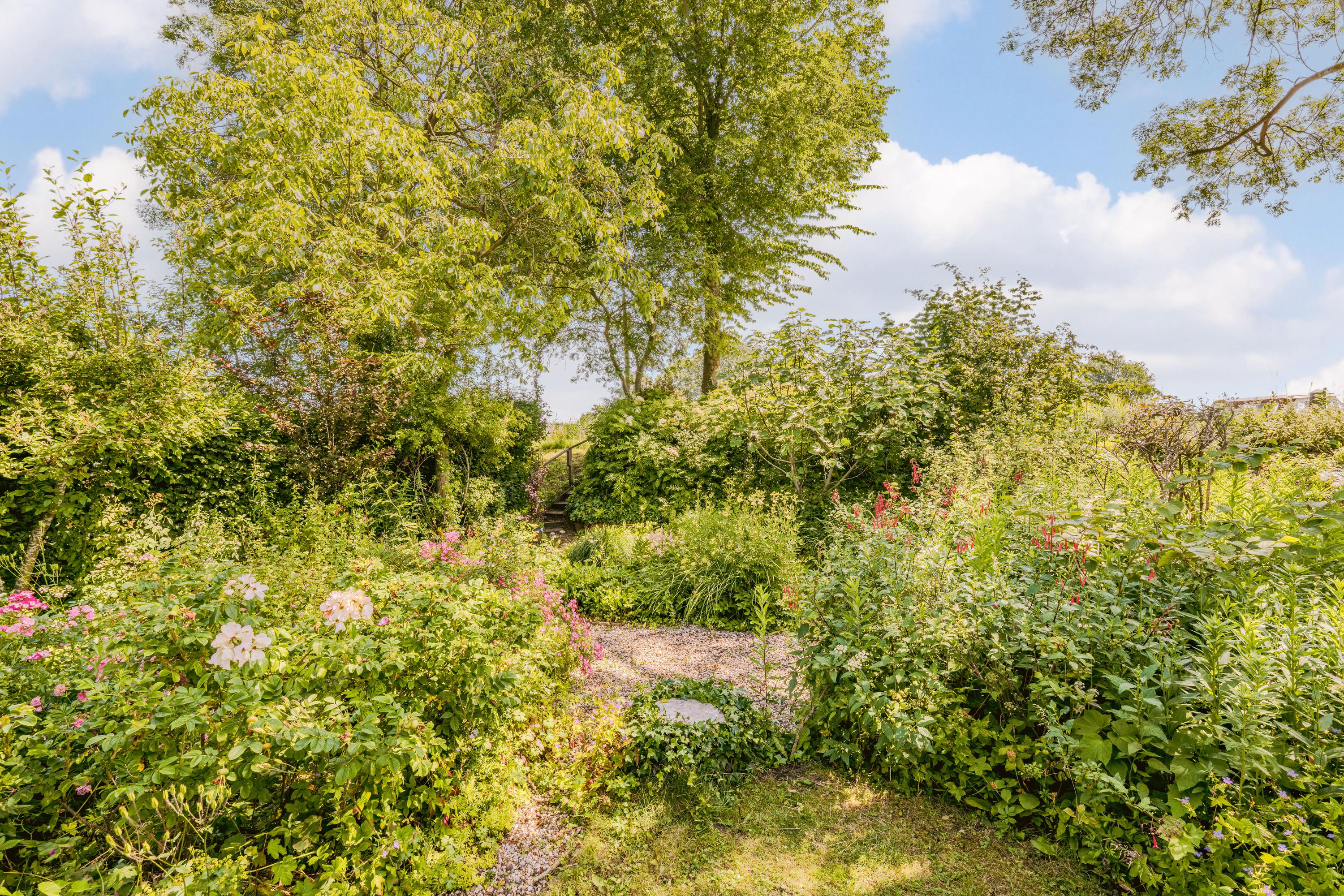 From the courtyard, the main house can be accessed through two doors. The left door opens into the kitchen, where ample daylight enters through skylights. The kitchen is fitted with a sink, four-burner gas hob, oven, and various cabinets and drawers. The central heating boiler and washing machine connection are also located here. Adjoining the kitchen is the living and dining room at the front of the house, featuring wooden beams, built-in cupboards, and windows overlooking the garden. The fireplace, wooden finishes, and view of the dike give the room a warm and inviting atmosphere. Through the hallway with a skylight, you reach the separate toilet with washbasin and the bathroom, which includes a bathtub with shower and a washbasin unit.