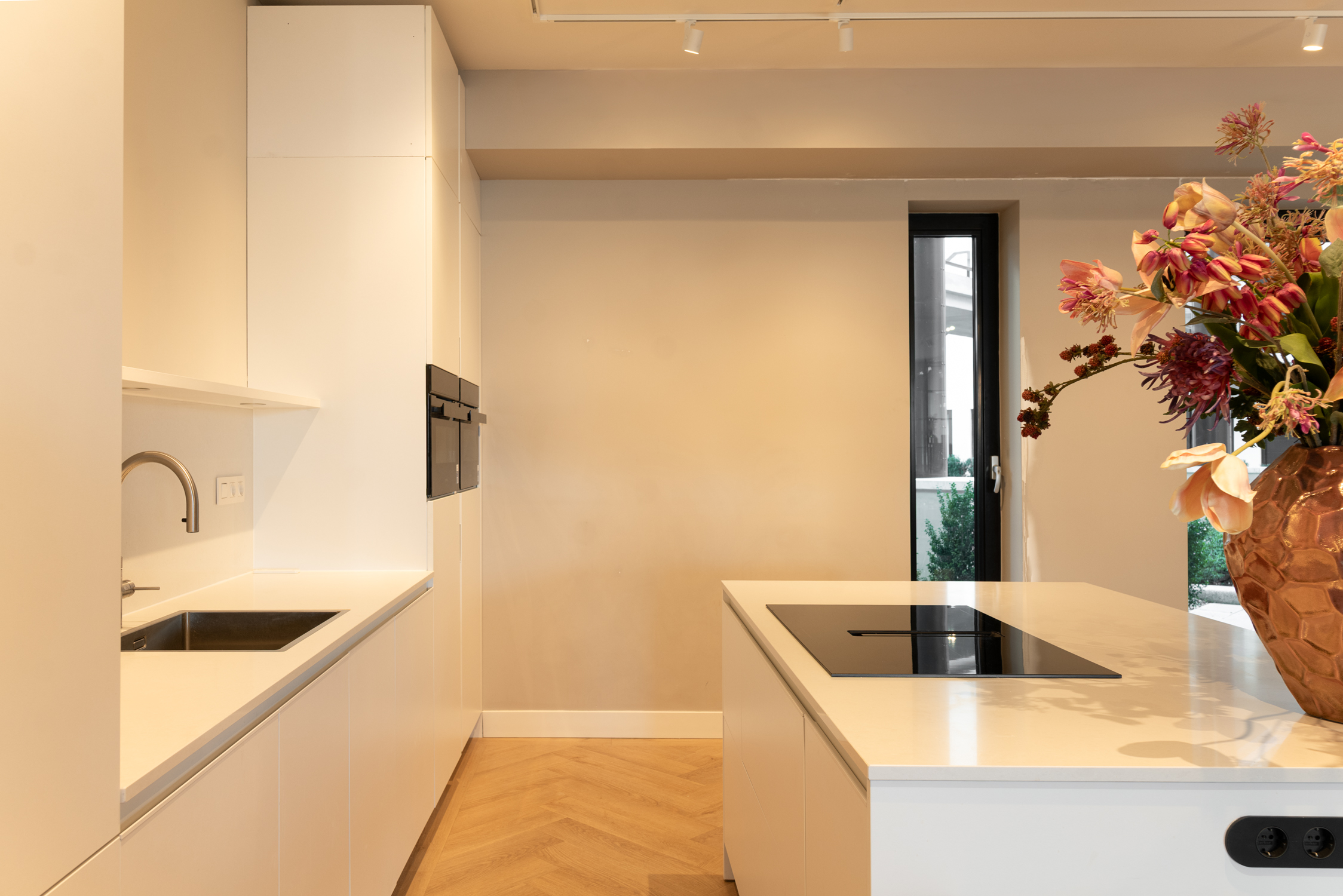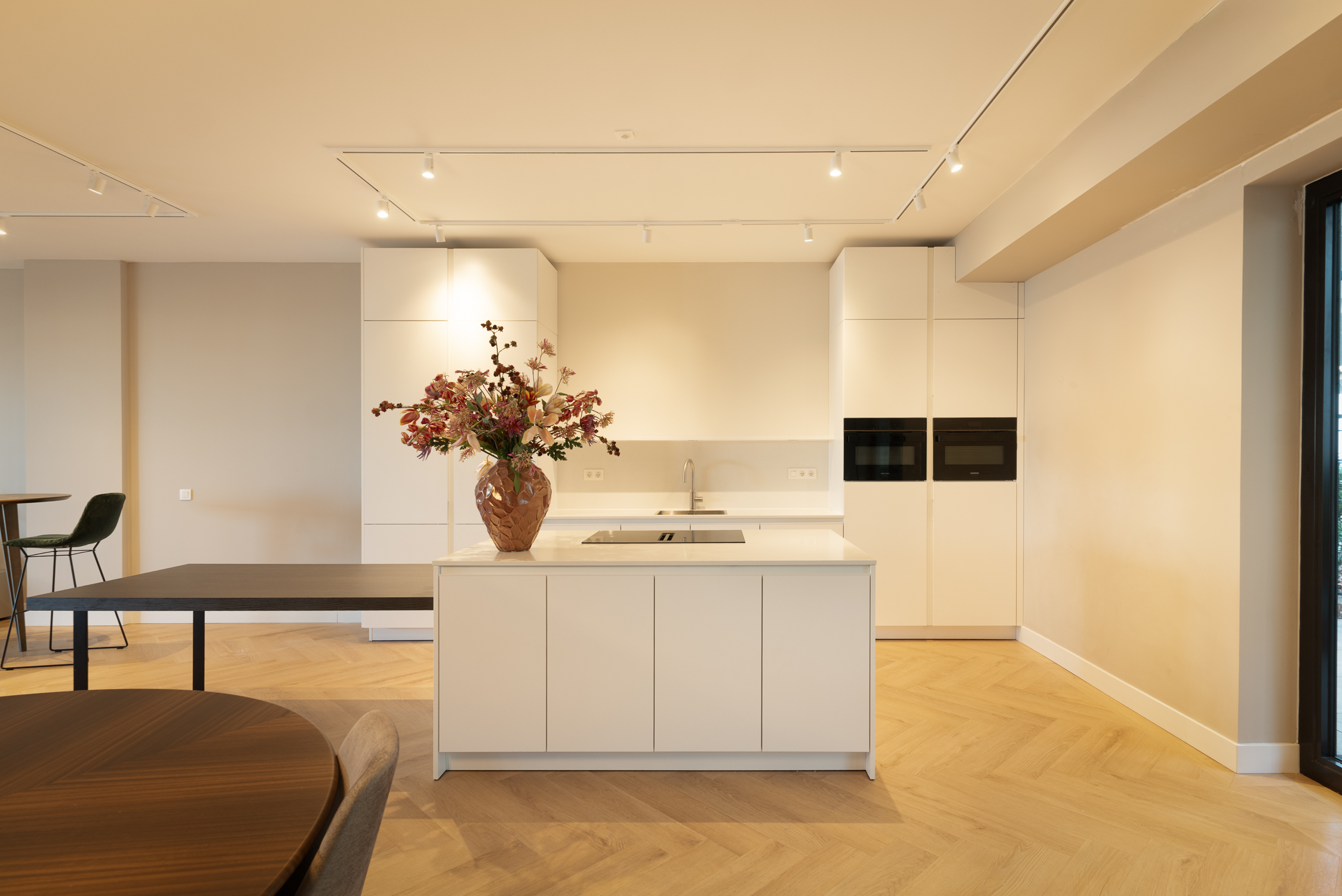 A vast living area of nearly 90 m² integrates a custom-designed lounge, elegant dining zone, and modern open kitchen equipped with premium appliances and a generous island. Light flows in through expansive windows, connecting the living spaces to a private garden at the front and a wide terrace stretching the full width of the apartment at the rear.