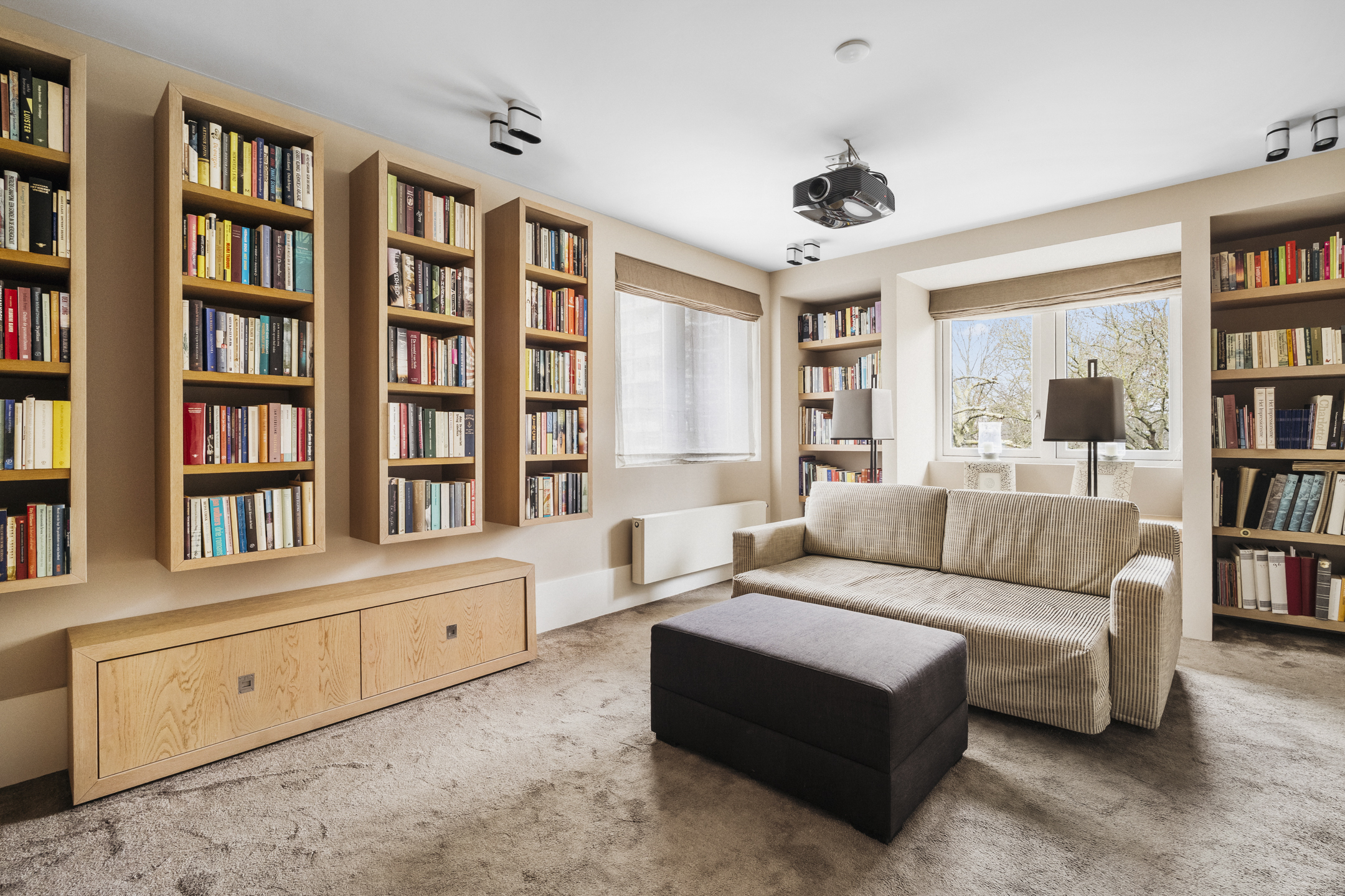 Also at the rear is a bedroom currently used as a study. This room features bespoke cabinetry and provides access to the west-facing balcony overlooking the garden.
