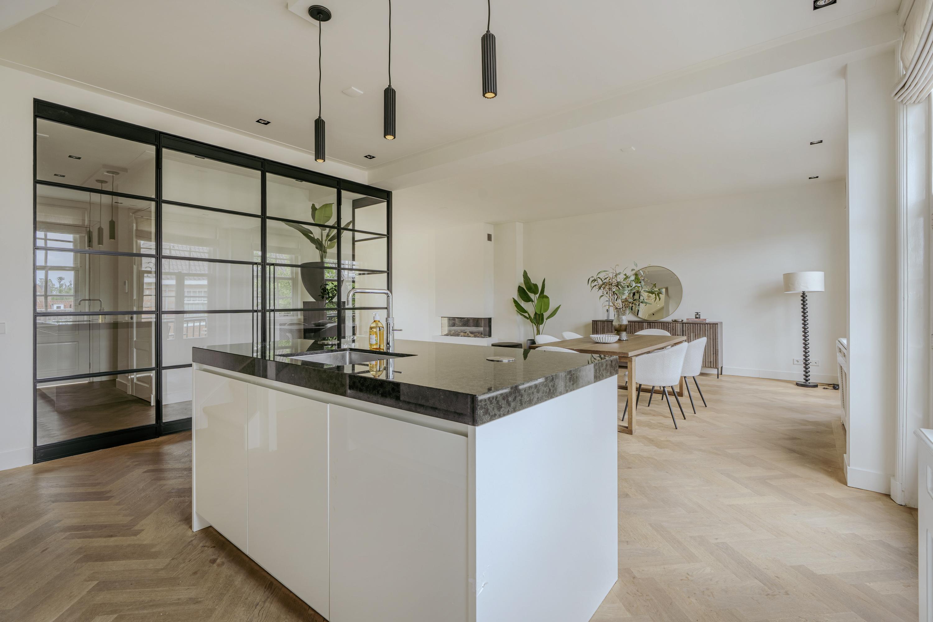 From the hall, elegant steel-framed doors open into a bright and expansive living area. At the front, you'll find a luxurious open-plan kitchen fully equipped with high-end built-in appliances: a 5-burner gas stove, oven, microwave, Quooker, refrigerator, freezer, wine cooler, and dishwasher. The generous kitchen island with bar seating is the social centerpiece of the home, ideal for relaxed evenings with family and friends.