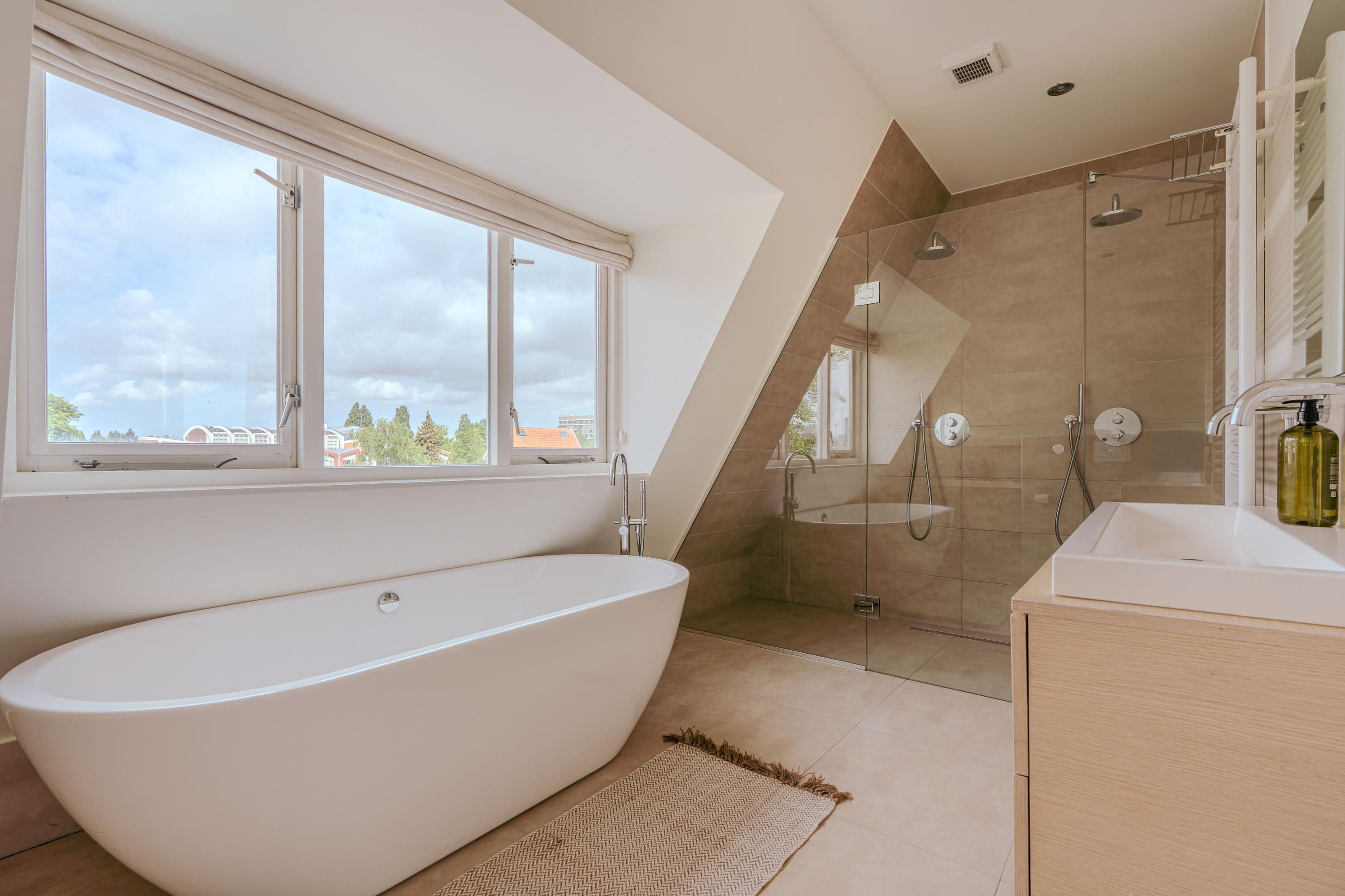 The landing—boasting impressive ceiling height reaching into the roofline, skylights, and clever storage—gives access to all rooms on this level. At the rear is a comfortable bedroom with built-in wardrobes and French doors to a sunny roof terrace. The master bedroom spans the full depth of the building and features air conditioning, custom-made wardrobes, and beautiful original wooden beams that create a warm and inviting atmosphere. Double doors open directly onto the spacious roof terrace—an exceptionally private outdoor area where you can soak up the sun in complete peace. Centrally located on this floor is the stylish bathroom, luxuriously appointed with underfloor heating, a freestanding bathtub, walk-in shower, double washbasin with cabinet, and a second toilet. Large skylights provide plenty of natural light.