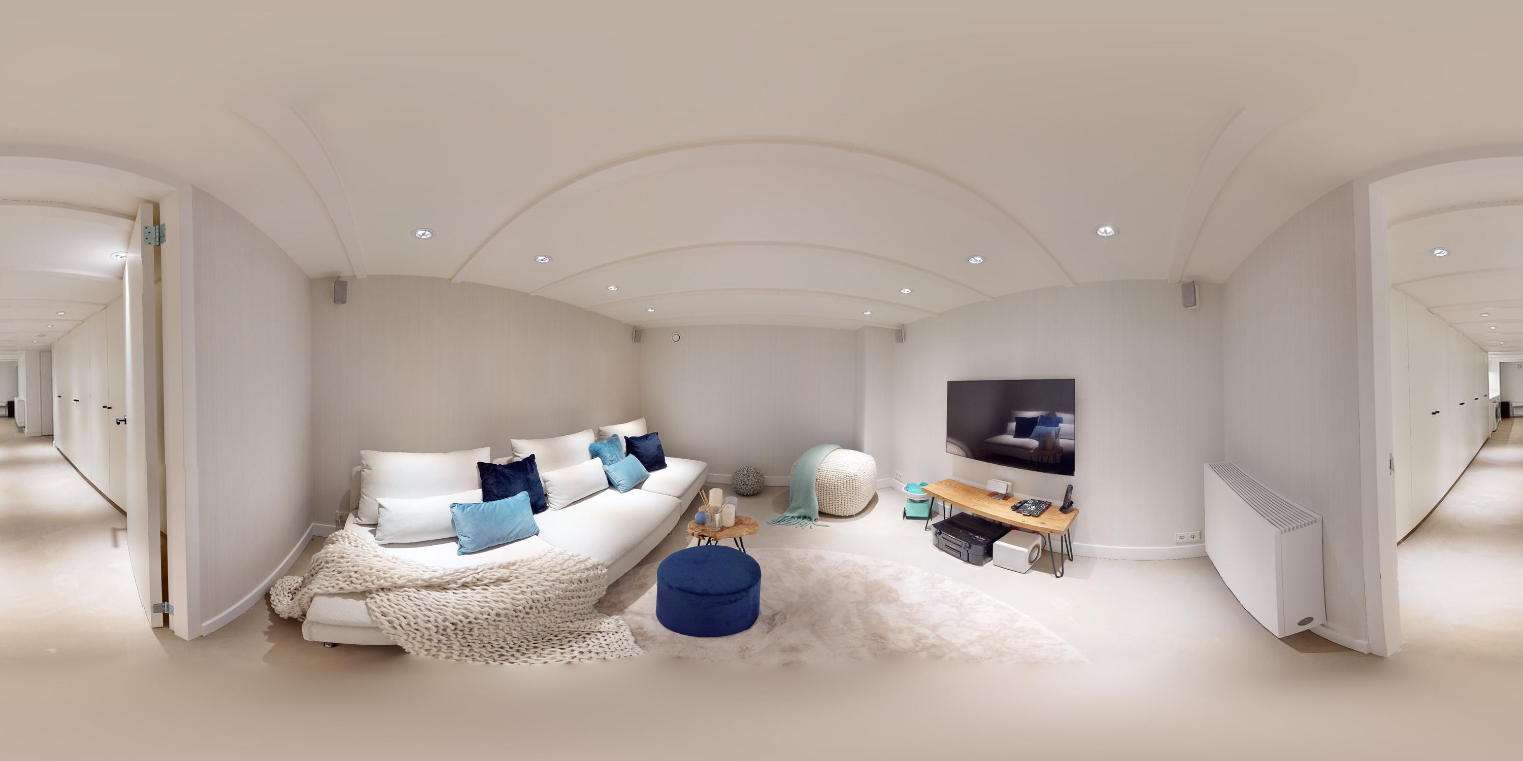 The master bedroom is situated at the front of the apartment on this floor. This spacious room has a large walk-in closet on both sides and a built-in dressing table. The master bedroom also has a luxury en-suite bathroom with a stand-alone bath, large rain shower, a double, natural-stone washbasin vanity unit and a shower-toilet.