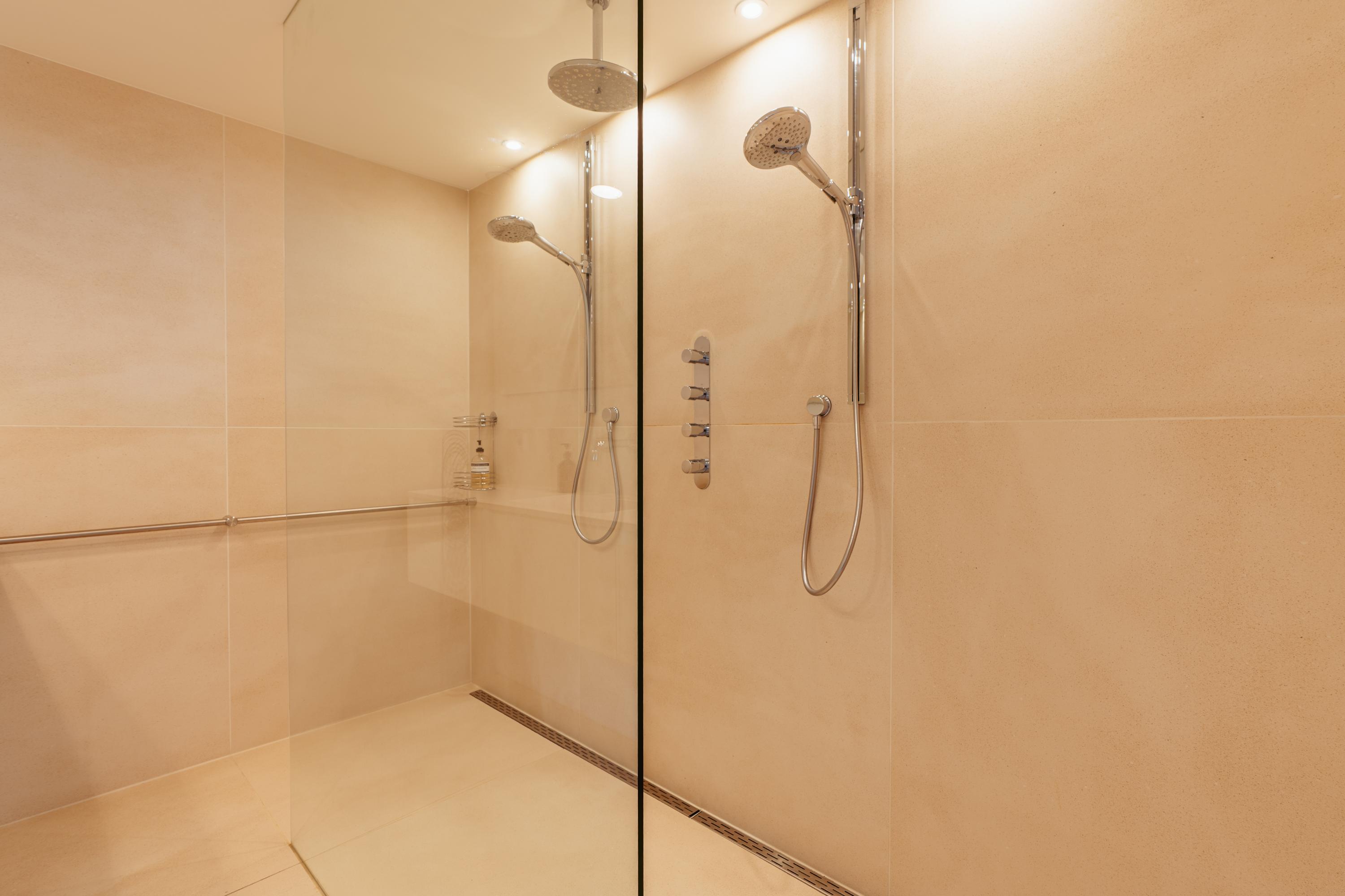 A spacious landing provides access to the first three bedrooms. At the front, you’ll find the luxurious master suite, complete with custom-fitted wardrobes, a walk-in closet, a freestanding solid surface bathtub, separate toilet, and an en-suite bathroom featuring double rainfall showers and a large double-sink vanity. At the rear are two playful and well-sized bedrooms, each with a mezzanine level. The second bathroom includes a Jee-O walk-in shower, vanity with sink, and a toilet. There’s also a separate laundry room with space for washer and dryer.