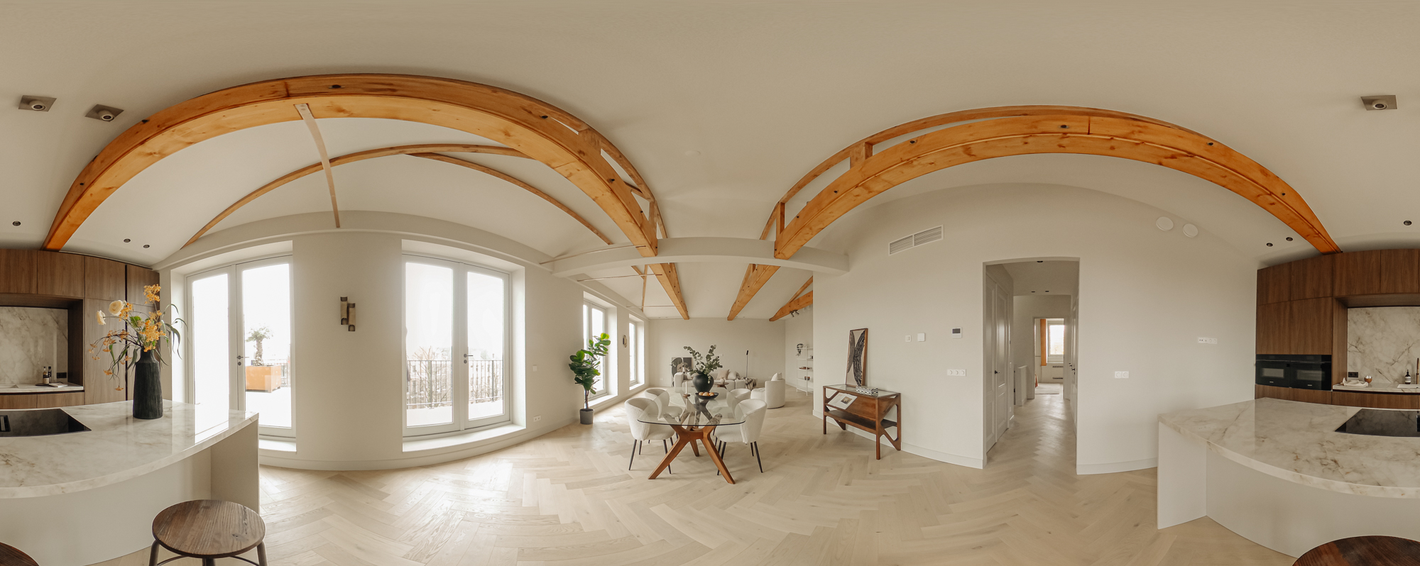 The front door to the apartment opens into a landing that gives access to storage space, a separate guest toilet and all the apartment’s other rooms. There is a large, bright living room (approx. 53 m2) and an open-plan kitchen of Italian design with a cooking island at the front of this floor. The luxury kitchen is equipped with a comprehensive range of built-in appliances and balances style and functionality perfectly. The sophisticated combination of white units with marble worktops and large units with the warm shade of walnut give the space a beautiful, atmospheric feel. A number of double doors open out onto the apartment’s sunny roof terrace.