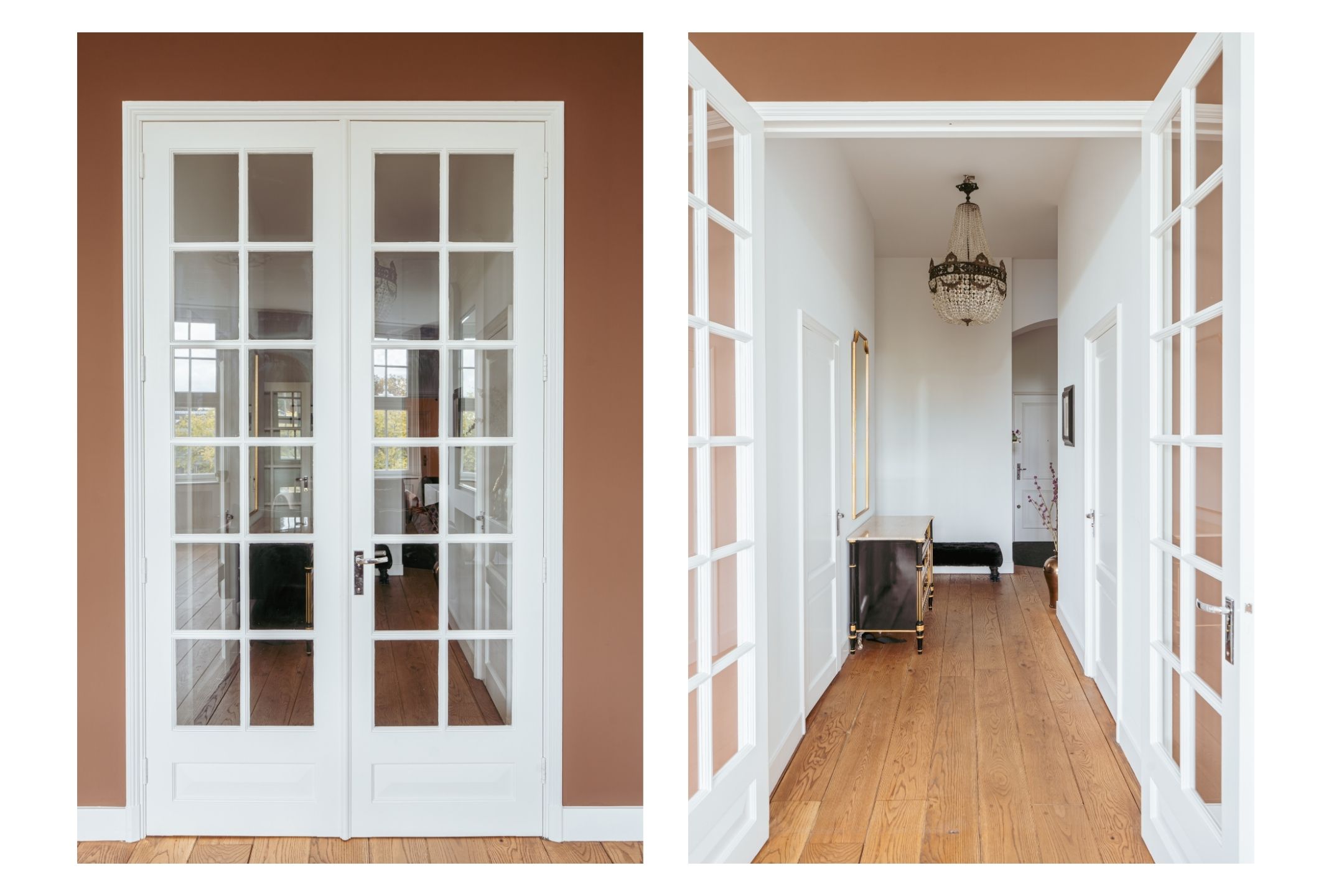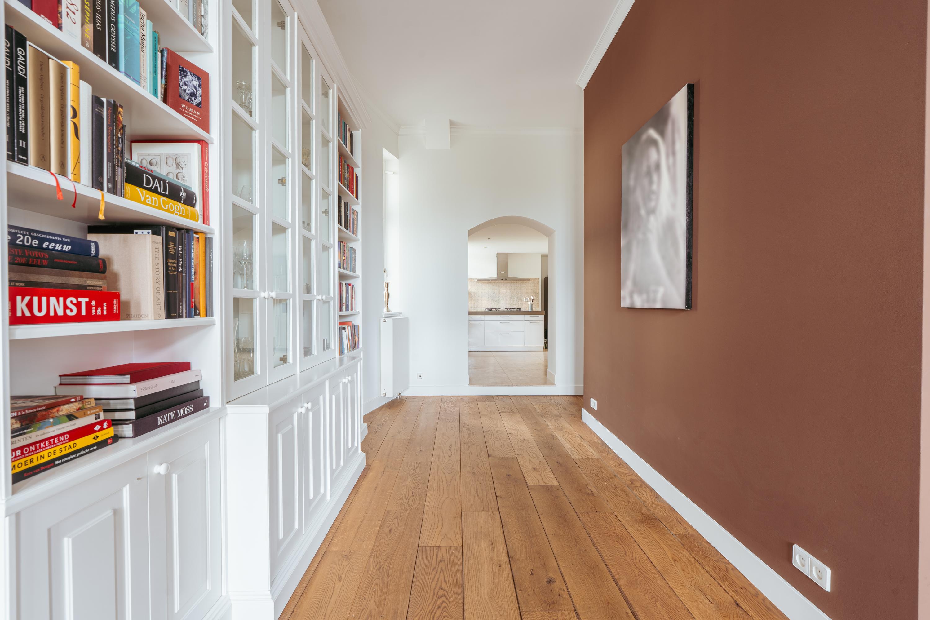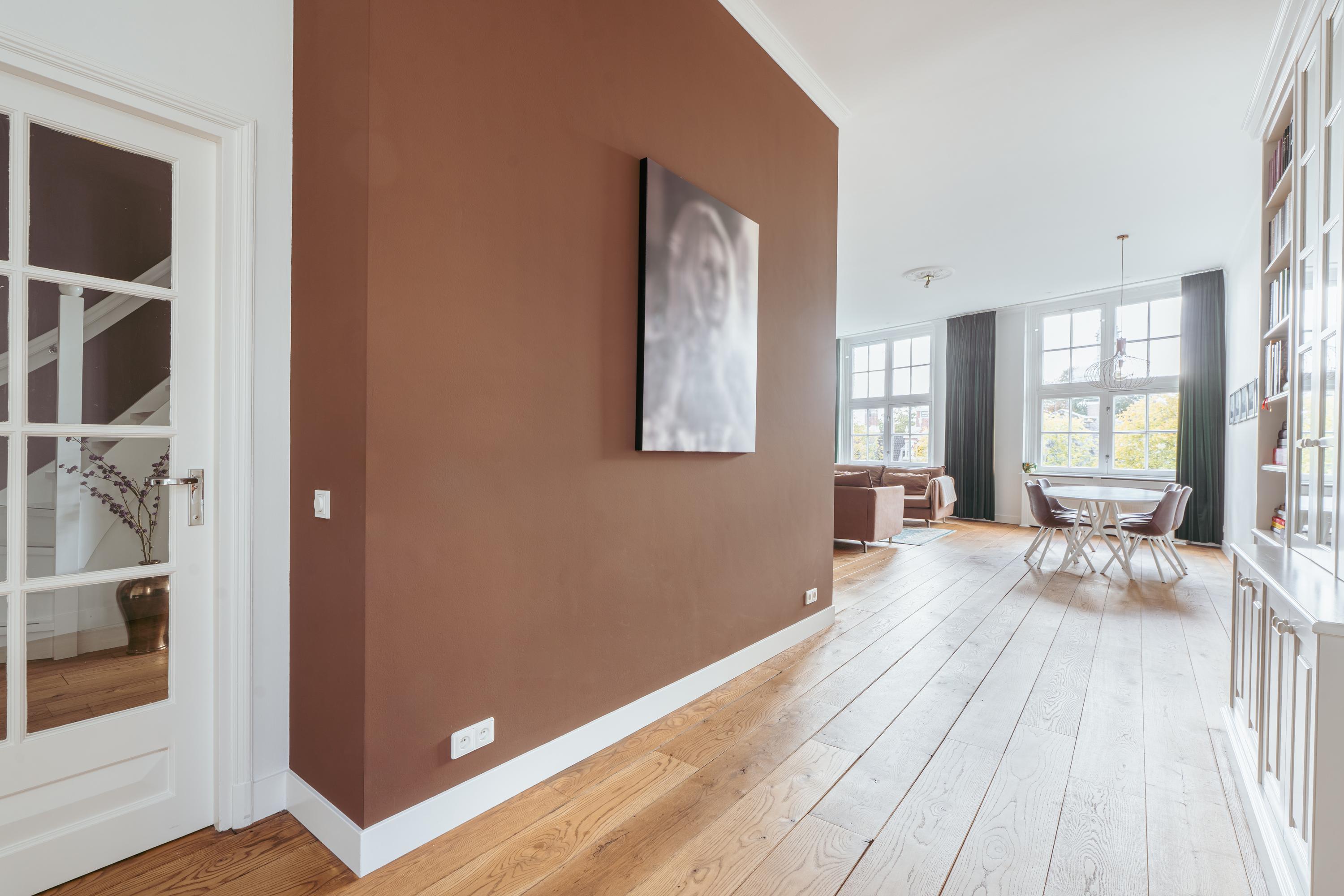 Via the impressive entrance, you reach the apartment on the third floor. Access is provided via the well-maintained staircase or one of the two lifts. Upon entering, you step into the central hallway, from which double French doors lead into the spacious living room. This impressive space is situated at the front and features large windows, allowing an abundance of natural light and offering stunning views of the canals.