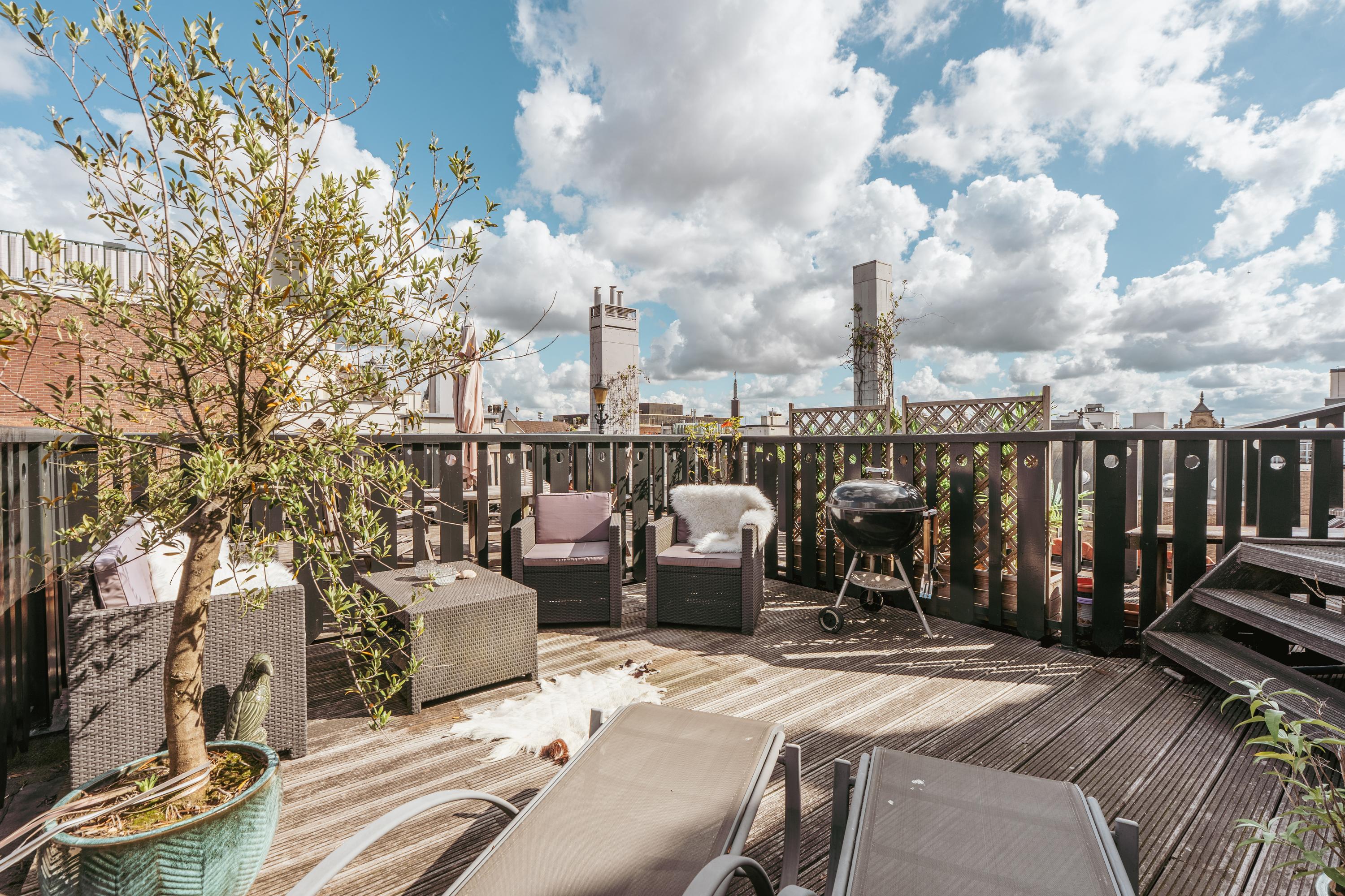 The property is spread over three floors and features a generous living room, a cosy kitchen-diner, two bedrooms, two bathrooms—one with a sauna—and a wonderfully sunny roof terrace of no less than 23 m². The complex offers an impressive and representative entrance, underground parking, lift, concierge and extensive wellness facilities including a swimming pool, sauna and solarium. The apartment itself stands out thanks to its high ceilings and sweeping views. The underground garage is internally connected to the building. Here you will also find the storage units, and parking spaces are available for sale.