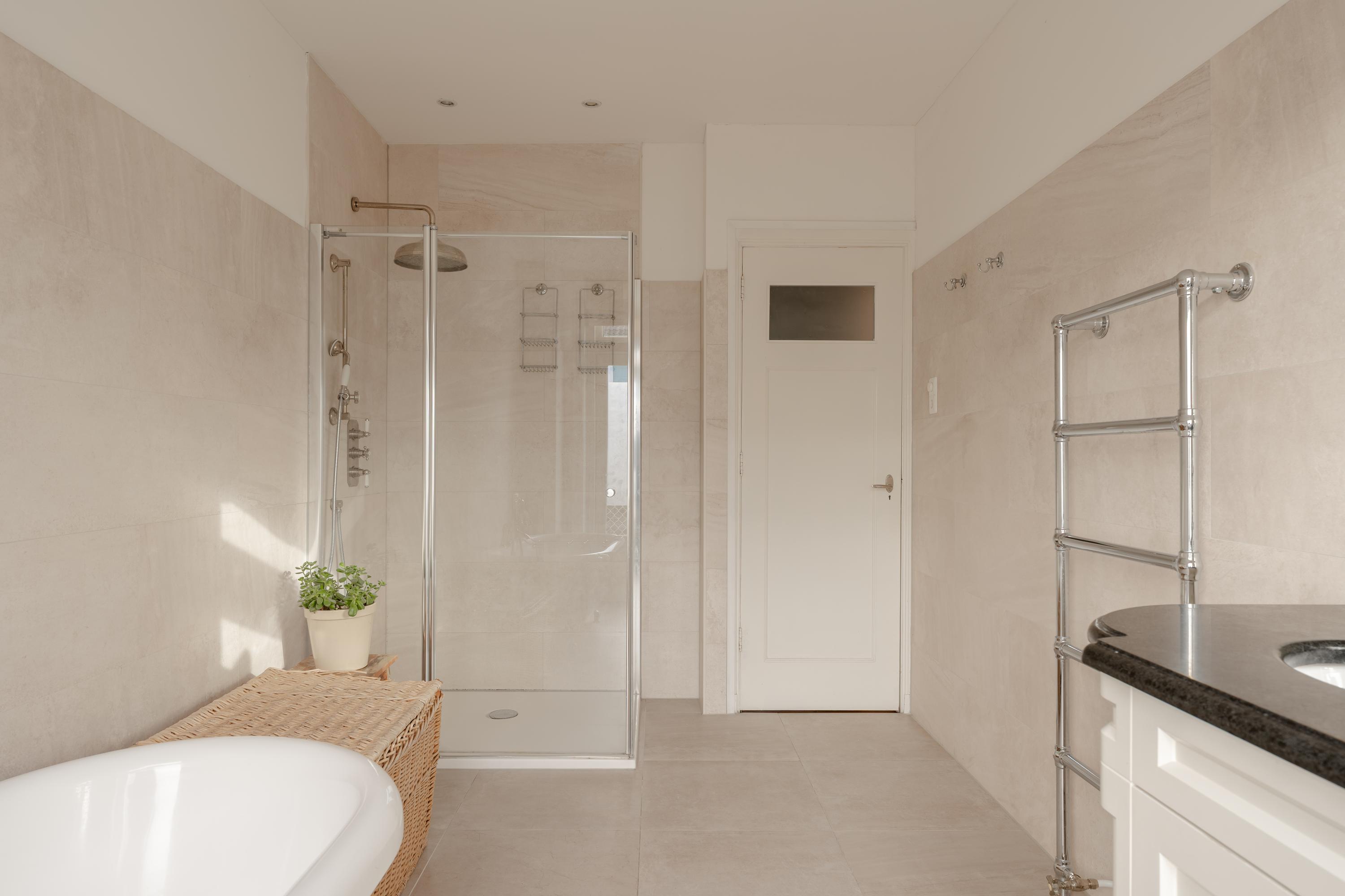 At the rear of the house is the spacious master bedroom with access to the balcony. The classic bathroom, finished in béton ciré, features a shower, double washbasin, towel radiator and a freestanding bathtub. The bathroom also provides access to the balcony through French doors.