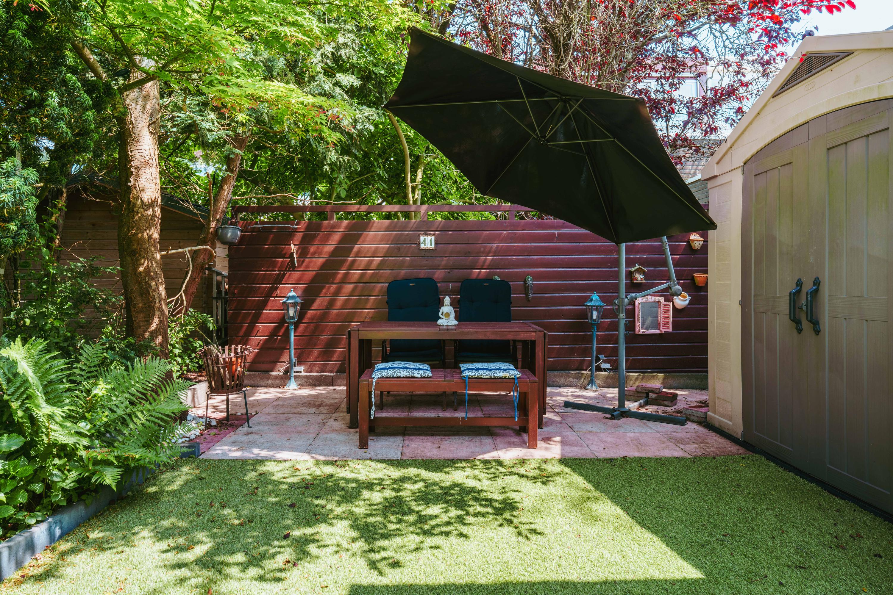 Through the spacious front garden, you reach the entrance to the house. You enter the vestibule with wardrobe space, which leads to the central hall. Here you will find practical storage space and a separate toilet. Double doors give access to the spacious and bright living room. At the front is the sitting area, attractively furnished with a gas fireplace. At the rear you will find the dining room, which is directly connected to the semi-open kitchen. The kitchen is fully equipped with a fridge, oven, microwave, gas cooker, dishwasher, and sink. A cosy bar area and seating area make this a nice place to cook and get together. Adjacent to the kitchen is the utility room, ideal as extra storage space or laundry room. From the kitchen, you have access to the wonderful and spacious back garden (approx. 51m²), facing east and equipped with storage.