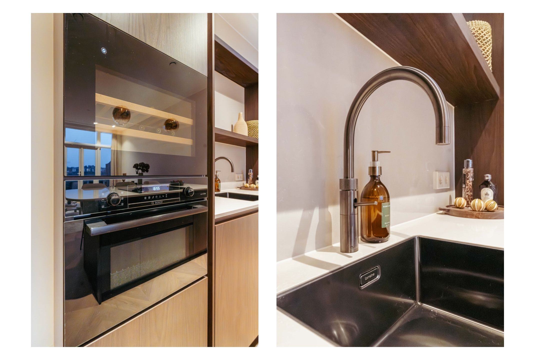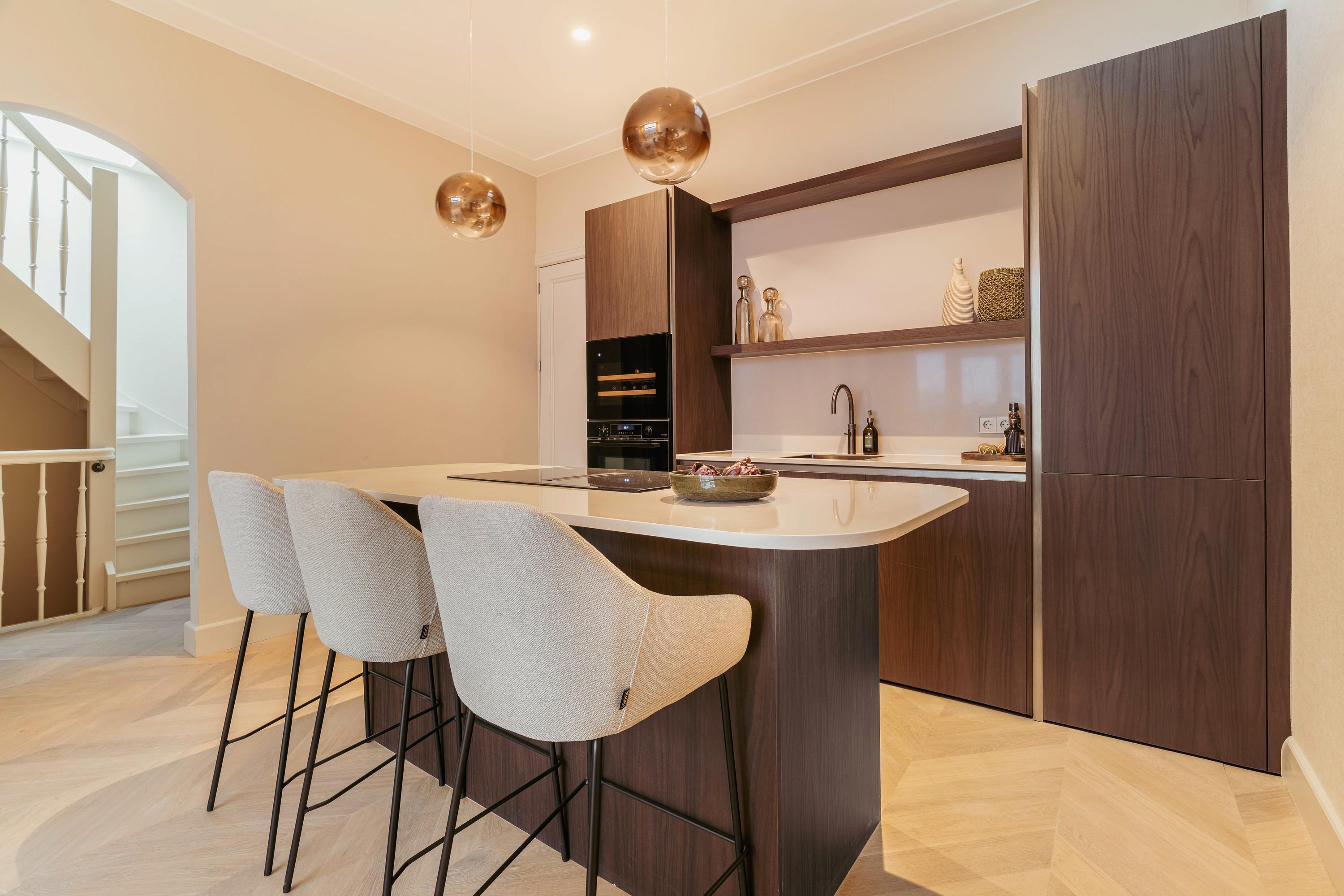 The open-plan kitchen with cooking island and bar forms an elegant whole with the living area and is equipped with all modern conveniences, including a combination oven, dishwasher, fridge-freezer, Quooker and an induction hob with integrated extraction. The island offers space for four to five bar stools, allowing you to cook with pleasure while enjoying views over the greenery and the water. A rare outlook in the city.