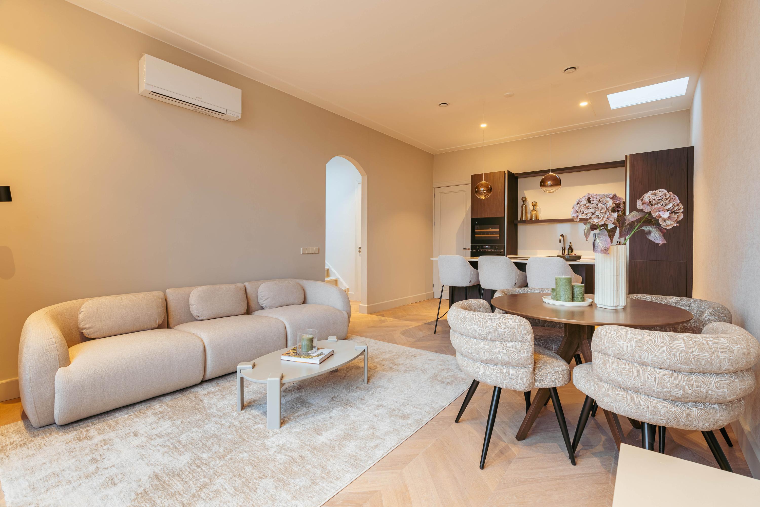 What immediately catches the eye is the unique view over the large pond on the Sophialaan, bordering the Vondelpark. This view can be enjoyed throughout the entire space, even from the kitchen. French doors open onto the deep balcony, which offers a panoramic view over the pond and brings an abundance of natural light into the apartment.