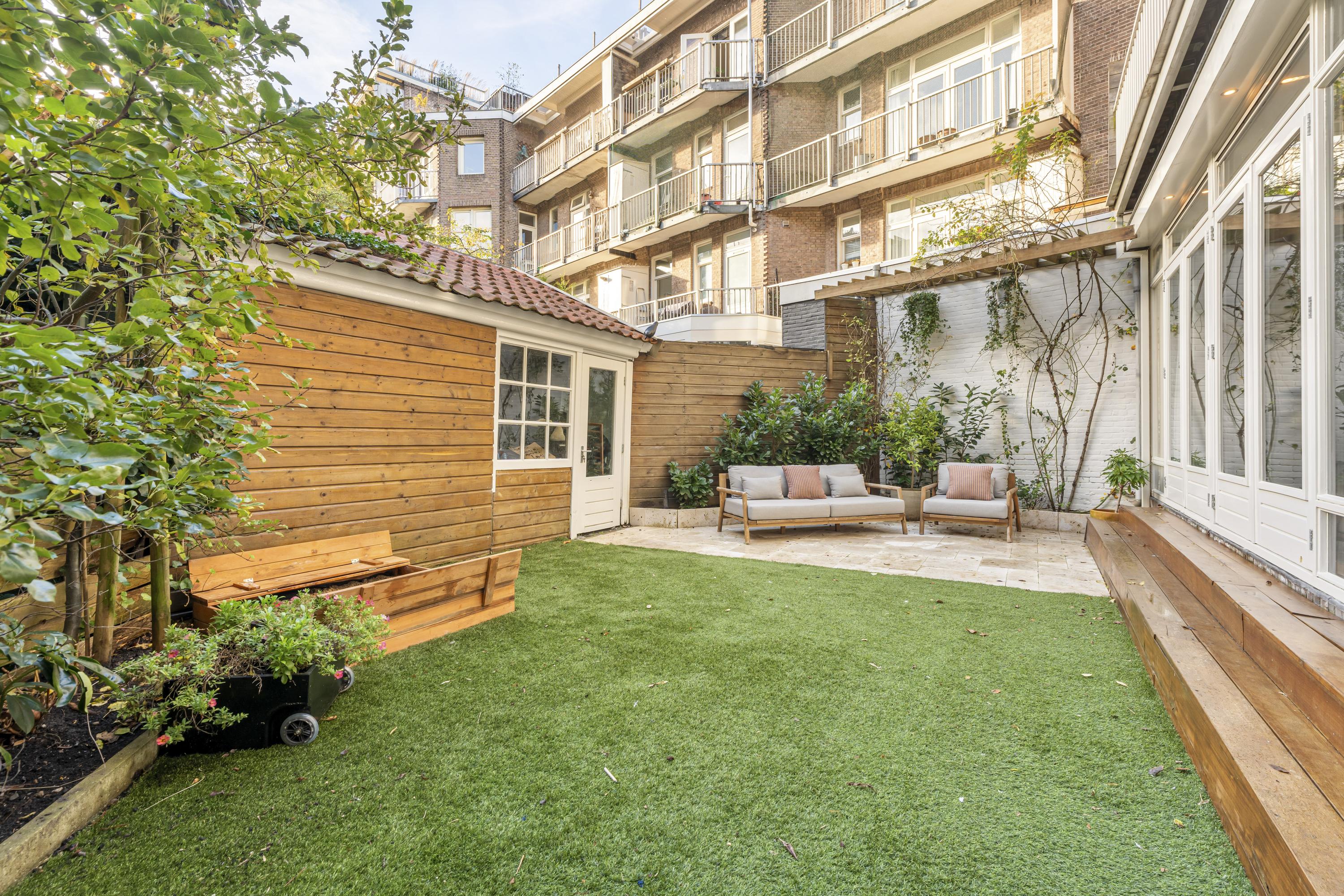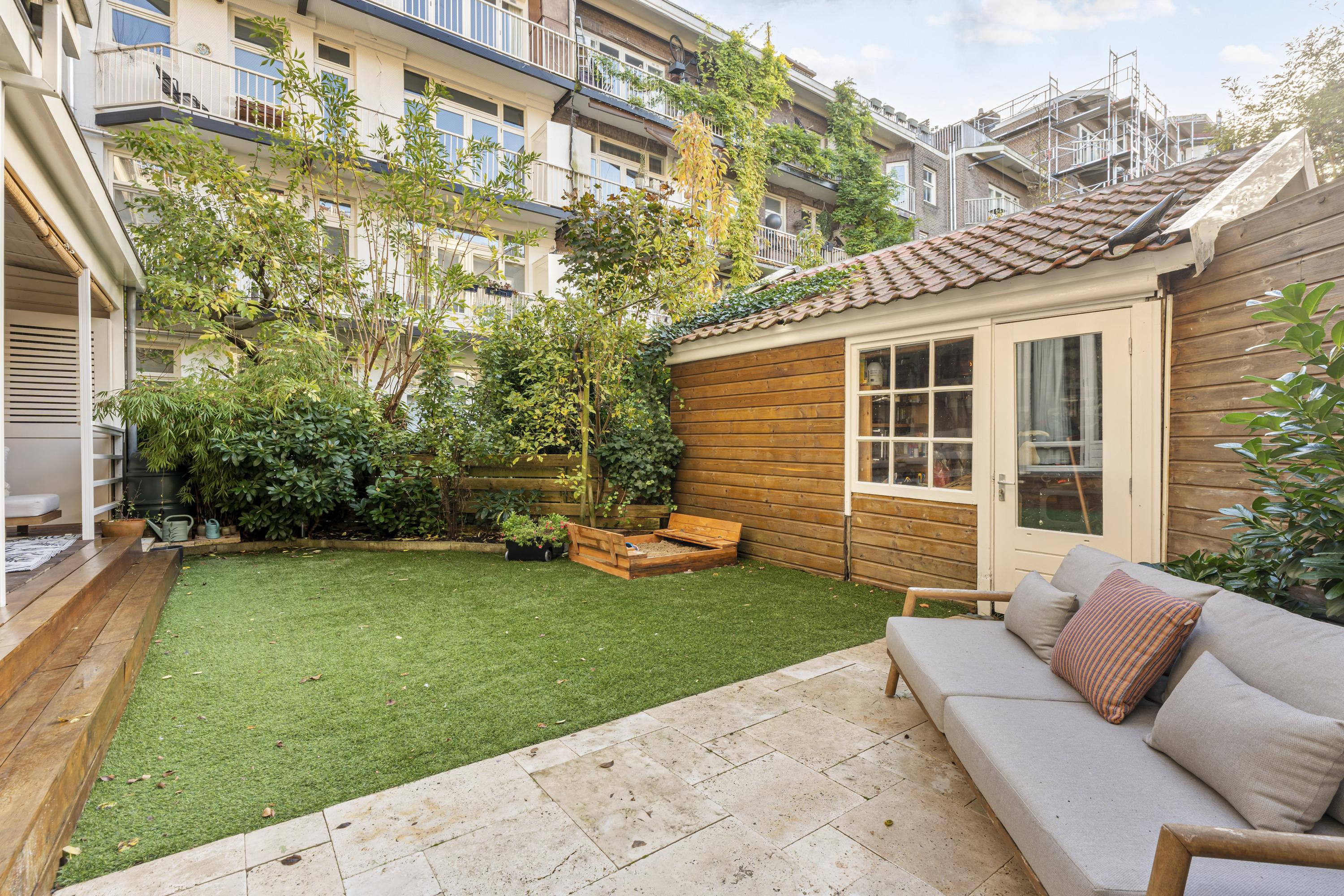 The sunny southwest-facing garden offers a high degree of privacy and features, in addition to the veranda, a detached garden house, ideal for extra storage or bicycle parking.