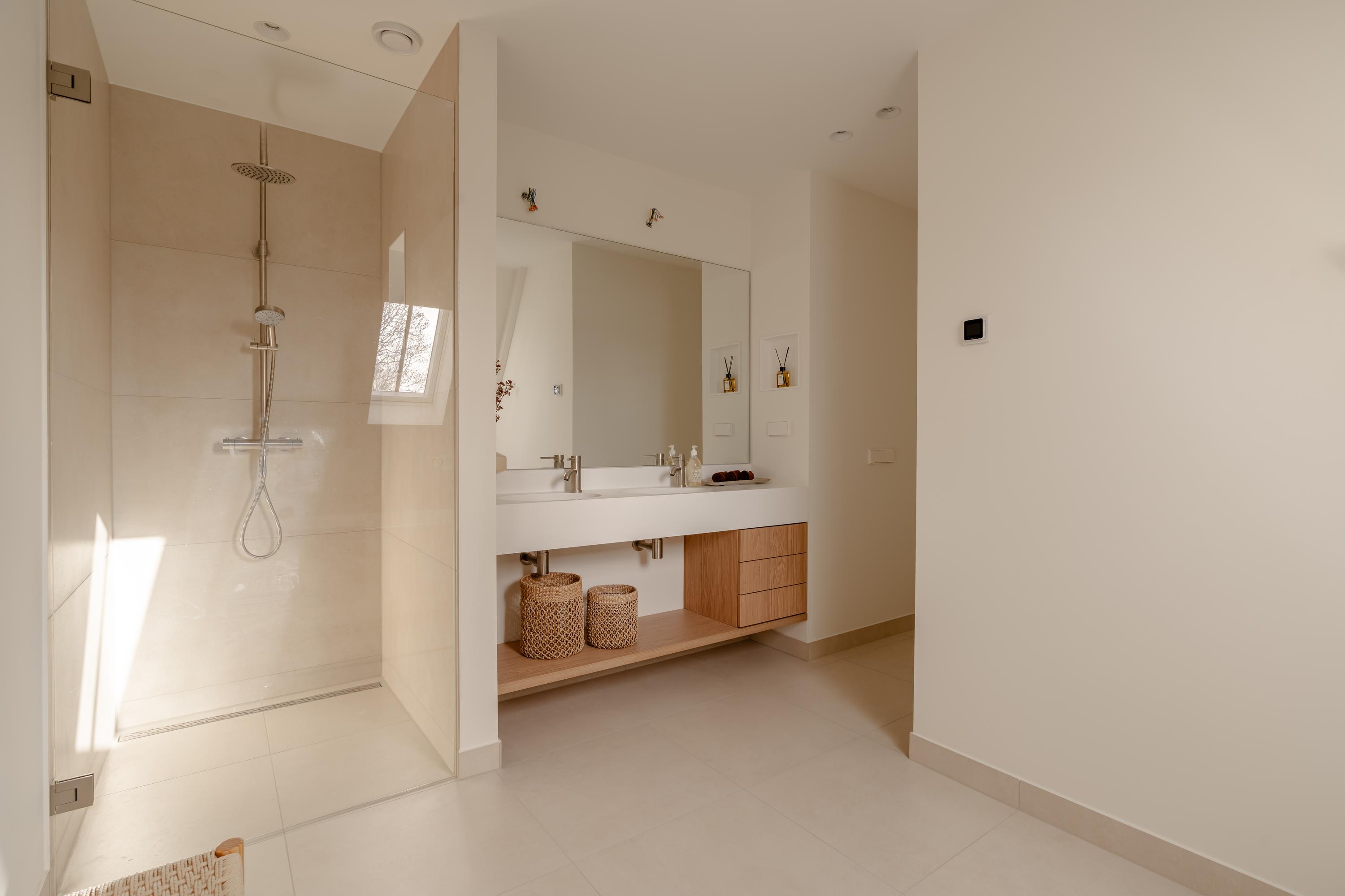 The open-plan kitchen is a true eye-catcher, fitted with high-quality built-in appliances: an induction hob with integrated extractor, dishwasher, combi-oven and Quooker tap. The combination of sleek handleless cabinetry and warm wooden accents gives this floor a modern yet inviting feel. From the living room you have access to a sunny southeast-facing balcony, perfect for a morning coffee or an afternoon drink in the sun.