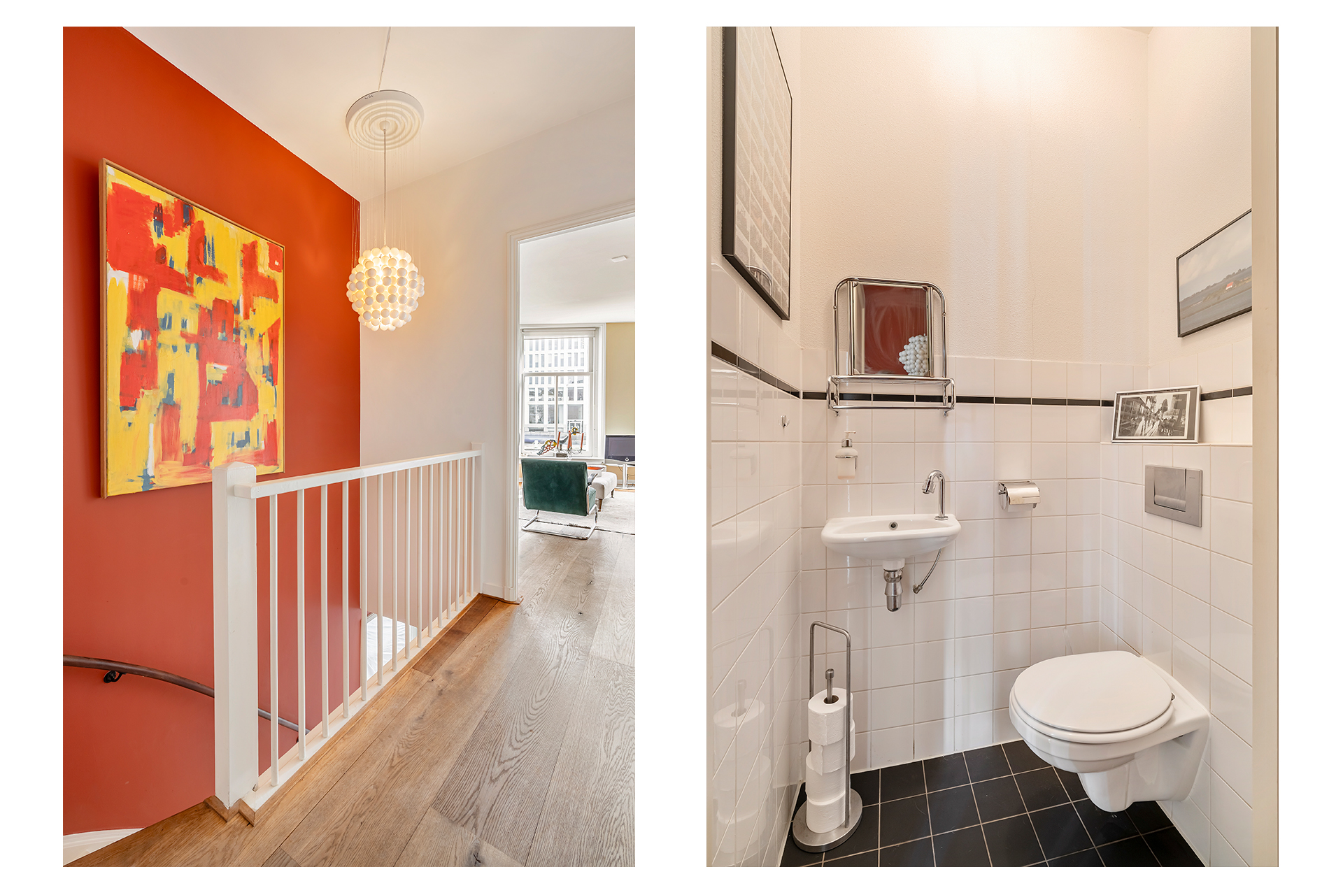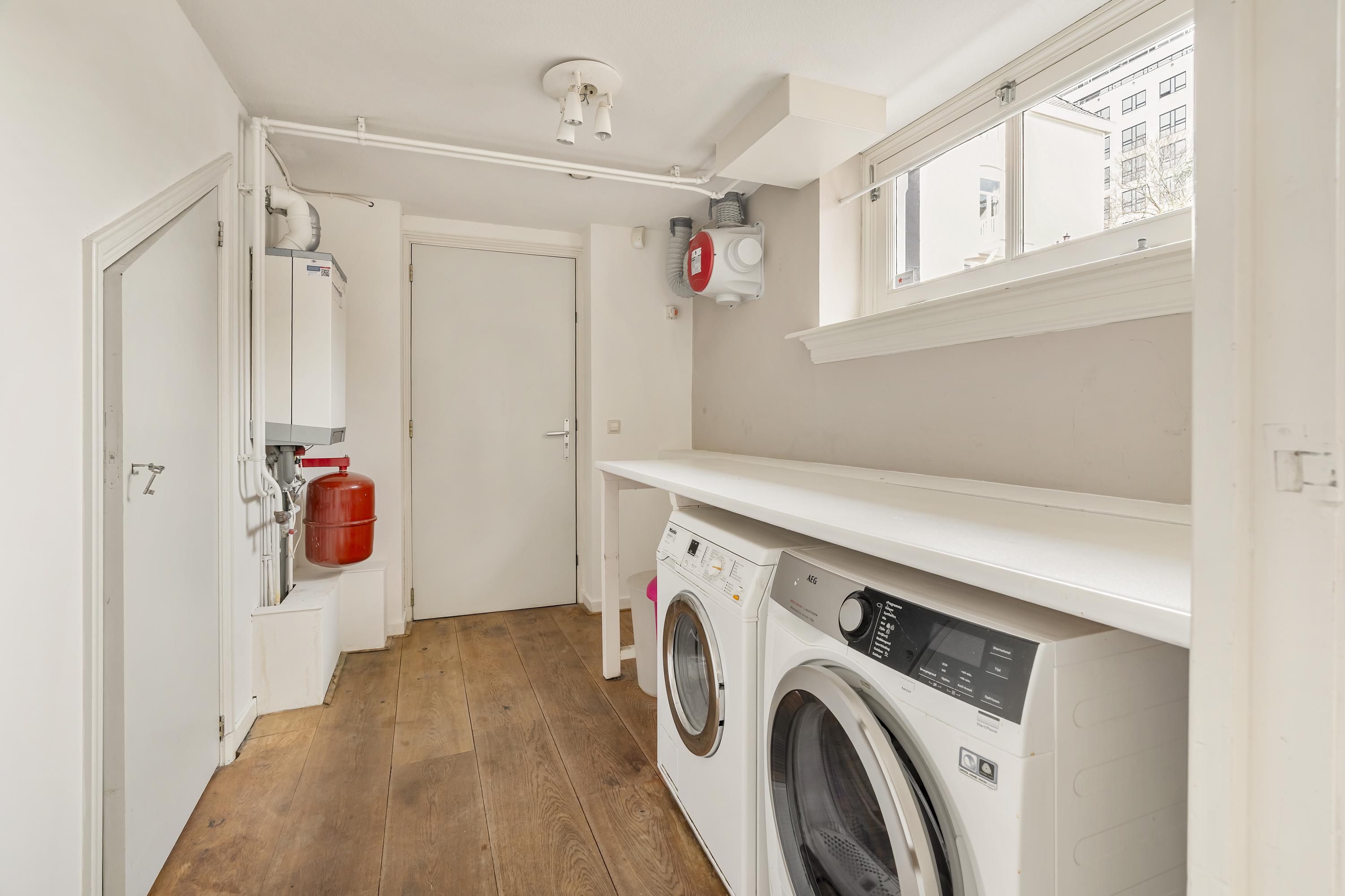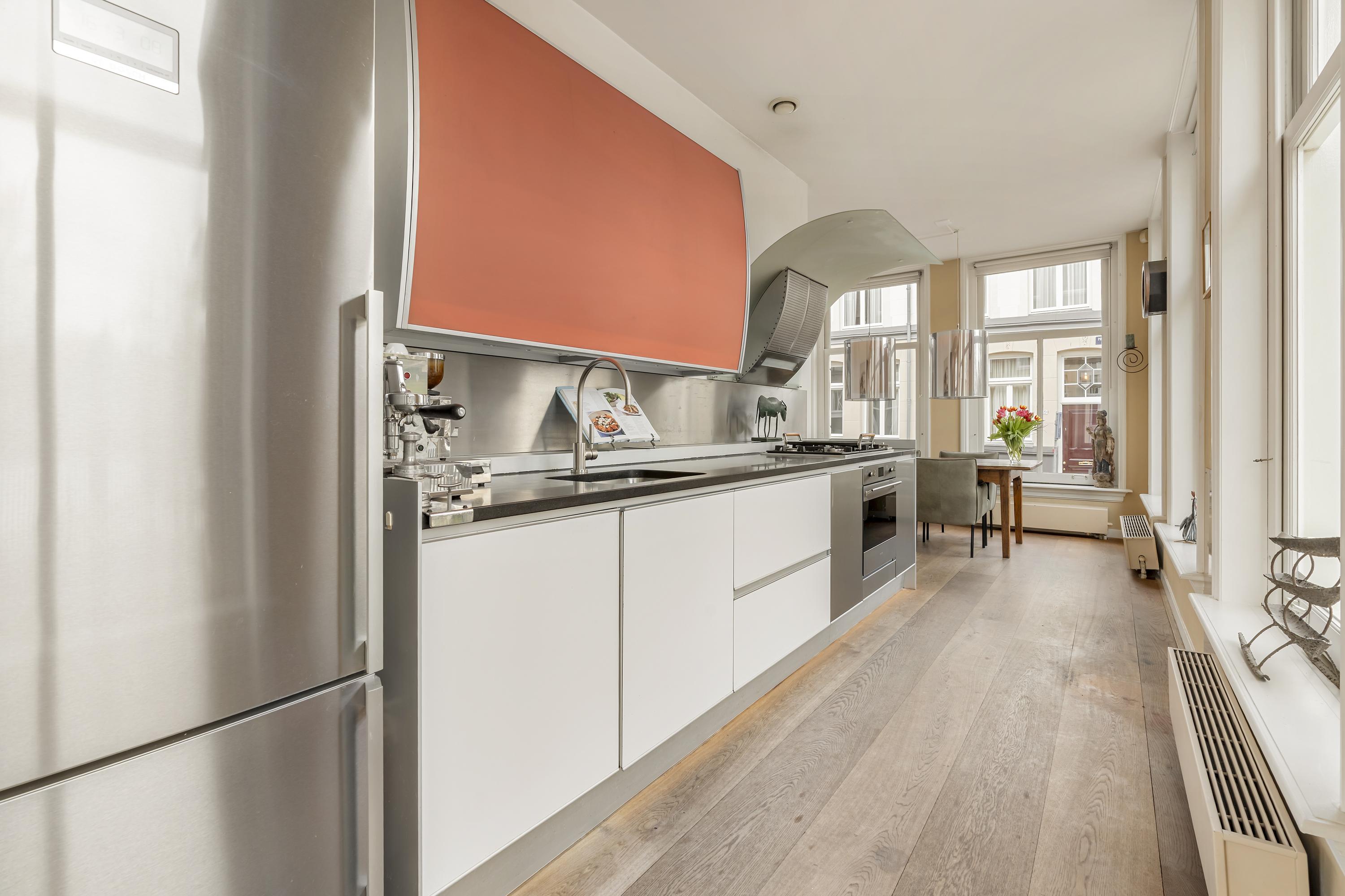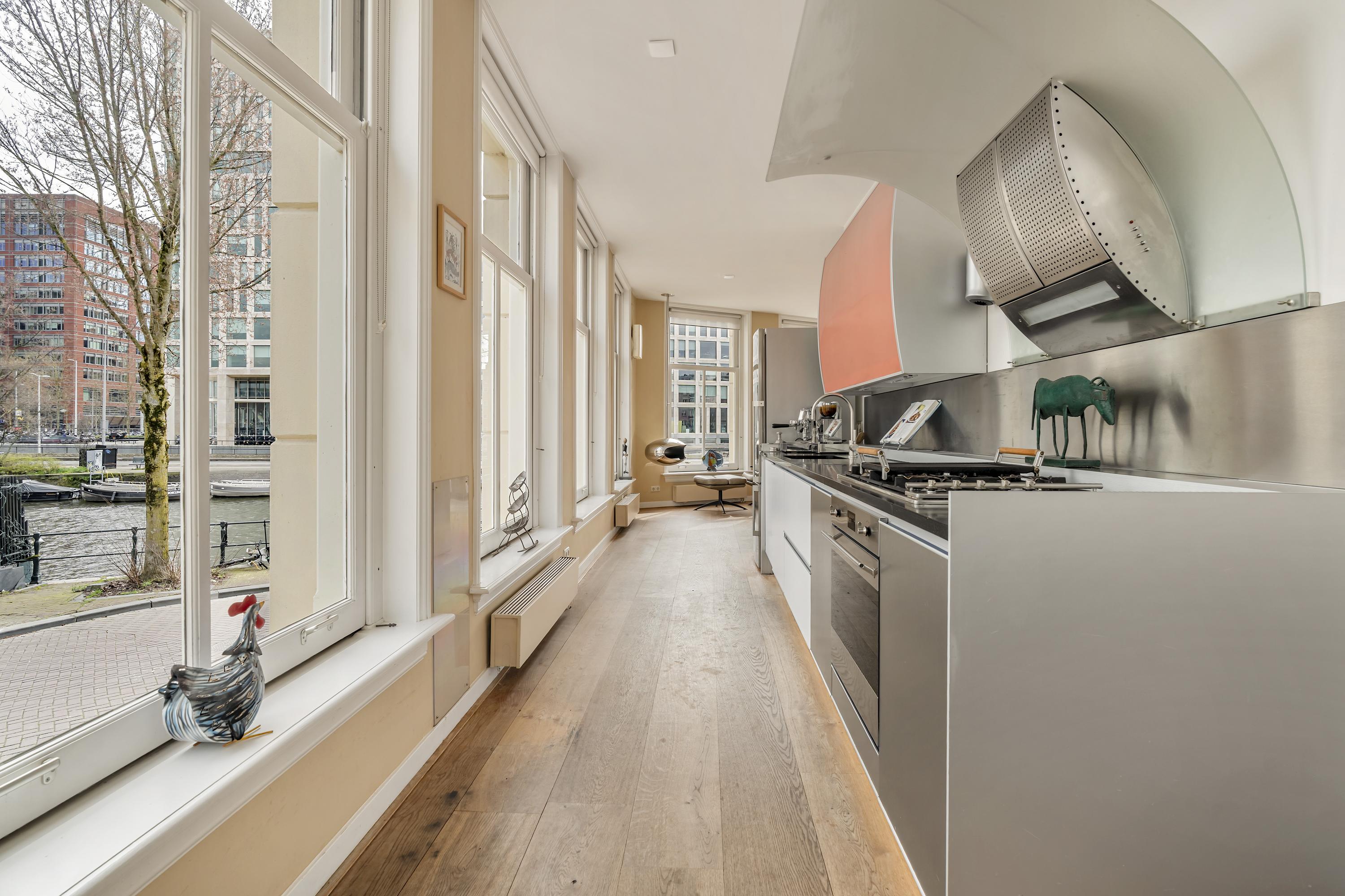 The property is further distinguished by its private entrance, high ceilings and unobstructed views over the Singelgracht. The high-quality finishes, including a stunning castle oak floor laid throughout the entire home, add warmth and character. The basement level is remarkably light due to its large windows and offers a level of comfort rarely found in lower-ground spaces.