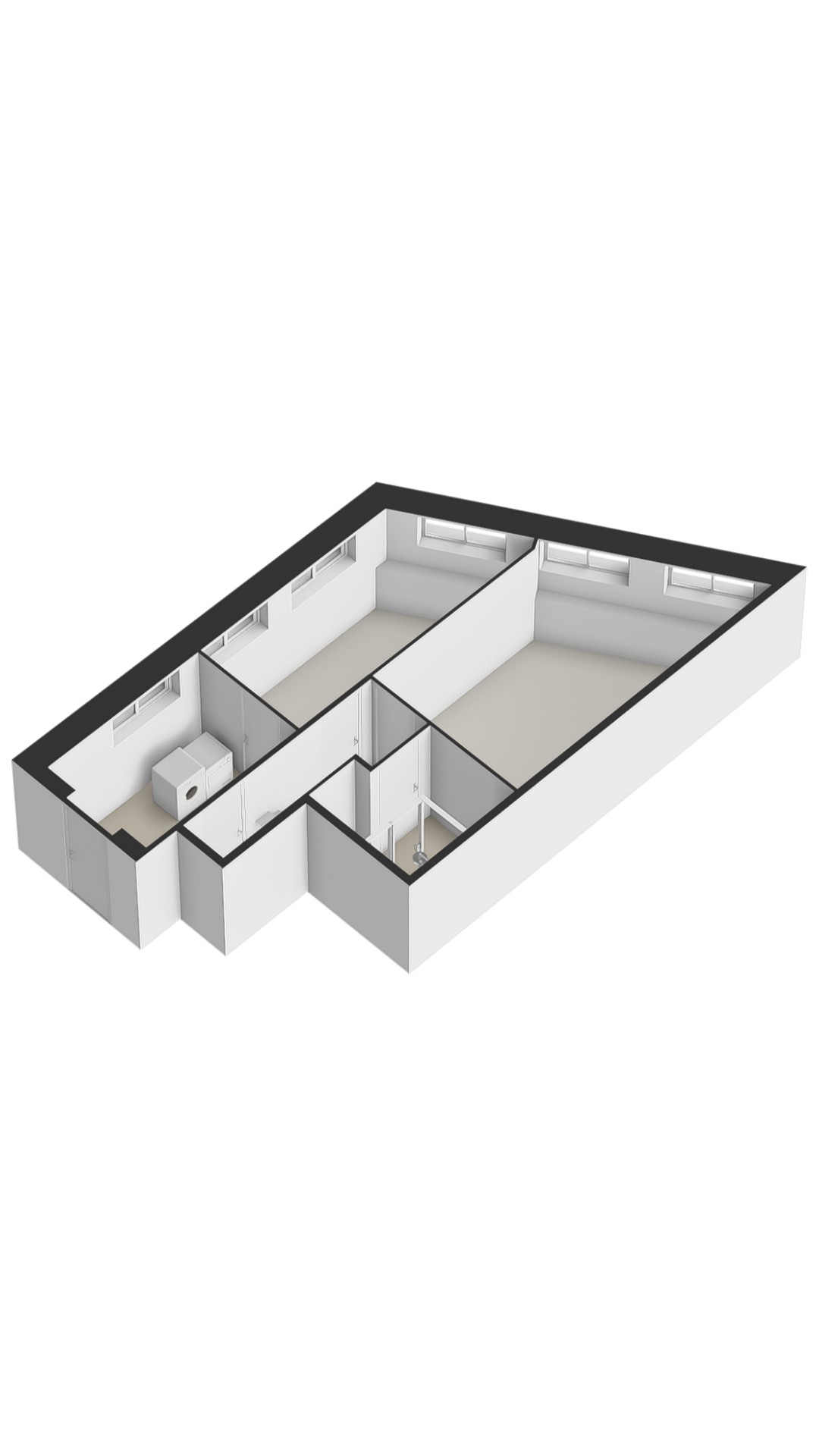 The centrally located bathroom is fitted with a shower, toilet and washbasin. In addition, there is a separate utility room with space for a washing machine and dryer. From here, there is access to the communal area with the storage units of the other apartments.