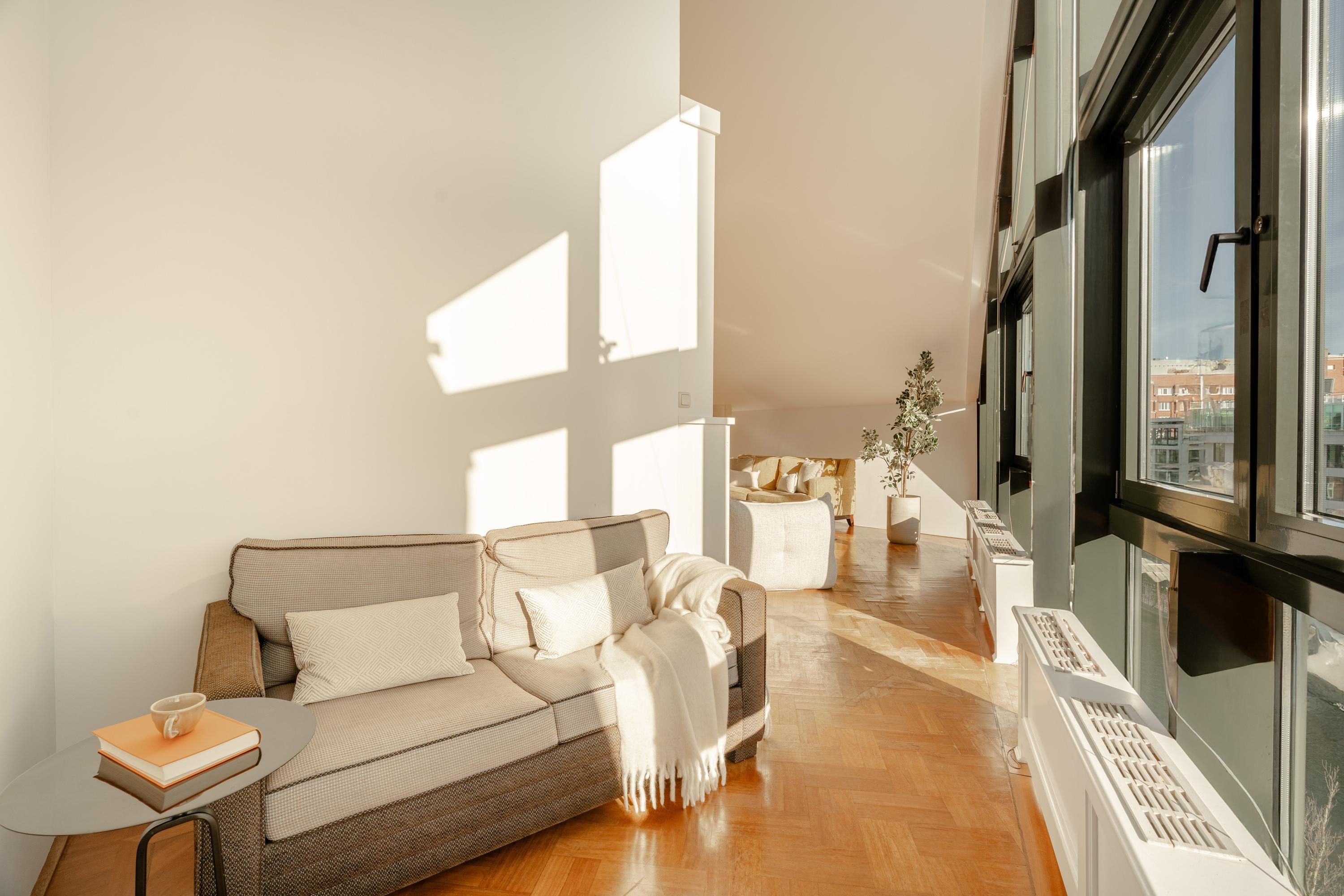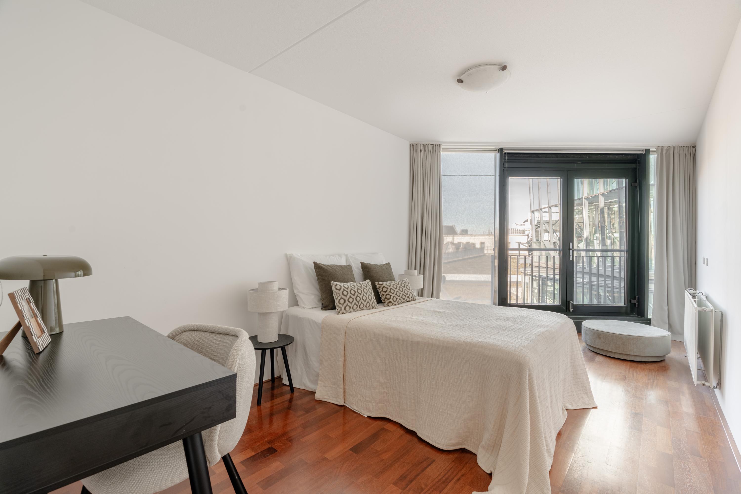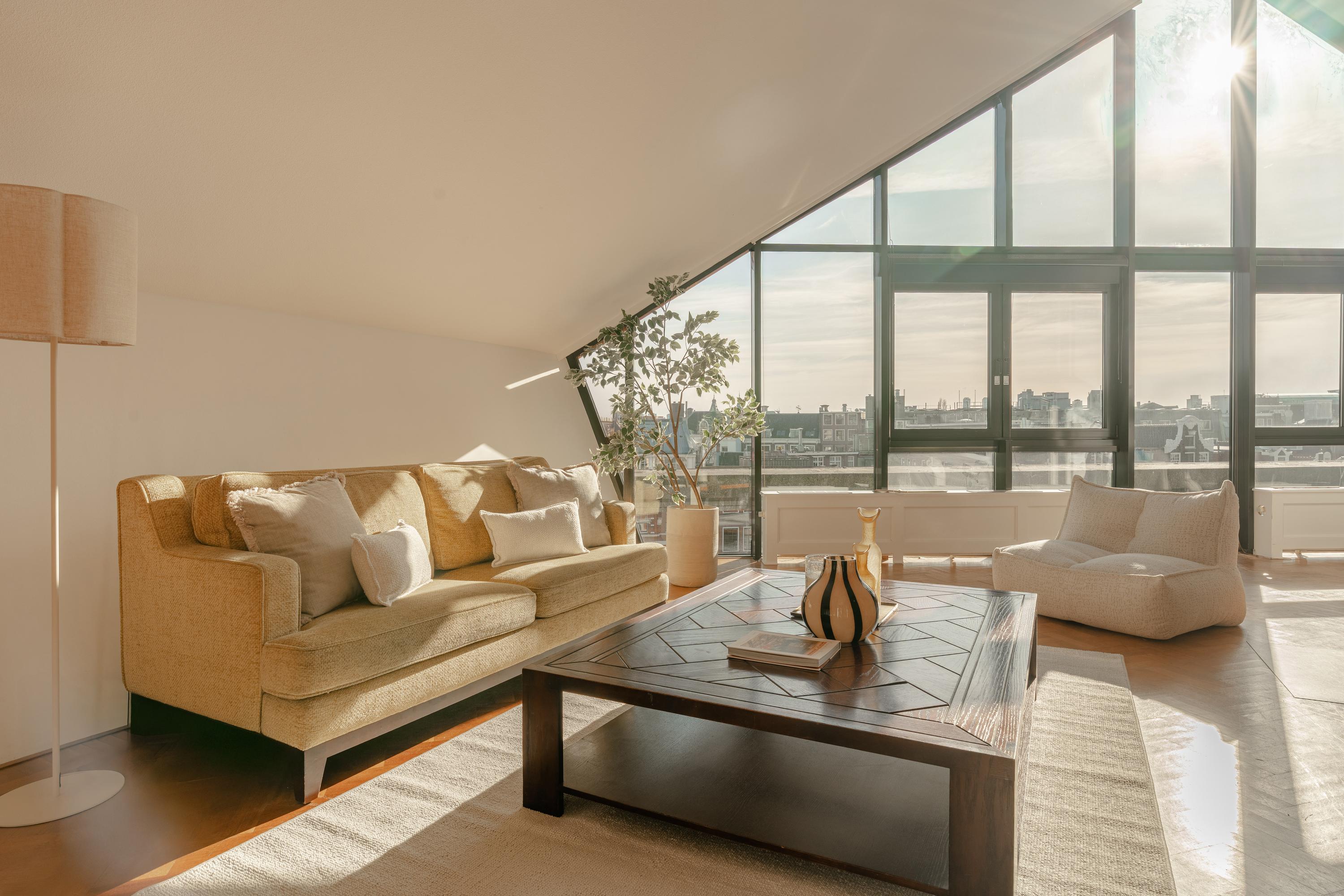 The apartment’s living level occupies the top floor, where large windows and generous ceiling heights invite daylight to animate the interiors. The living room opens to far-reaching views across the Singel and the city’s celebrated Flower Market, setting an atmosphere of refined urban calm. A half-open kitchen, complete with built-in appliances and an adjacent storage area, seamlessly connects to the dining space, ideal for gathering and entertaining.