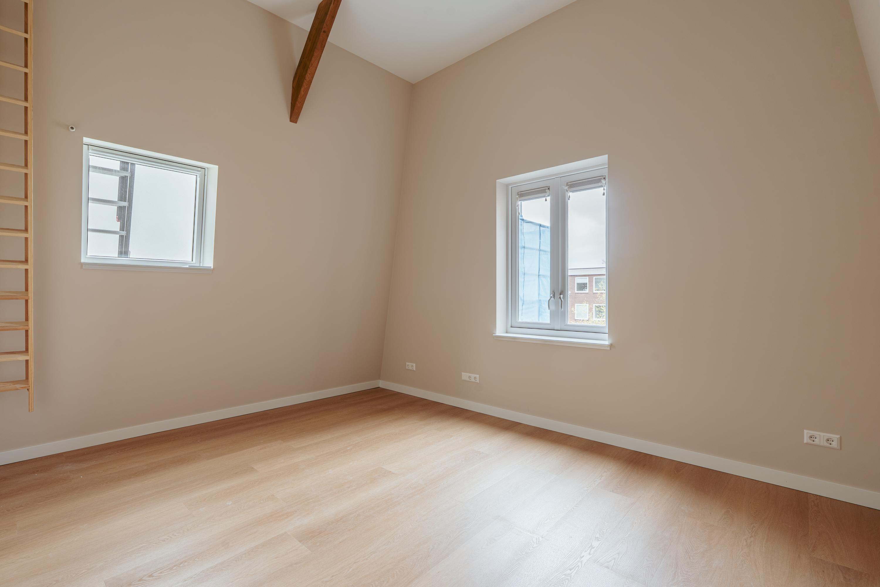 Via de overloop, waar zich een separaat gastentoilet bevindt, zijn alle vertrekken op deze verdieping toegankelijk. Aan de linkerzijde bevinden zich twee goed bemeten slaapkamers. Aan de rechterzijde ligt de royale doorzonwoonkamer, die dankzij de grote raampartijen rijkelijk wordt overspoeld met daglicht. De stijlvolle open keuken is uitgevoerd in een strak en luxe design en uitgerust met alle denkbare inbouwapparatuur, waaronder een kookeiland, combi-oven, vaatwasser, koel-vriescombinatie en volop bergruimte. De originele schouw voegt een warm, authentiek accent toe aan het geheel. Via openslaande deuren heeft u toegang tot het dakterras (ca. 32 m²): een heerlijke plek om buiten te ontspannen.