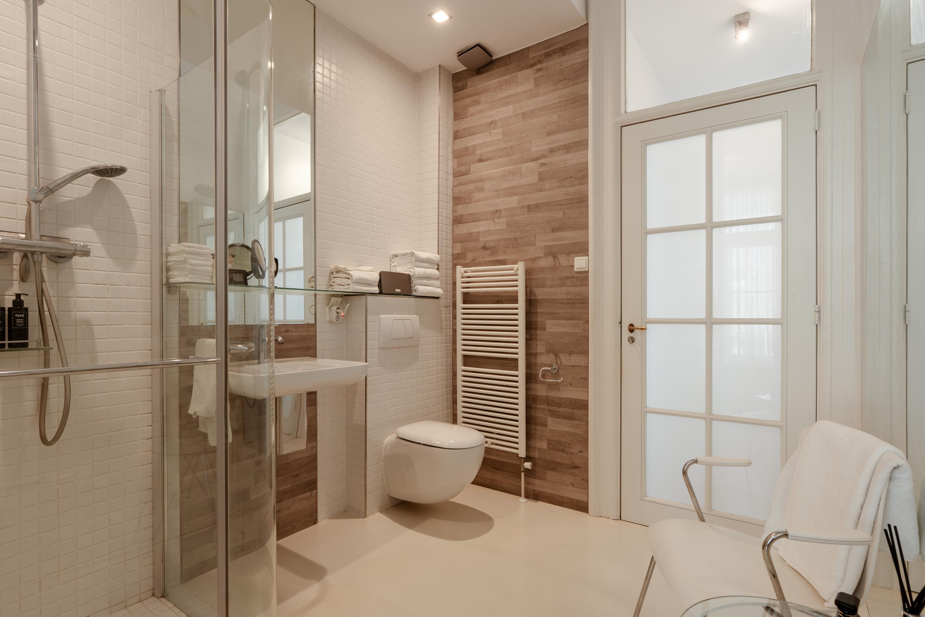 Adjacent to the bedroom is the en-suite bathroom, accessible via a sliding partition and equipped with a walk-in shower, washbasin, toilet and designer radiator.