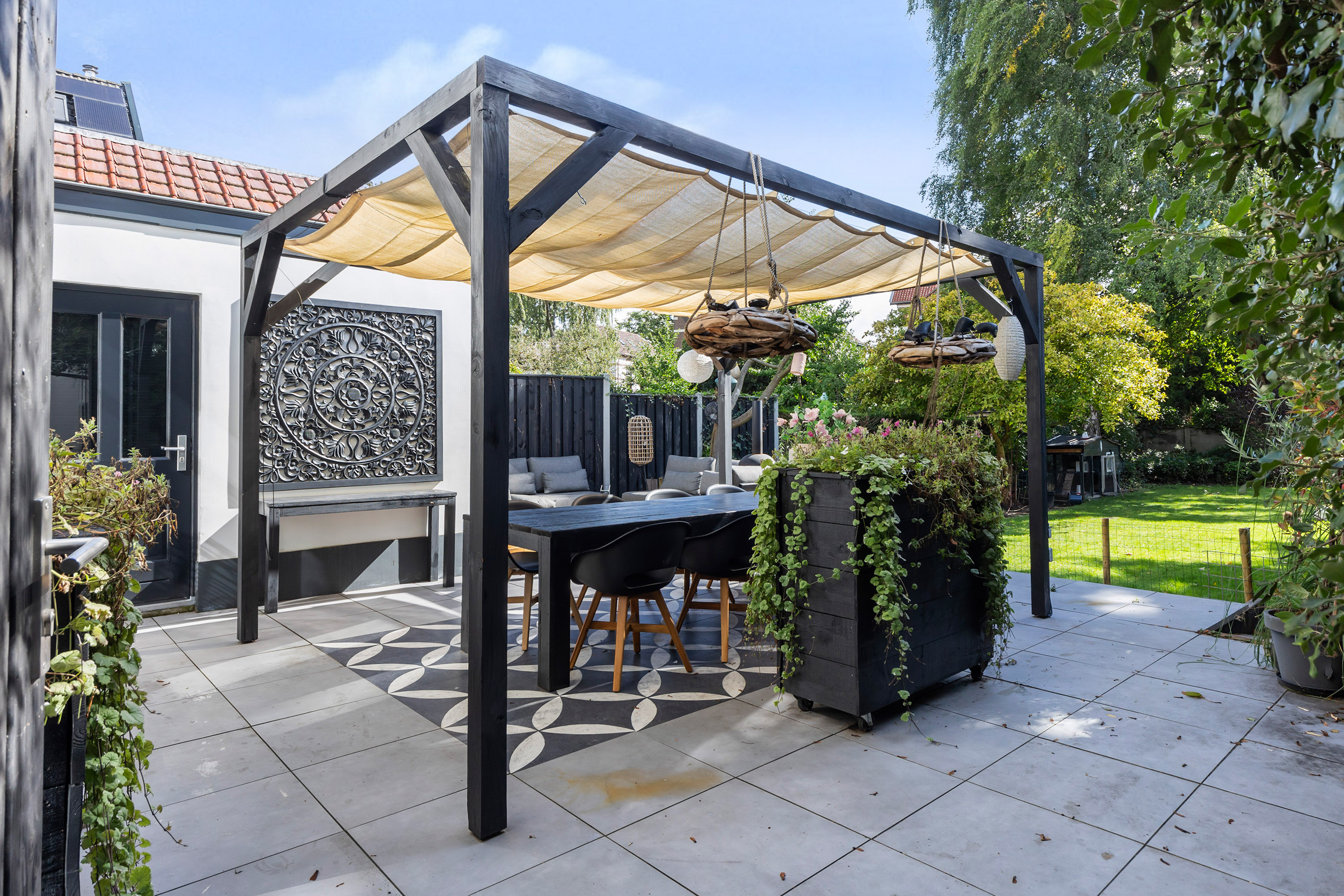 De achtertuin is circa 30 meter diep, volledig besloten en gelegen op het zuidwesten. Dankzij de volgroeide bomen en het groen rondom geniet u hier van optimale privacy. Het royale terras biedt ruimte voor zowel een grote loungeset als een eettafel, zodat u op elk moment van de dag van zon of schaduw kunt genieten. Verder is er een gazon, een kippenren en een houten berging aanwezig.