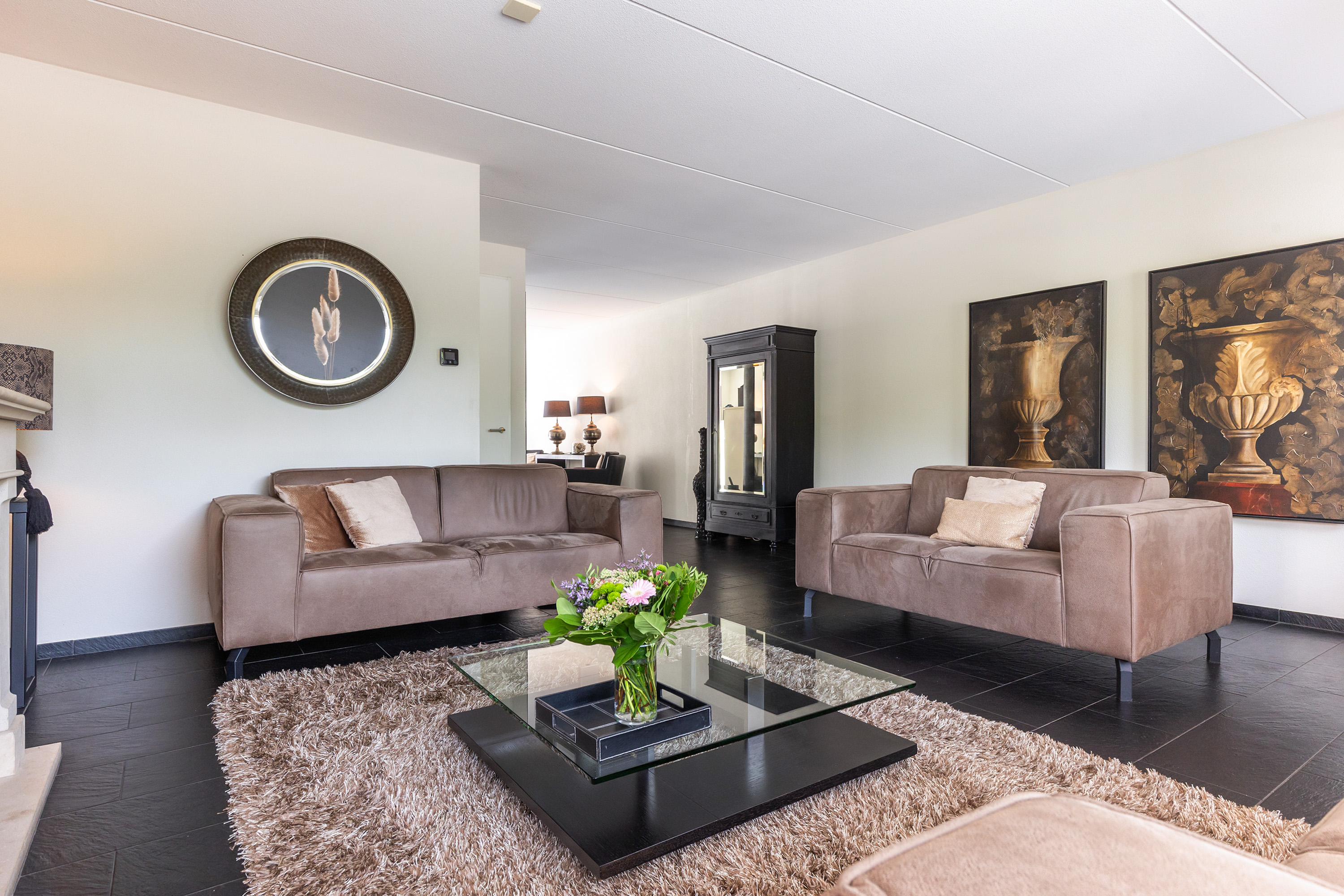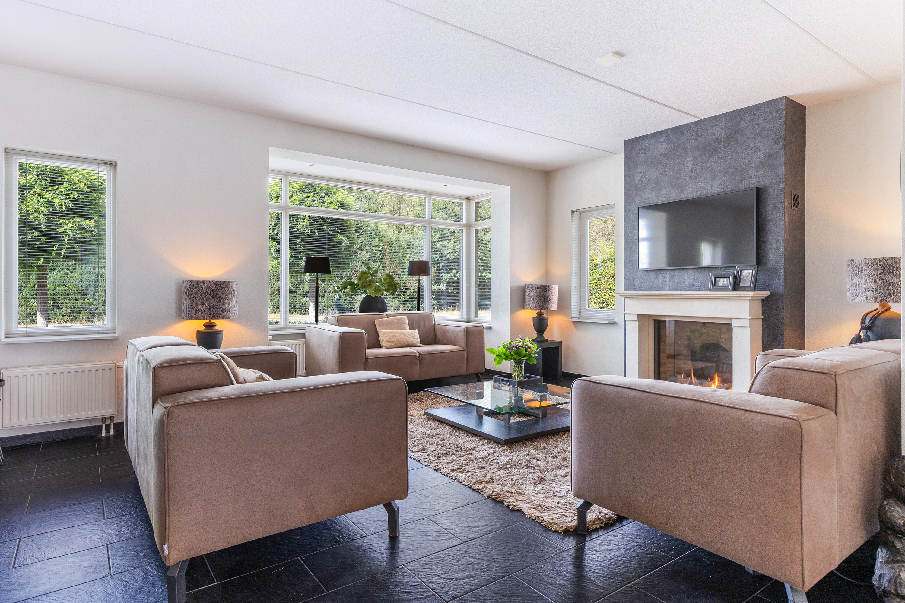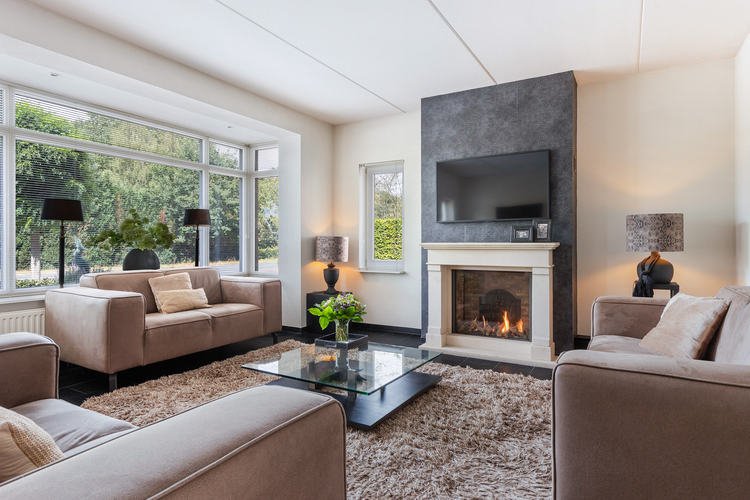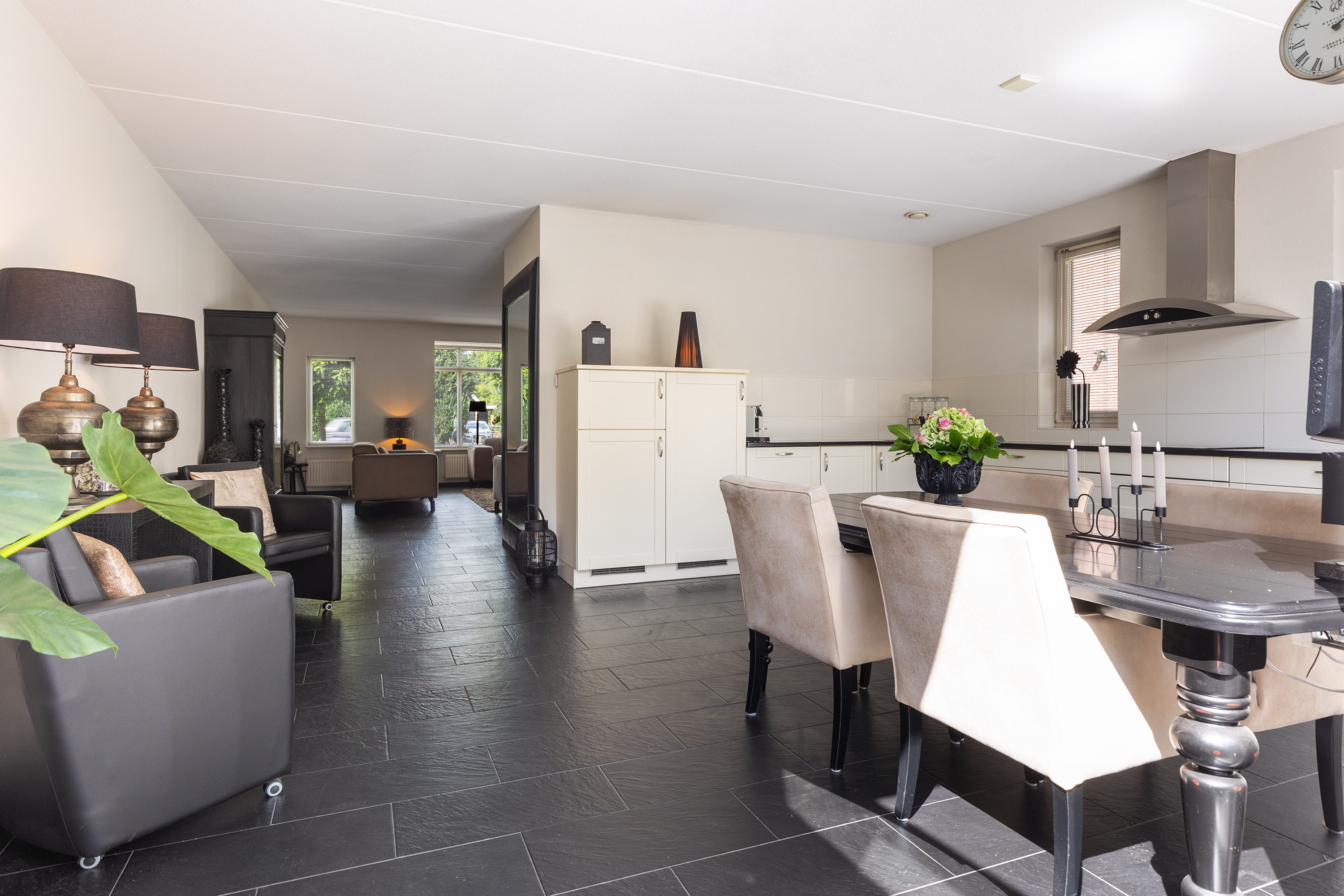 Via de lange oprit bereikt u de entree van de woning. In de hal bevinden zich de meterkast, de trapopgang en een modern toilet met fonteintje. De sfeervolle woonkamer aan de voorzijde is een lichte en uitnodigende ruimte, mede dankzij de karakteristieke erker en de sfeervolle gashaard die veel warmte en gezelligheid toevoegt. De hardstenen vloer met vloerverwarming loopt door over de gehele begane grond en zorgt voor een luxe uitstraling en aangenaam comfort.