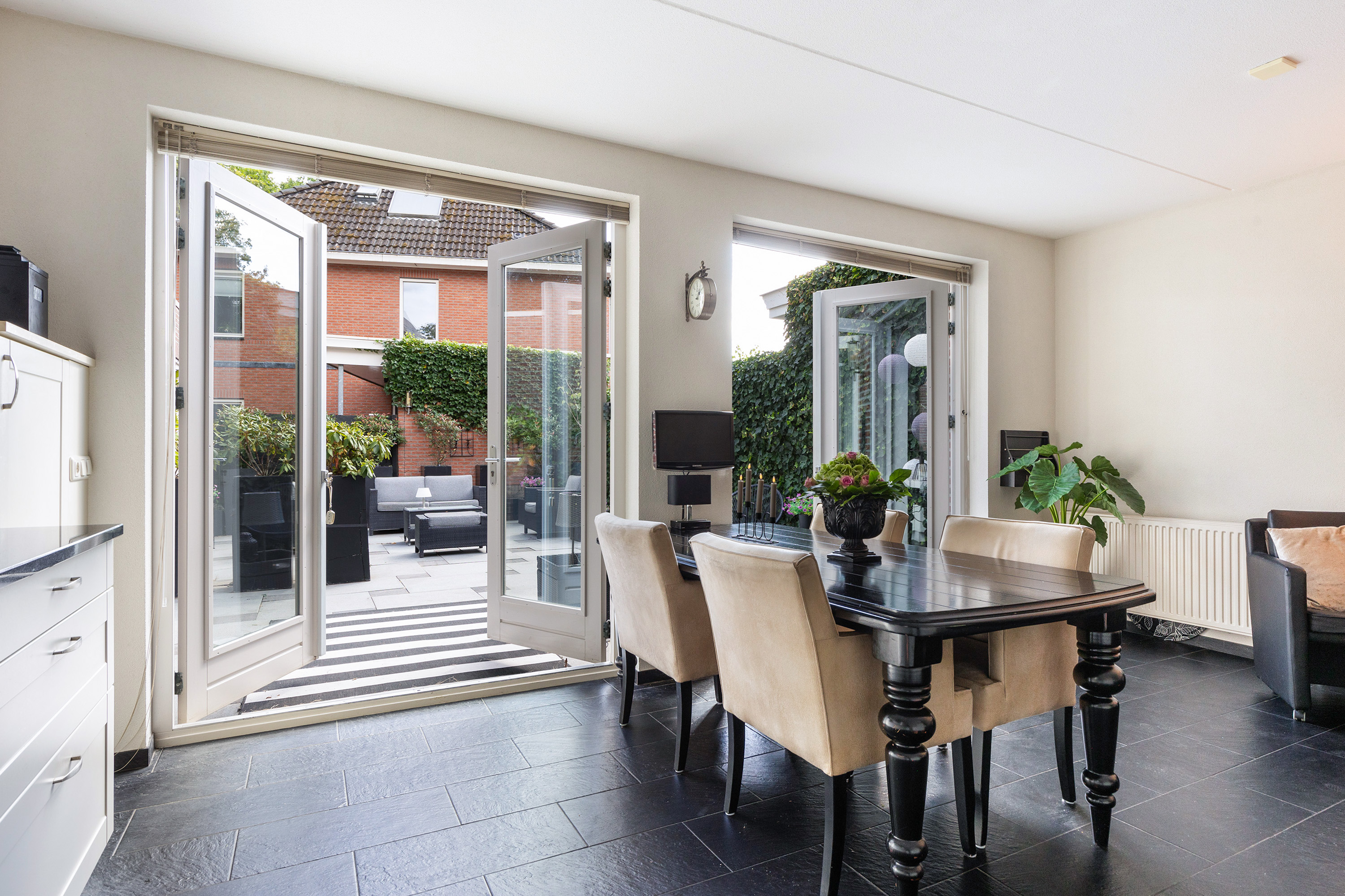 De lichte woonkamer met karakteristieke erker en stijlvolle gashaard vormt het hart van het huis. Dankzij de royale opzet en de vele raampartijen is dit een aangename plek om samen te zijn. Vanuit de woonkamer loopt u door naar de ruime woonkeuken (ca. 26 m²), waar plaats is voor een grote eettafel. De keuken is voorzien van diverse inbouwapparatuur en heeft openslaande deuren naar de tuin – ideaal om binnen en buiten naadloos met elkaar te verbinden.