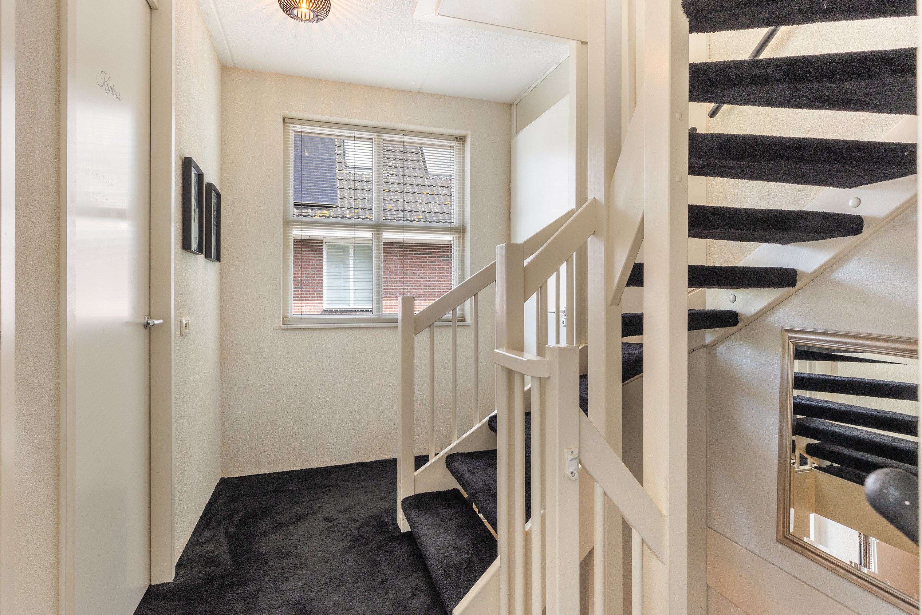 De overloop, voorzien van een zijraam, geeft toegang tot drie slaapkamers en de badkamer. De ouderslaapkamer aan de voorzijde is royaal bemeten en biedt ruimte aan een tweepersoonsbed én een grote garderobekast. Ook de tweede slaapkamer bevindt zich aan de voorzijde en is momenteel in gebruik als kantoor, maar kan eenvoudig weer dienstdoen als slaapkamer. De derde slaapkamer aan de achterzijde kijkt uit op de tuin.