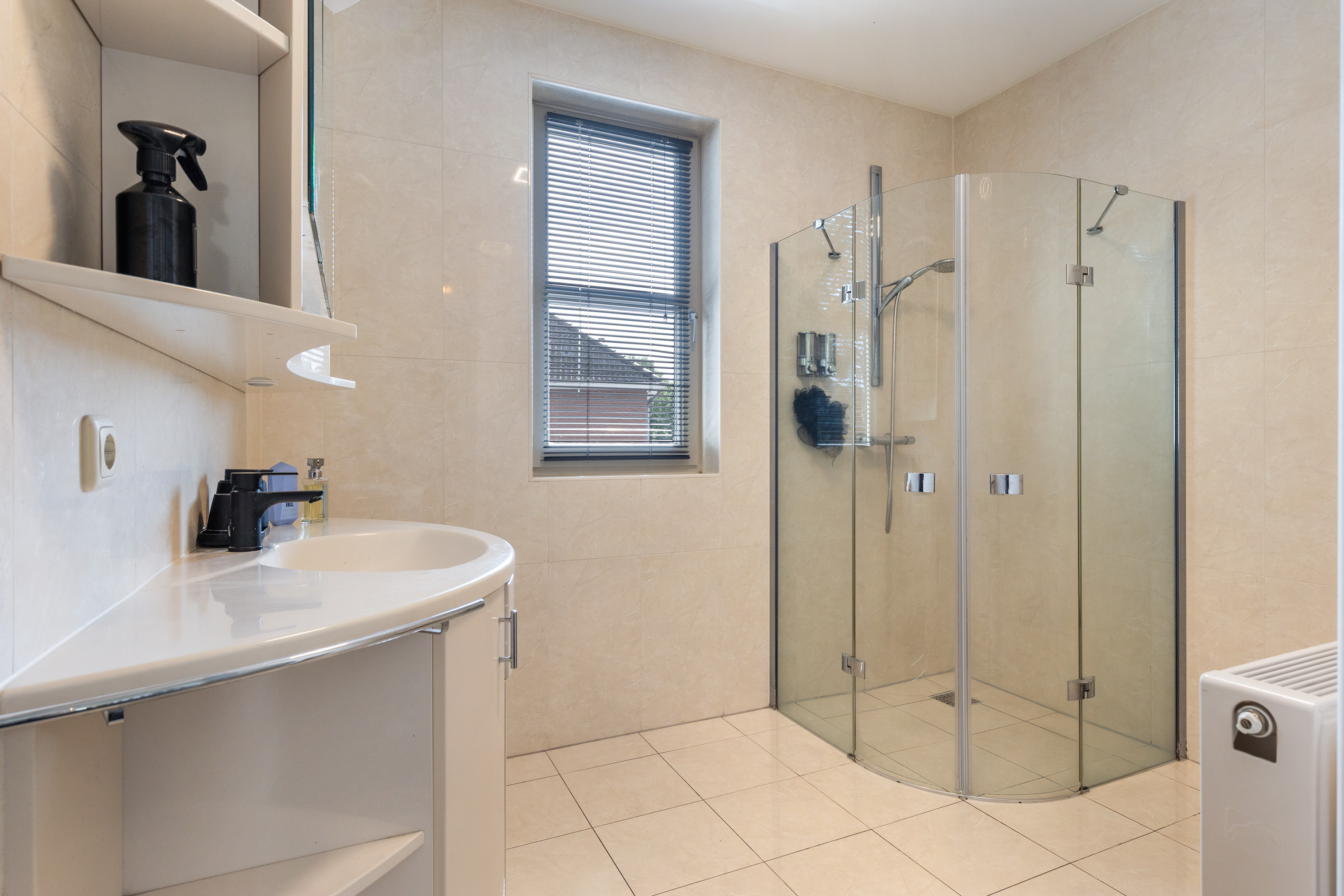 De moderne badkamer is volledig betegeld en uitgerust met een douchecabine, wastafelmeubel en een tweede toilet. Dankzij het openslaande venster en de mechanische ventilatie is er altijd voldoende daglicht en frisse lucht.