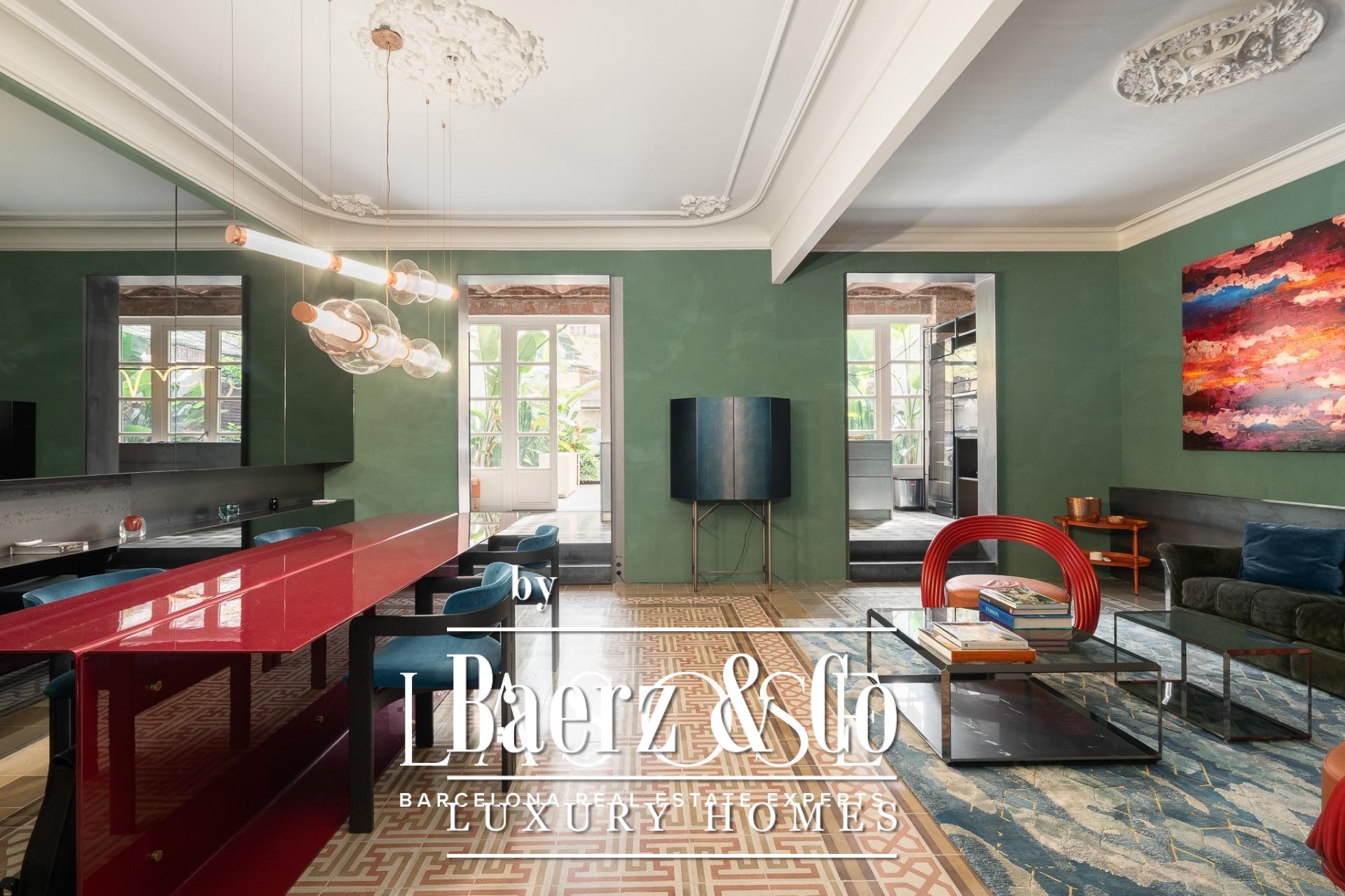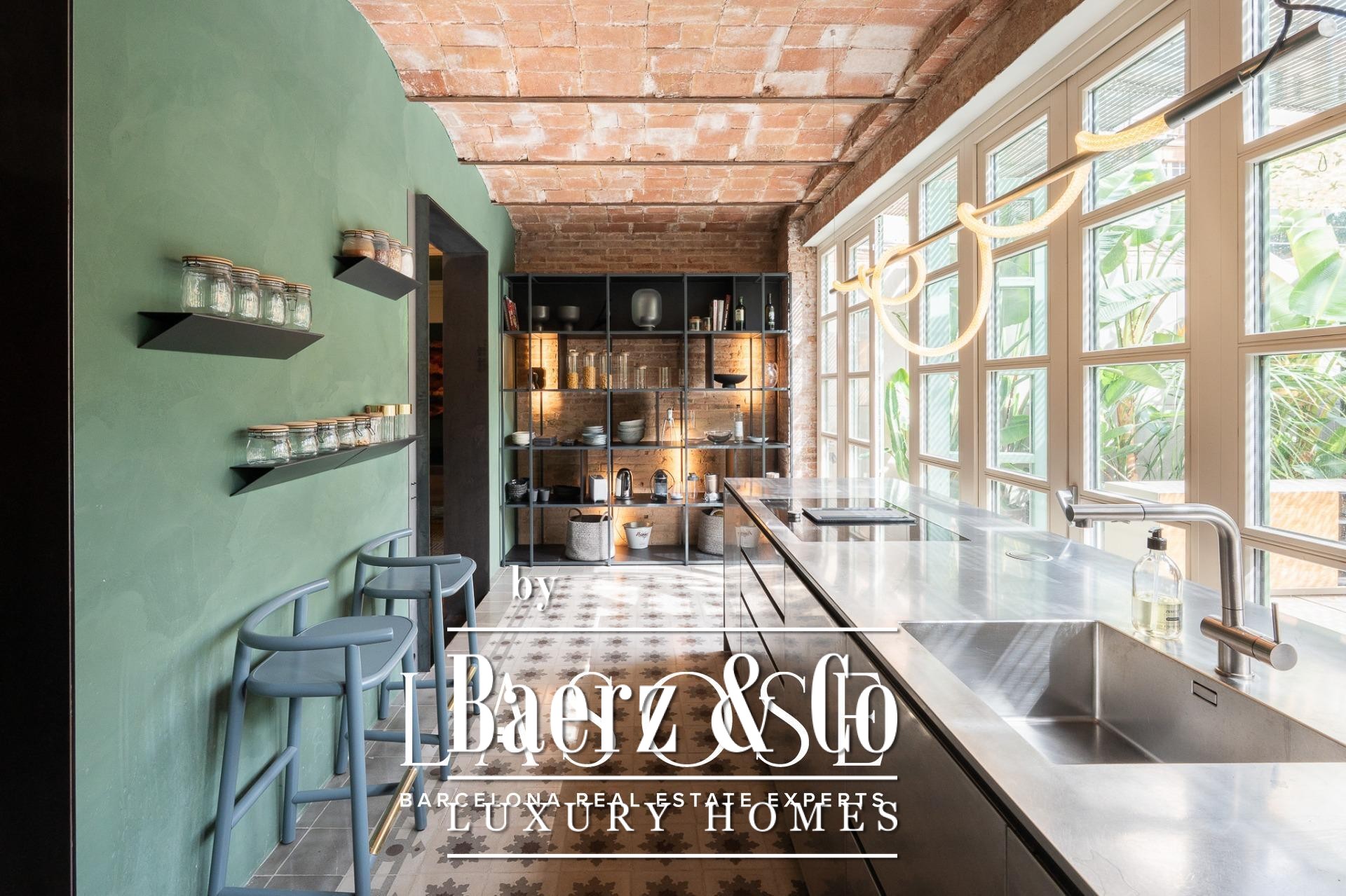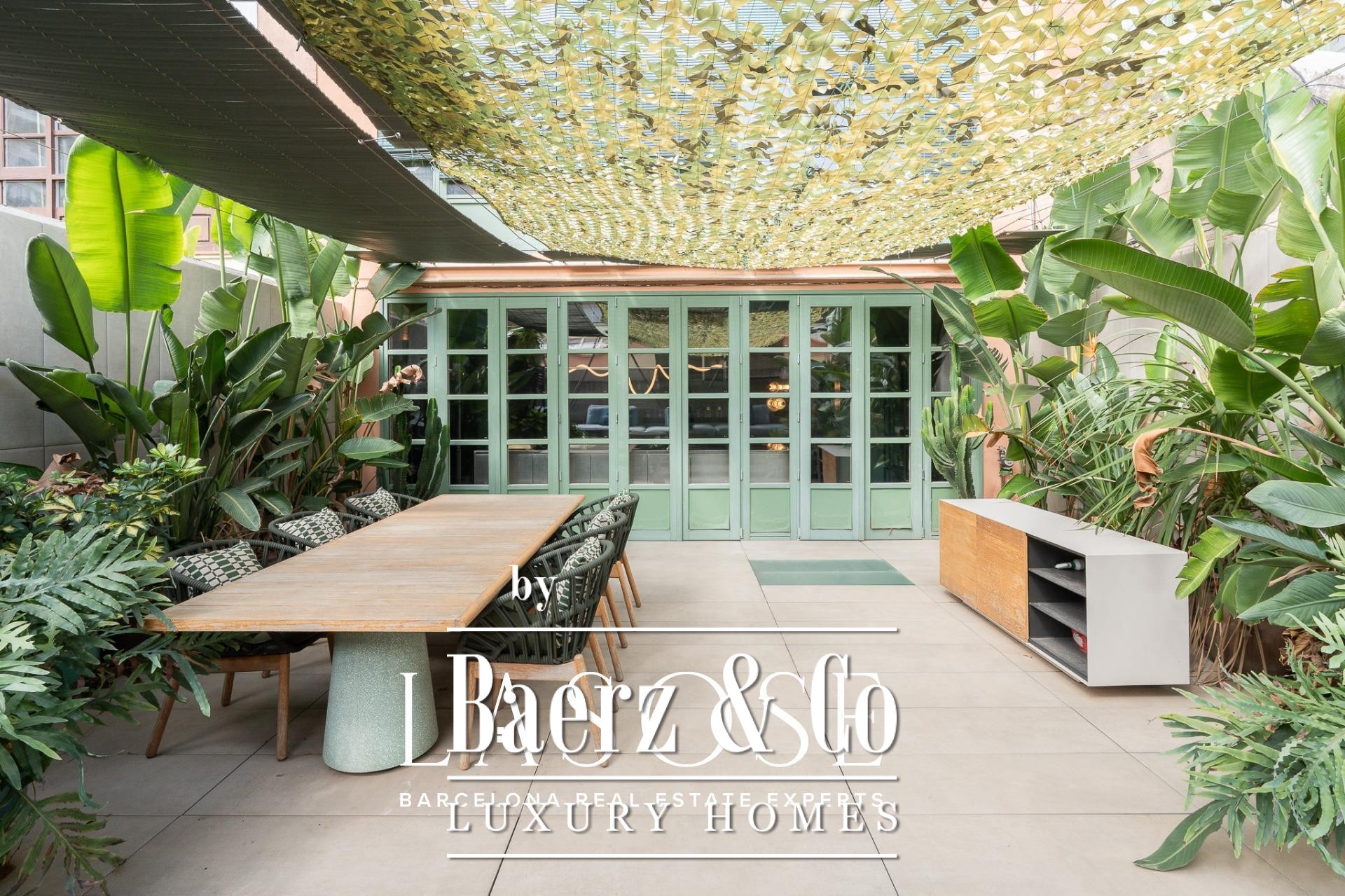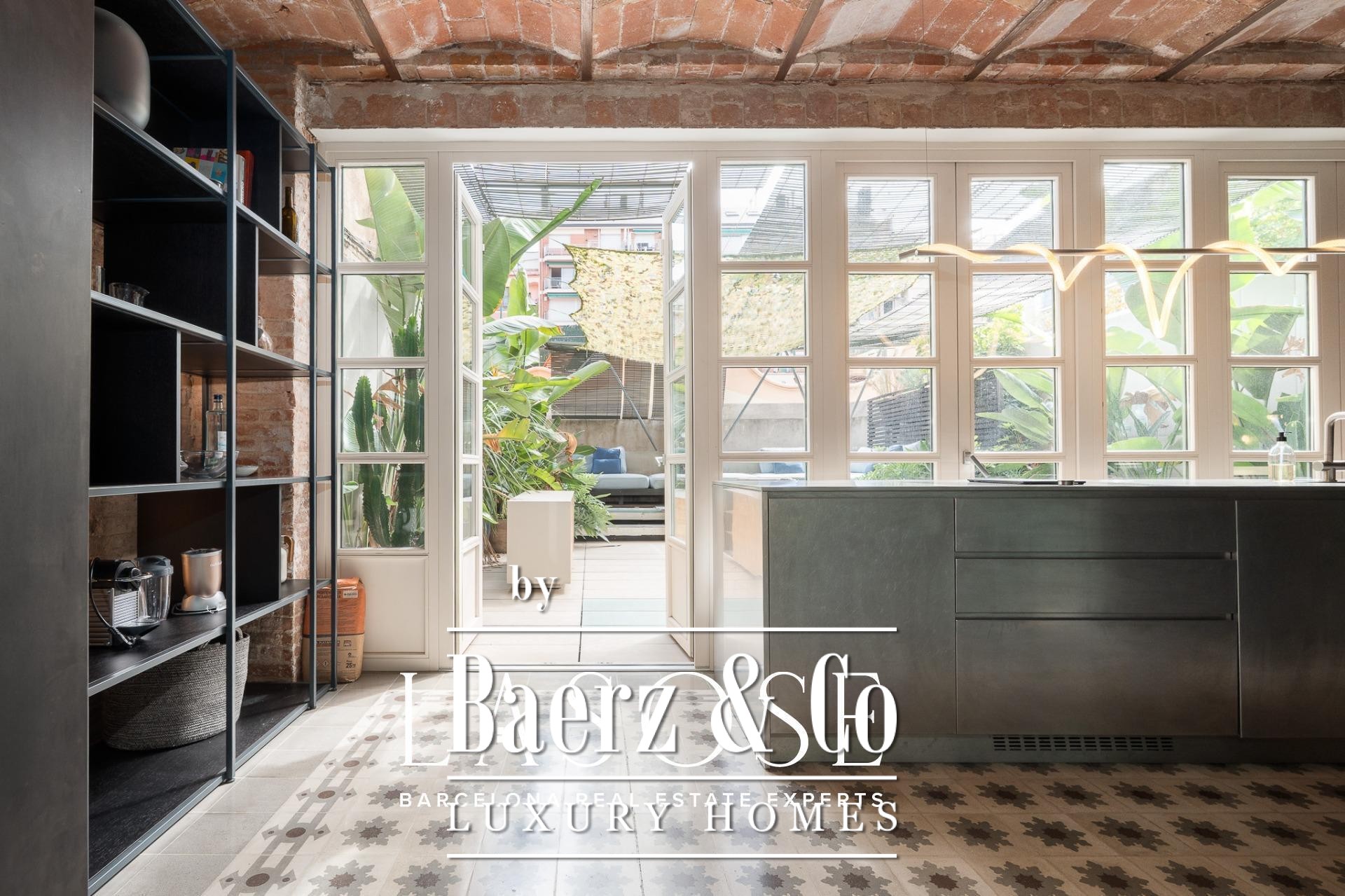 room, ideal for entertaining guests or enjoying with family. The high ceilings provide a sense of spaciousness and brightness, while the semi-open kitchen allows natural light to flow throughout all areas. From here, there is direct access to the 60 sqm terrace, with lush greenery and south-facing orientation, making this outdoor area a natural extension of the interior. A serene spot overlooking a quiet courtyard: the perfect place to escape the hectic rhythm of the city.. . Eixample is one of the most sought-after districts in Barcelona, making the location ideal for both a first or second residence. Having such a spacious and private outdoor area is a real privilege today, allowing you to enjoy the sun and Mediterranean climate at any time.. . In short, this property perfectly combines the best of modernist architecture with the comfort of a contemporary home. Original ceiling mouldings, exposed brick walls, mosaic hydraulic tiles, and Catalan vaulted ceilings are some of the period features that make this apartment truly one of a kind in Barcelona.