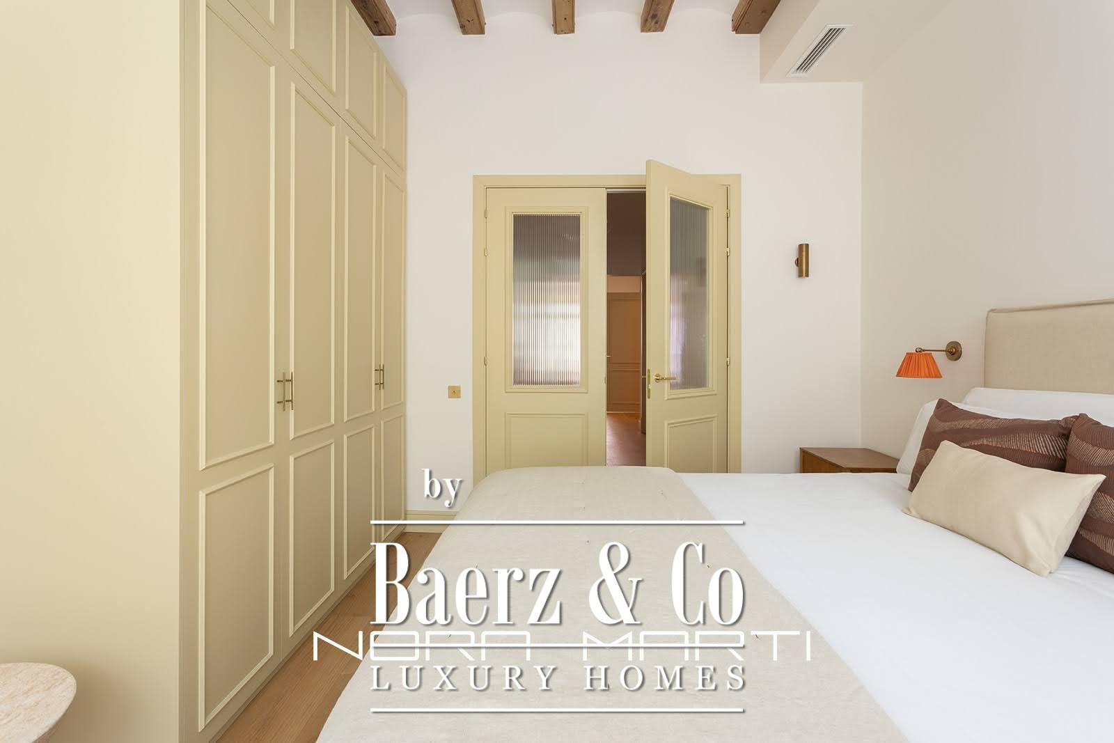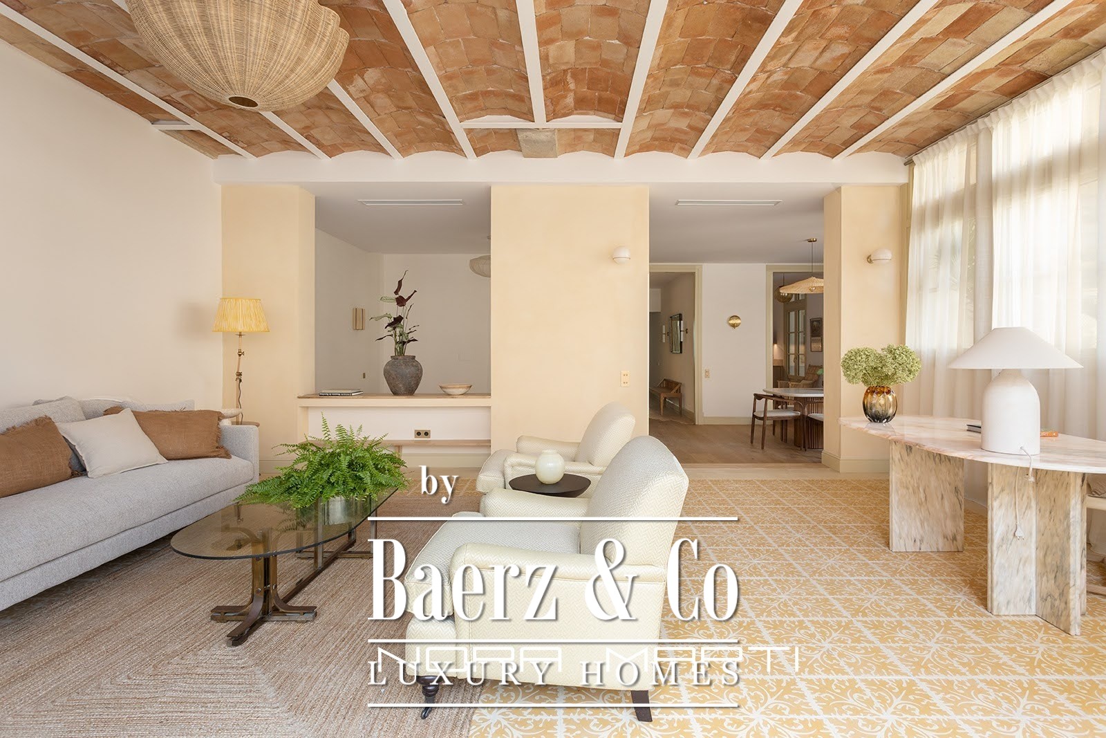 The luxurious renovation focuses on quality and detail while preserving the building's original features and charm. A Catalan vaulted ceiling is visible throughout the apartment, enhancing the feeling of spaciousness and light. The ceiling transforms the living room into a truly exceptional space, featuring handcrafted local tiles and floor-to-ceiling windows that open onto a tranquil terrace; this room is unique and the heart of the living area.