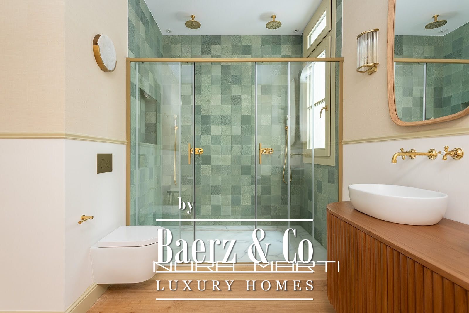 The interior design incorporates natural elements to create a warm and modern feel while maintaining an air of elegance. All three exterior bedrooms feature large double beds, built-in wardrobes, and en-suite bathrooms. The aged brass bathroom fixtures are from a local Catalan company known for its design and quality. Natural oak flooring covers the entire apartment; the wider-than-usual planks suggest a more modern approach to traditional, high-quality flooring. Underfloor heating throughout offers understated luxury, as does the dual-zone climate control system, adjustable in each room. The light fixtures, sourced from both Catalonia and England, feature decorative and functional pieces, including vintage and antique elements. The apartment's inviting green terrace adds another dimension, a space for entertaining, relaxing, and enjoying the feeling of spaciousness in the heart of Barcelona.