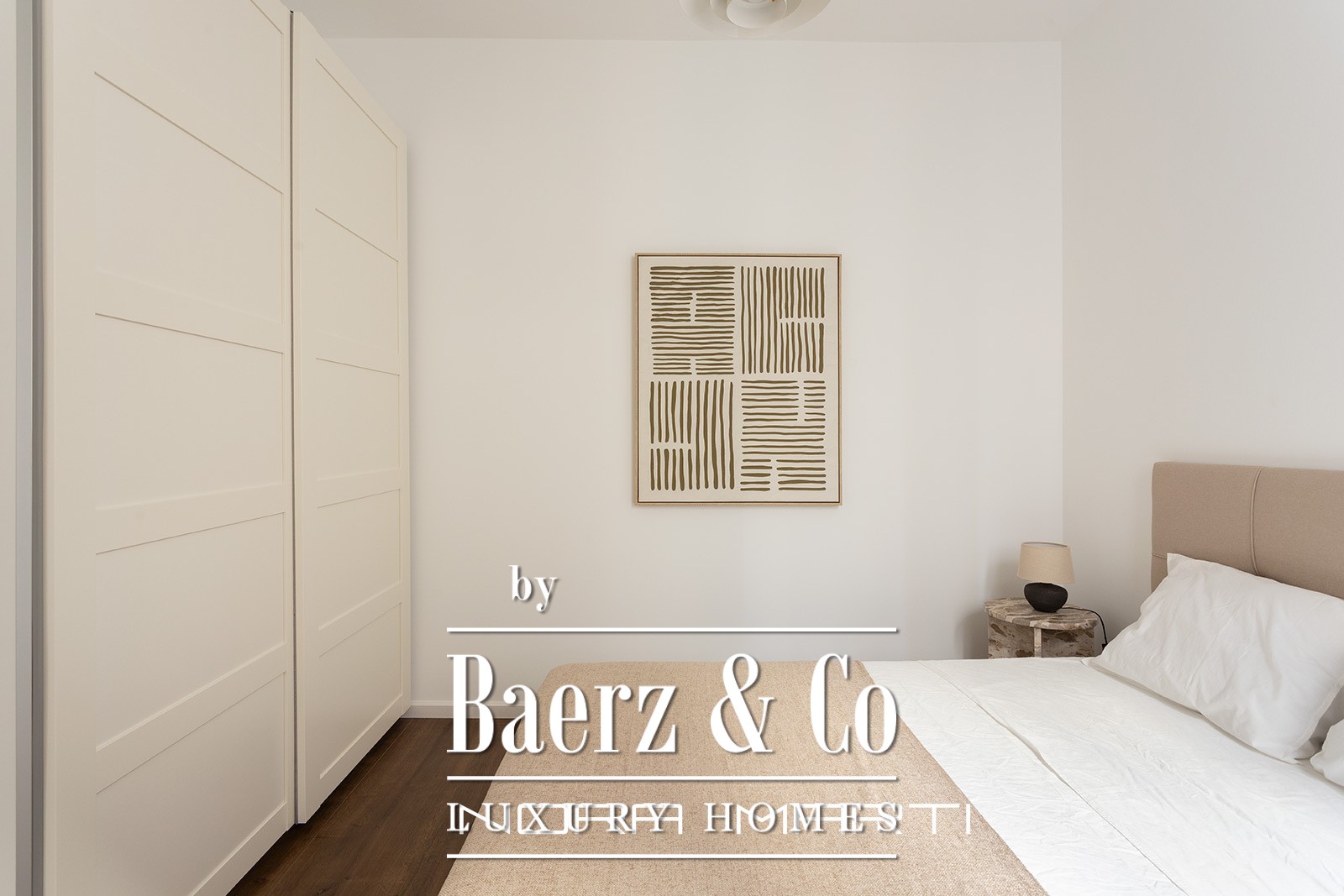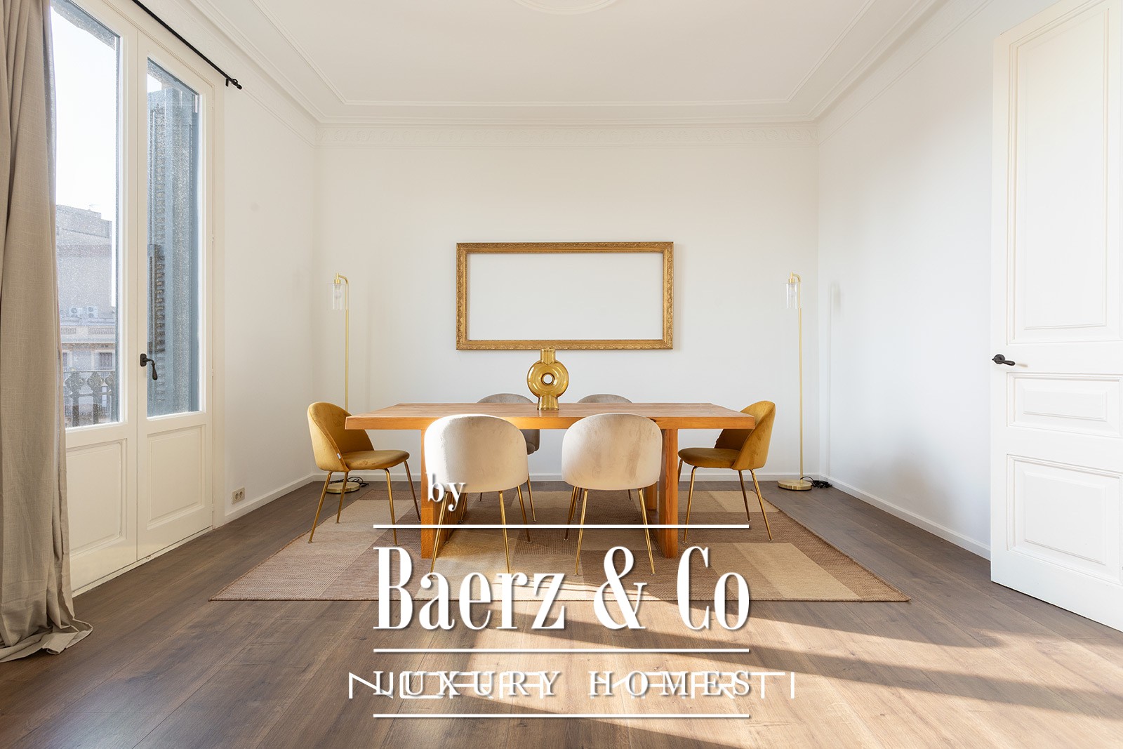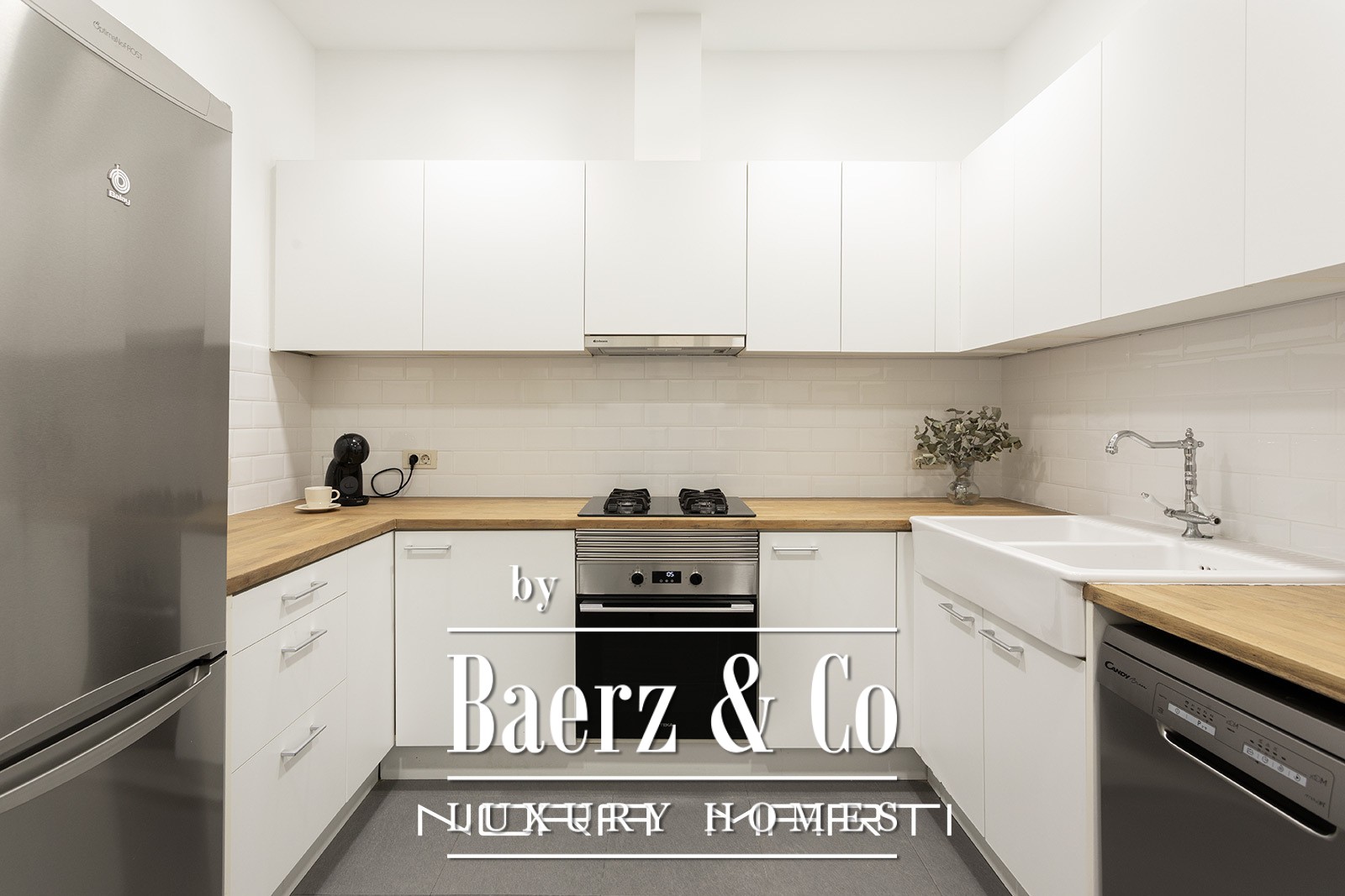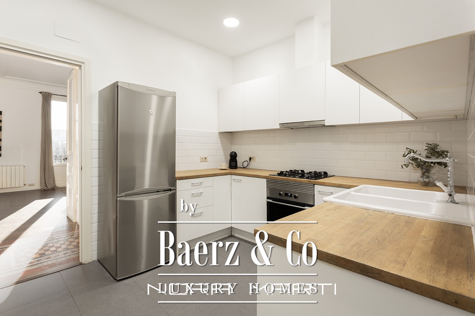 The 152 m² apartment has been extensively renovated, bringing contemporary sensibility to historic bones. Inside, refined modern furnishings lend clarity and cohesion, setting the tone for discreet urban living. The layout features three bedrooms, including one double and two singles, and two bathrooms, creating a balance of private and social spaces. The living room’s tall windows, characteristic of its era, saturate the interiors with natural light, enhanced by a favorable orientation and the warmth of parquet floors. A fully equipped kitchen with a breakfast area adds comfort to the daily rhythm.