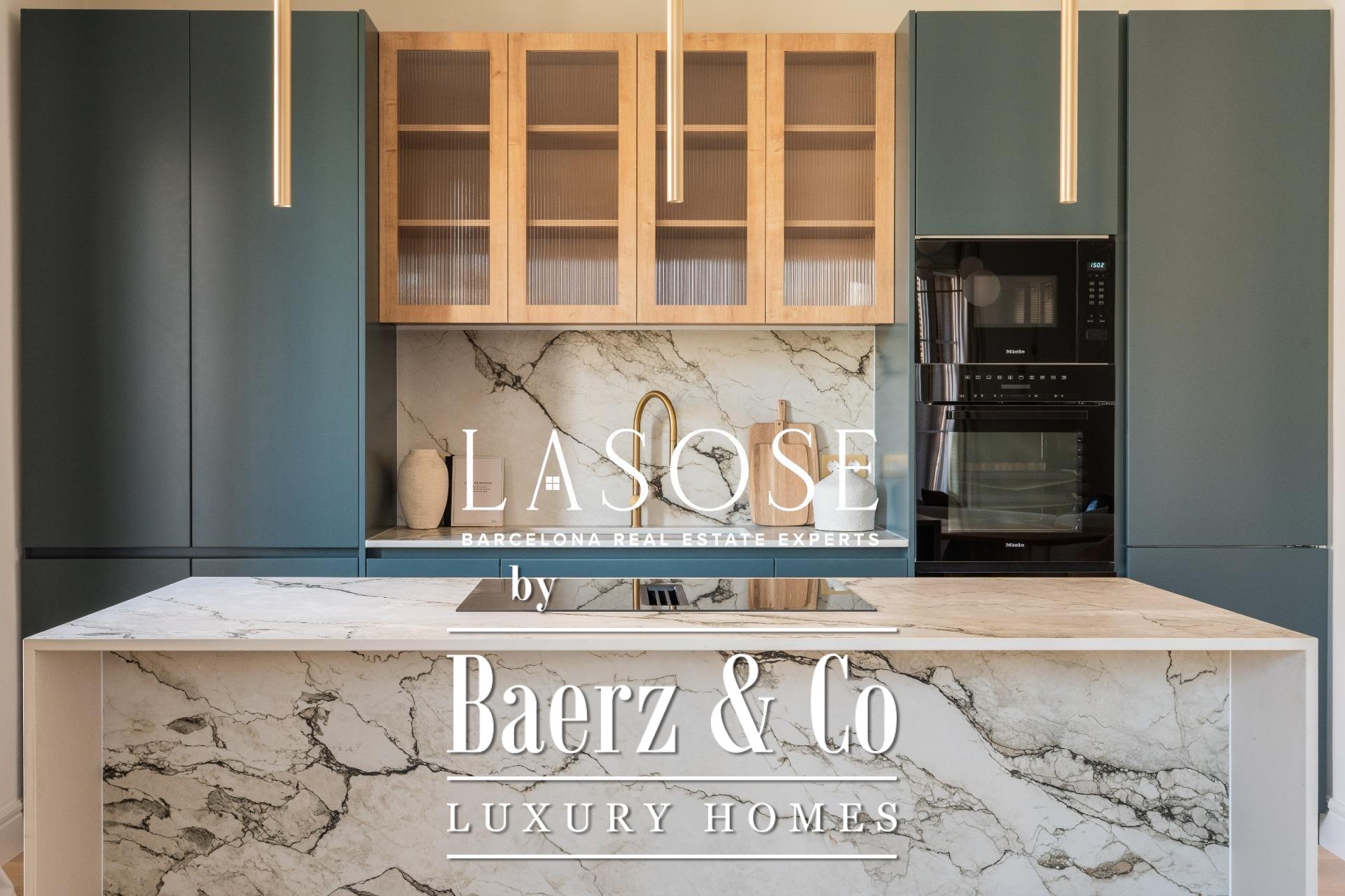 The penthouse has undergone a comprehensive renovation using high-end materials, yet preserves select original features such as hydraulic tile floors and wooden carpentry. The interior includes three double bedrooms, two of which are en-suite, and three full bathrooms. The spacious living-dining area is anchored by an open-plan designer kitchen with a central island, Miele and Liebherr appliances, Neolith countertops, and lacquered cabinetry. Balconies, a storage room, and a dedicated laundry area enhance daily living. The building itself offers an elevator and concierge service, underscoring the commitment to comfort and security.