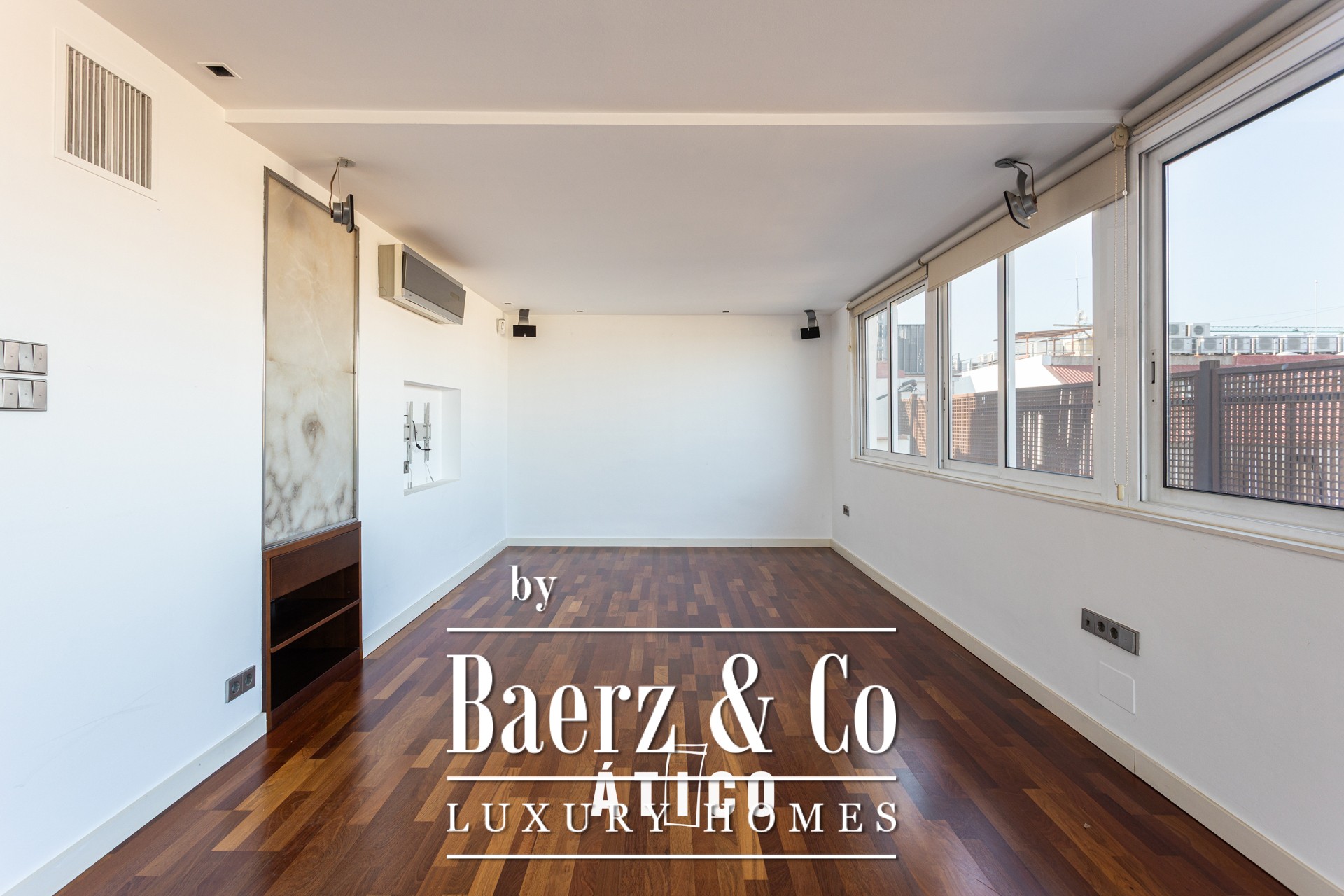 At the heart of the penthouse are two expansive terraces: one facing east framing panoramic views of the coastline, the other westward towards Tibidabo mountain, capturing the essence of Barcelona’s landscape. The kitchen, featuring a breakfast area, awaits personalisation and includes a dishwasher for convenience. Parquet floors run throughout, adding warmth underfoot, while practical amenities such as concierge service and two elevators reflect refined urban living.