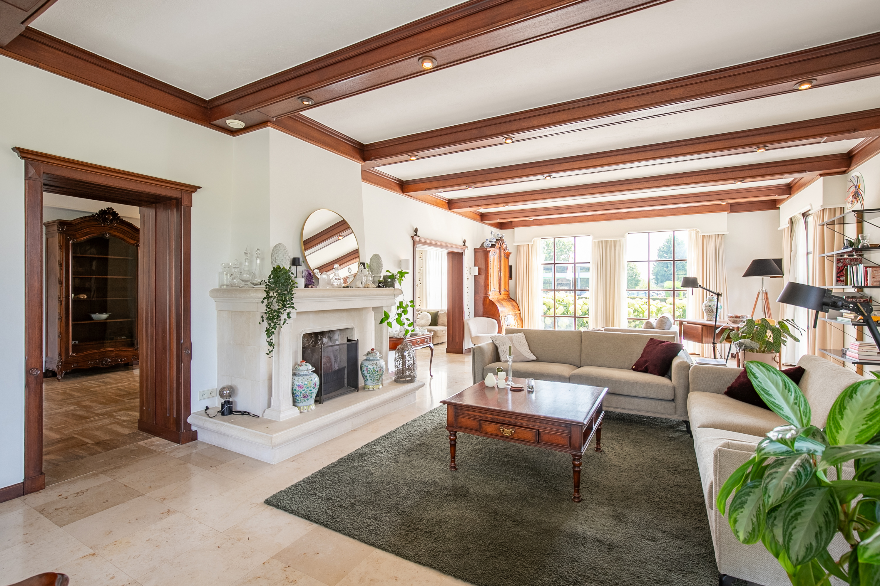 The spacious hallway features a marble floor with underfloor heating, a staircase to the first floor, cloakroom, and guest toilet. The living areas offer a bright and open layout, including a cozy fireplace, dining room adjacent to the kitchen, and a front-facing sitting room. Large windows and the open connection to the covered terrace create a wonderfully spacious feel.