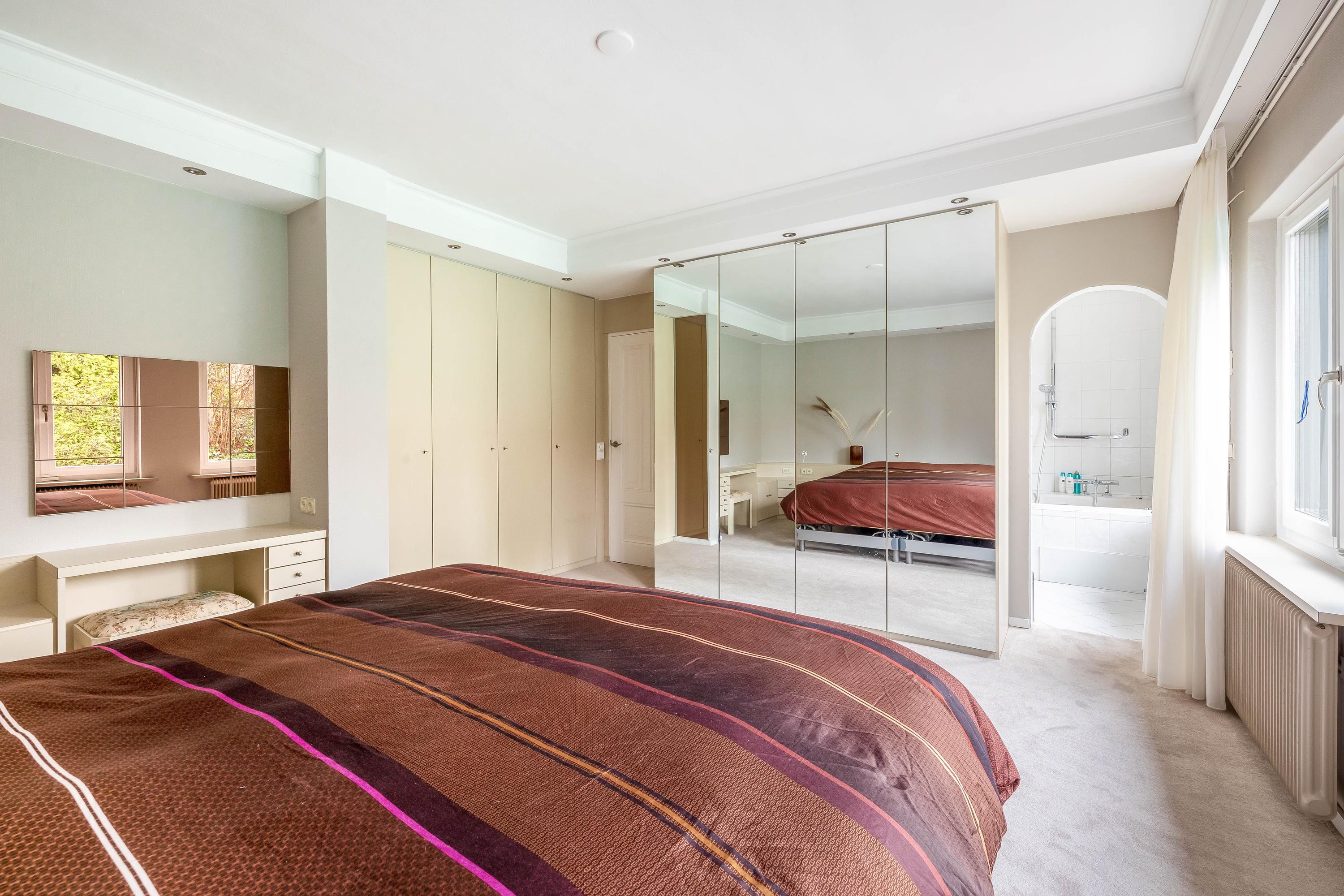 The large bedroom (approx. 21 m²) has a built-in wardrobe wall and provides access to the en-suite bathroom. The bathroom (approx. 5 m²) is fitted with a bathtub with shower and a double washbasin unit.