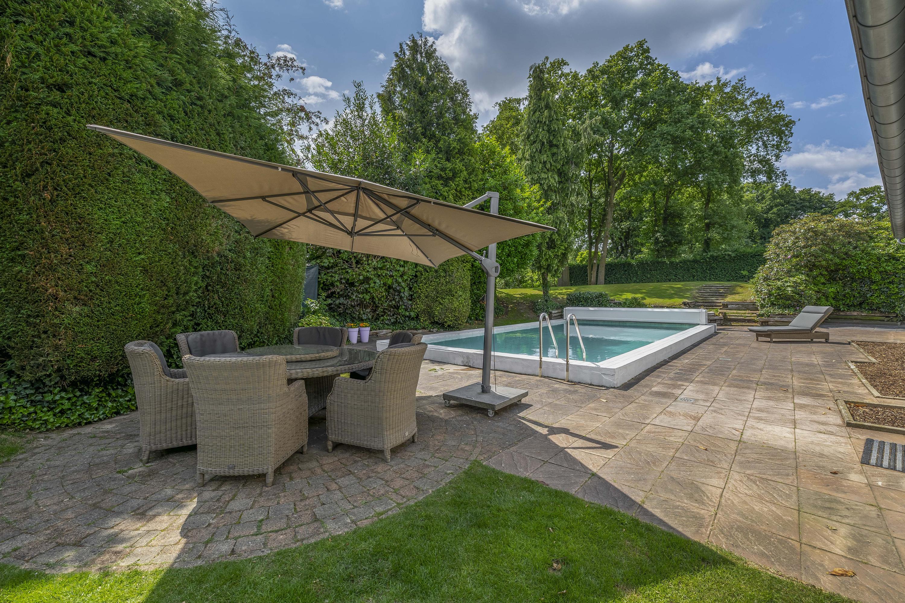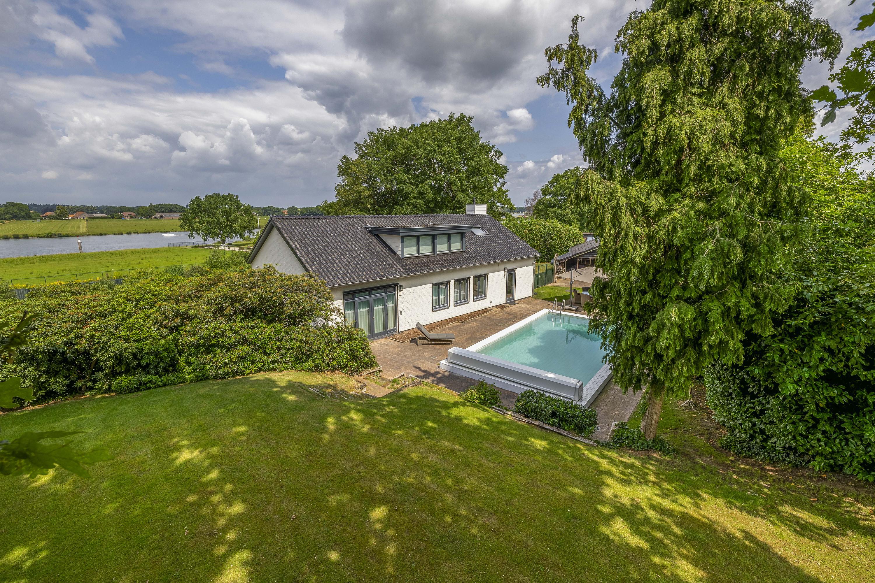 The garden surrounds the entire property. On the left side, a terrace offers a beautiful view of the River Maas. The garden is lush and green. The swimming pool measures approximately 10 x 5 meters. The private driveway provides parking space for multiple cars.
