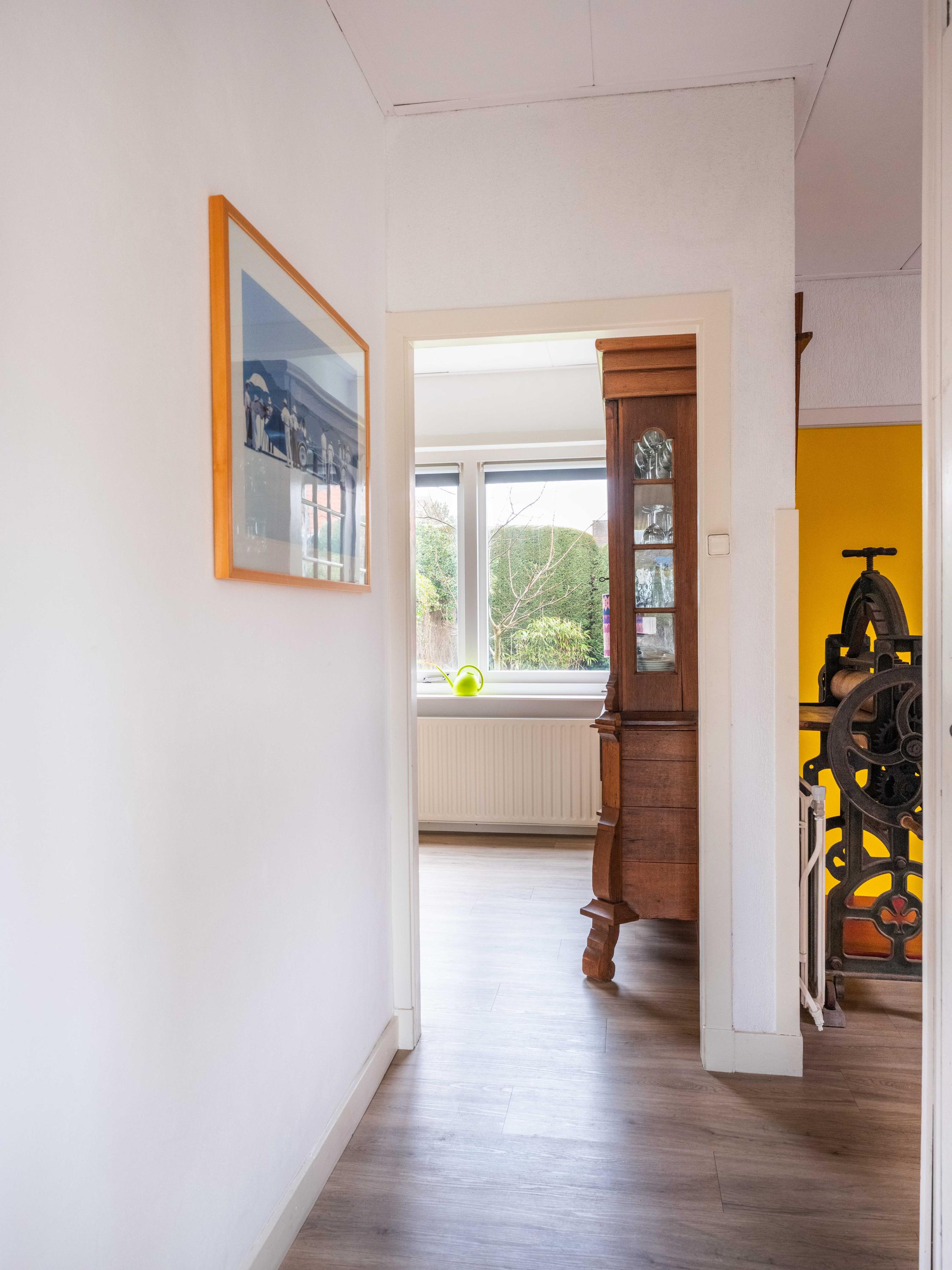 Upon entering, you enter the spacious hall, where the meter cupboard, toilet and staircase to the floors are located. Under the stairs is a spacious pantry. From the hall, a door leads to the bright and spacious living room, which offers a nice view of the greenery opposite. Another door gives access to the dining room and the kitchen, which is equipped with some built-in appliances. From the kitchen, a door leads to the garden.