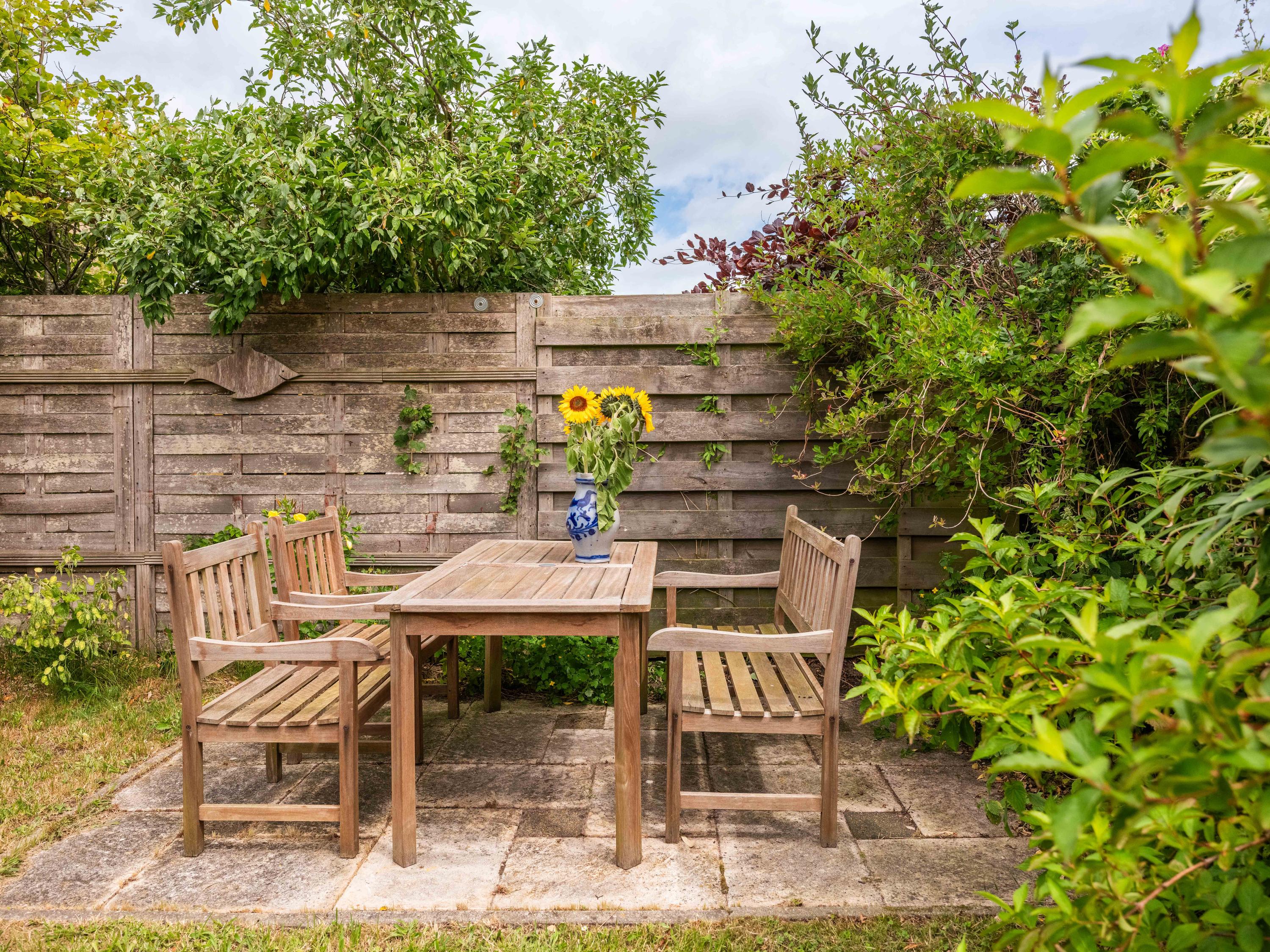 The house is surrounded by a green garden that offers plenty of privacy thanks to the recently installed fence. Due to its location around the house, there is always a sunny or shady spot to enjoy the peace and quiet and the outdoors.