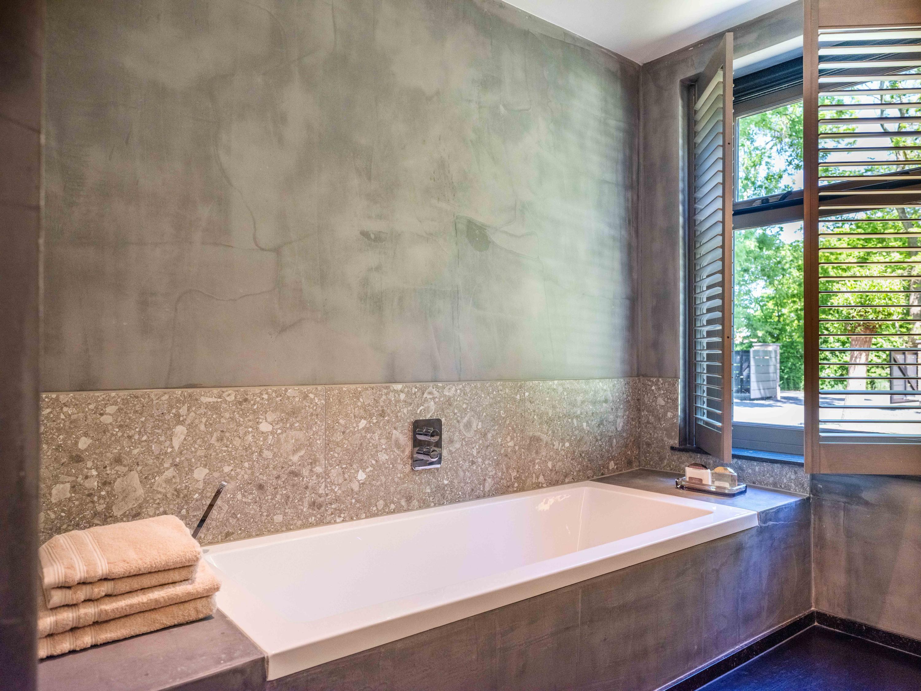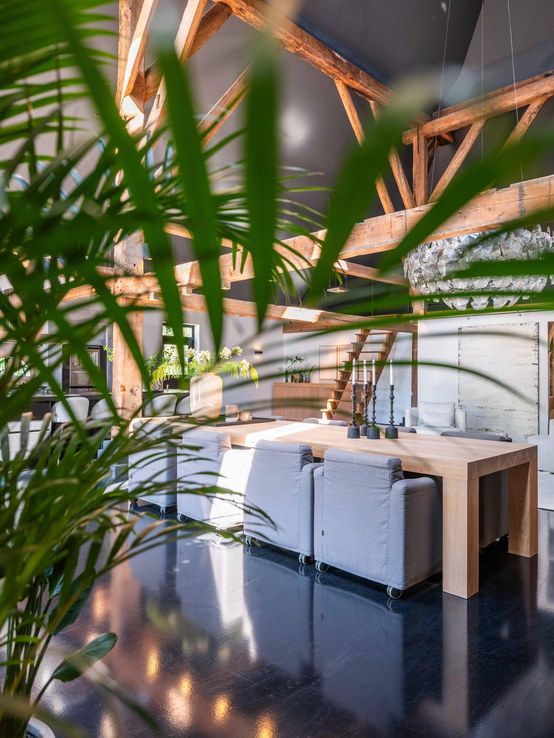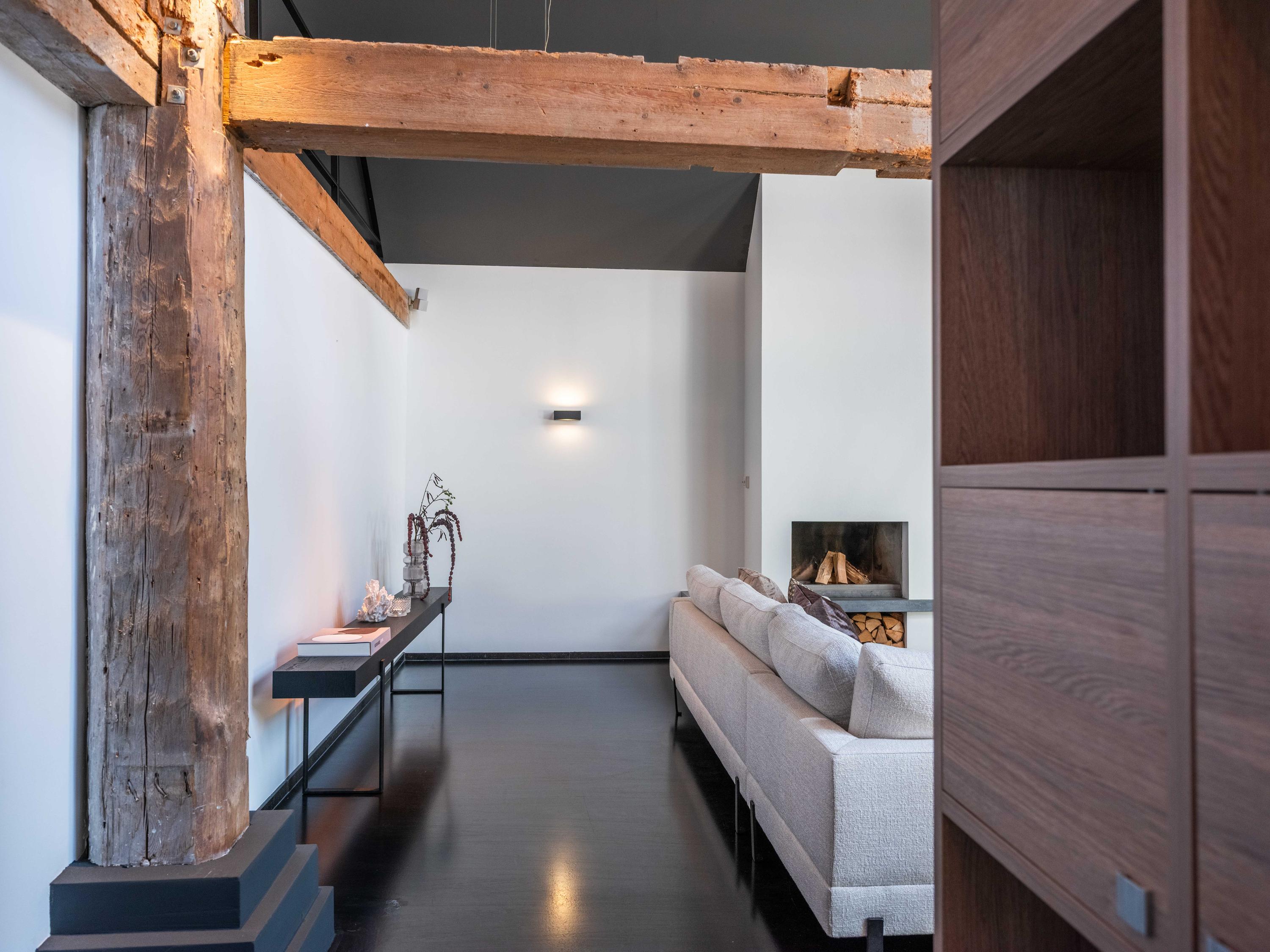 The living room where the ceiling, which reaches to the ridge, immediately catches the eye. The contrast of colours in the house enhance its sturdy character. This very spacious living room has a fireplace and French doors to the garden. The modern open kitchen is equipped with various built-in appliances, including a Boretti 8-burner cooker, an American fridge with coffee maker and plate warmer, oven, built-in fridge and dishwasher.