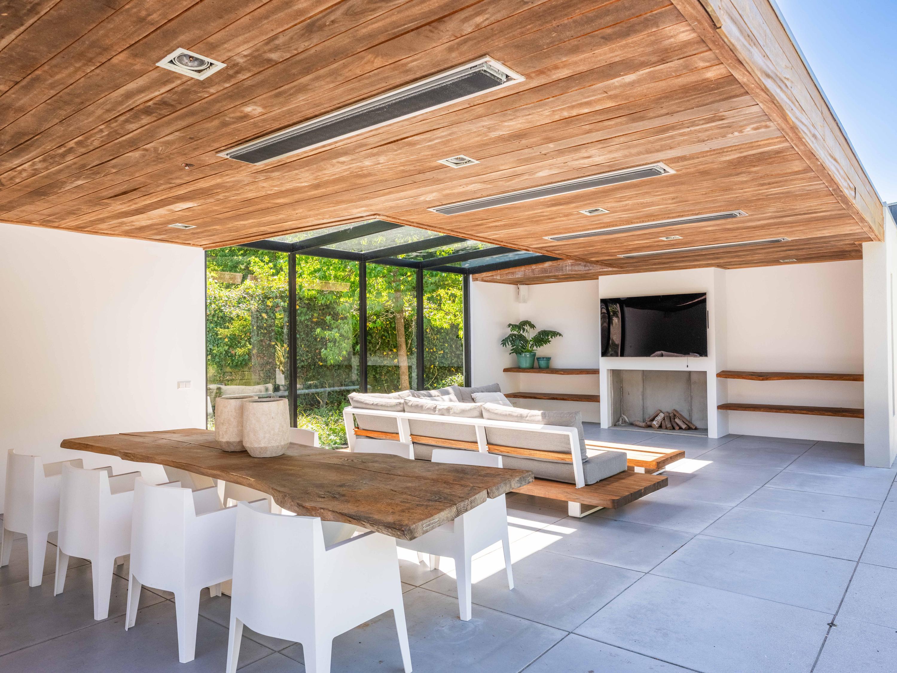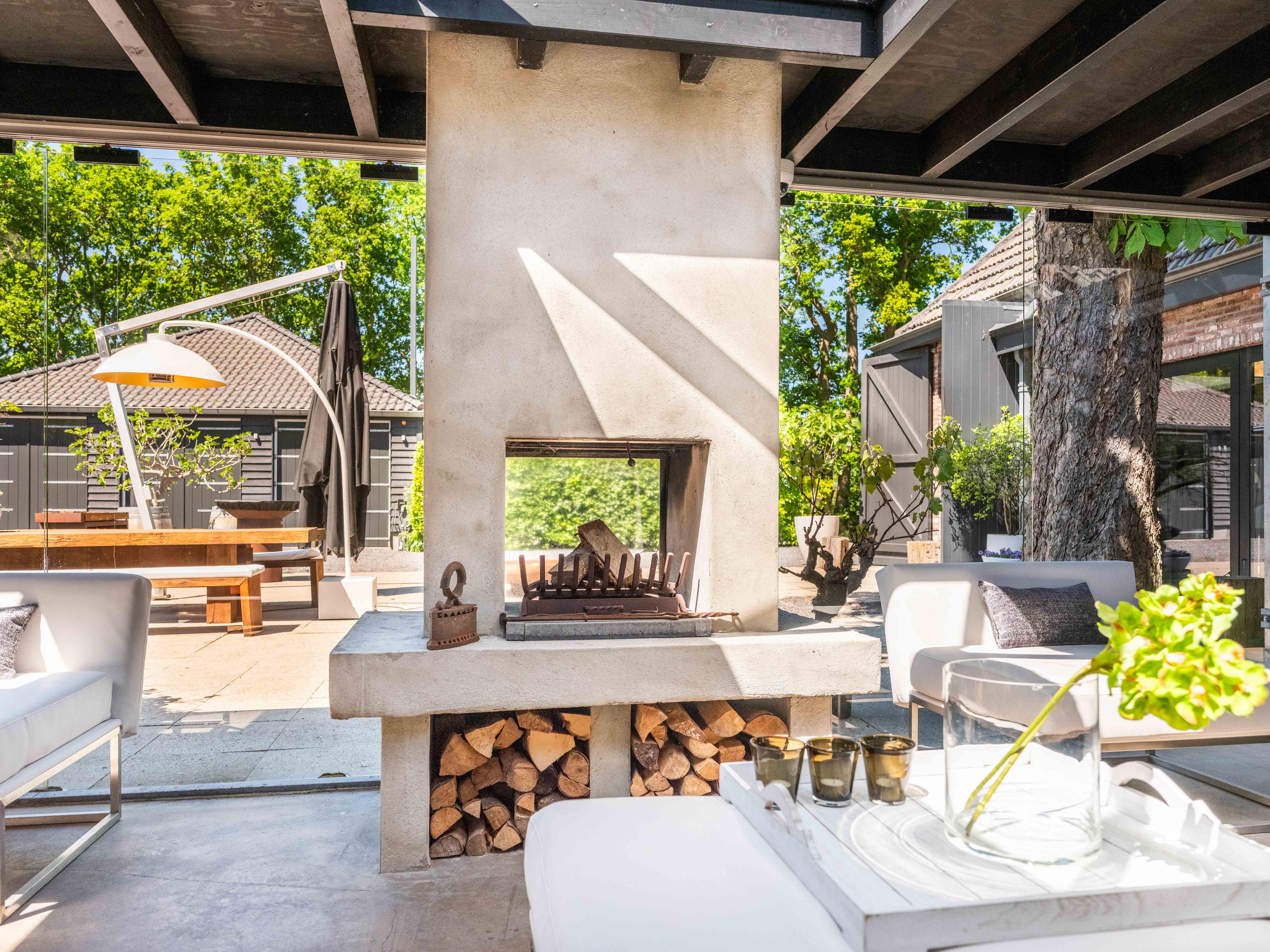 From the living room you have access to the conservatory, which is equipped with a fireplace, a pantry and a large lounge area. From the conservatory, you have beautiful views over the spaciously landscaped garden.