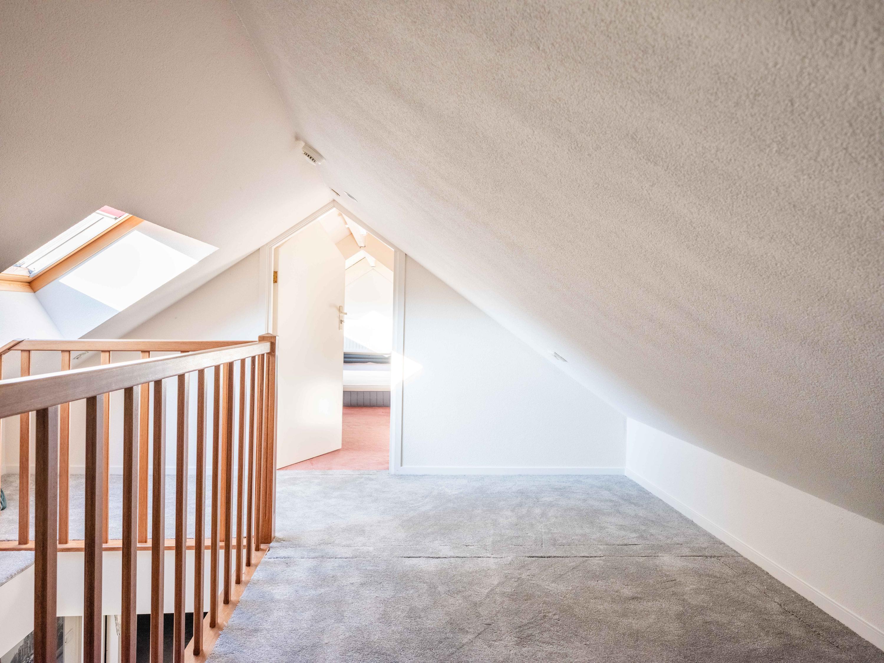 A fixed staircase on the landing leads to the attic floor which is divided into a bedroom area and storage room.