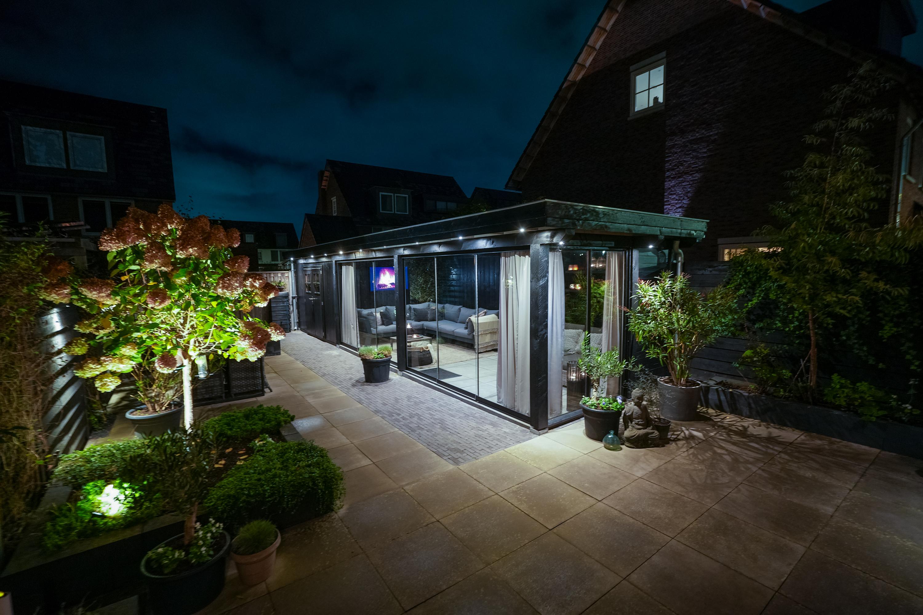 A sunny garden with an attractive covered terrace with glass enclosure, fitted with electricity and internet. The space is fully insulated and equipped with skirting heating, making it comfortable throughout the year. In addition, four solar panels contribute to an energy-efficient and sustainable home.